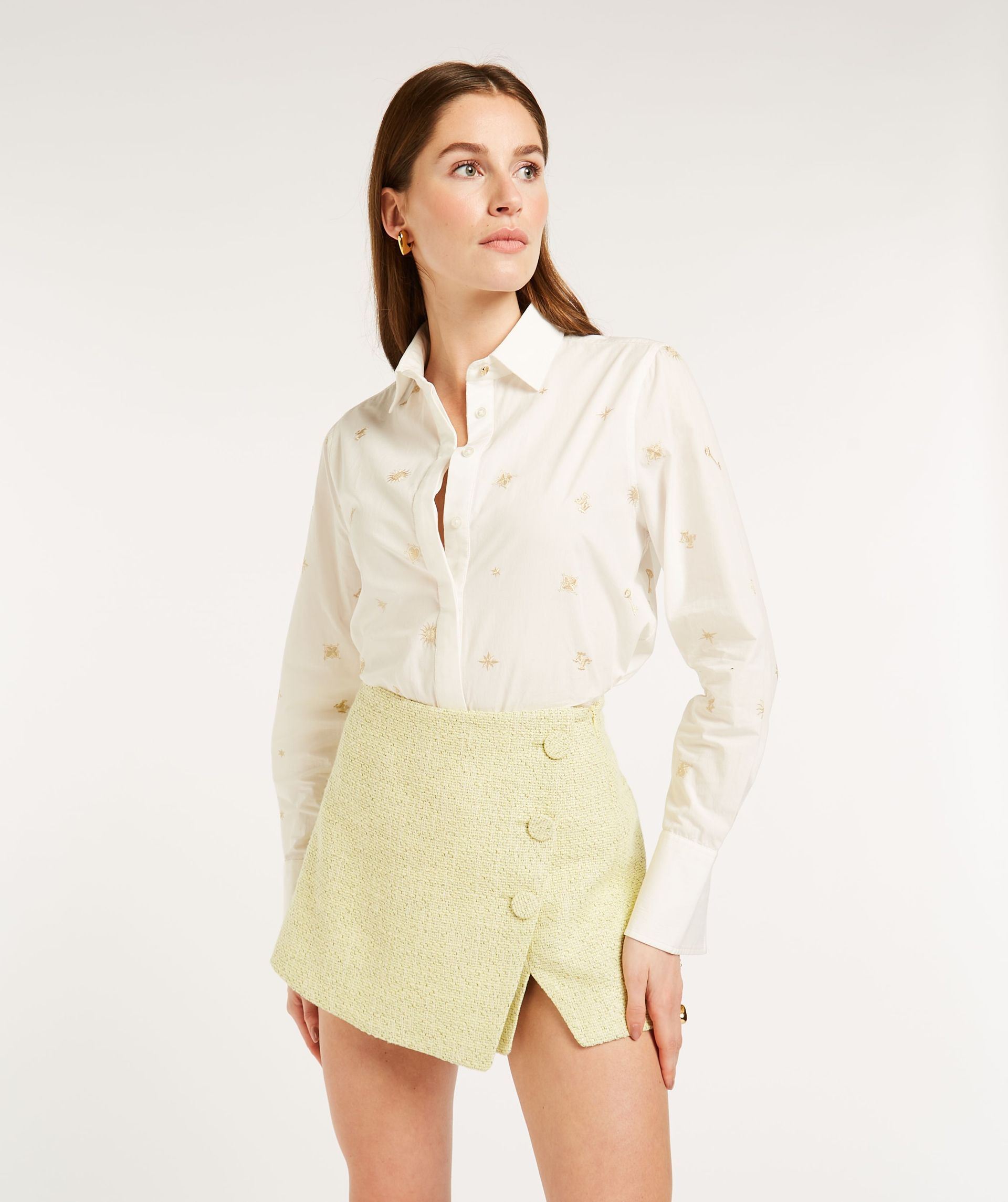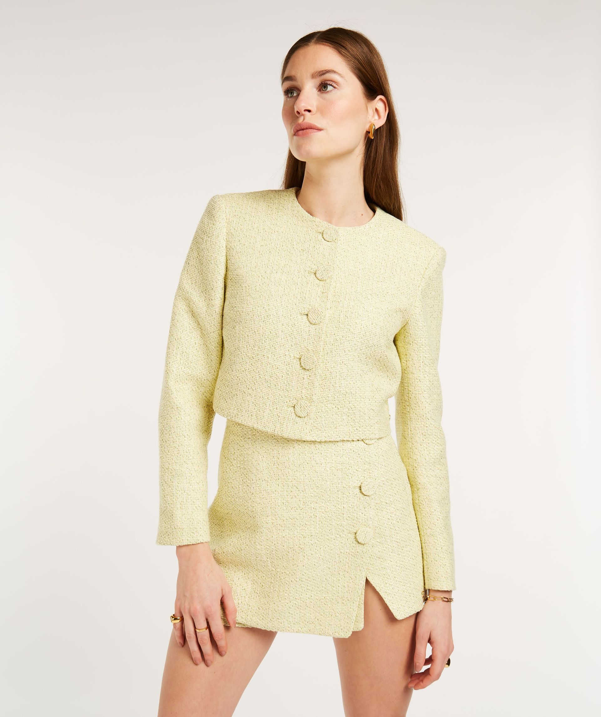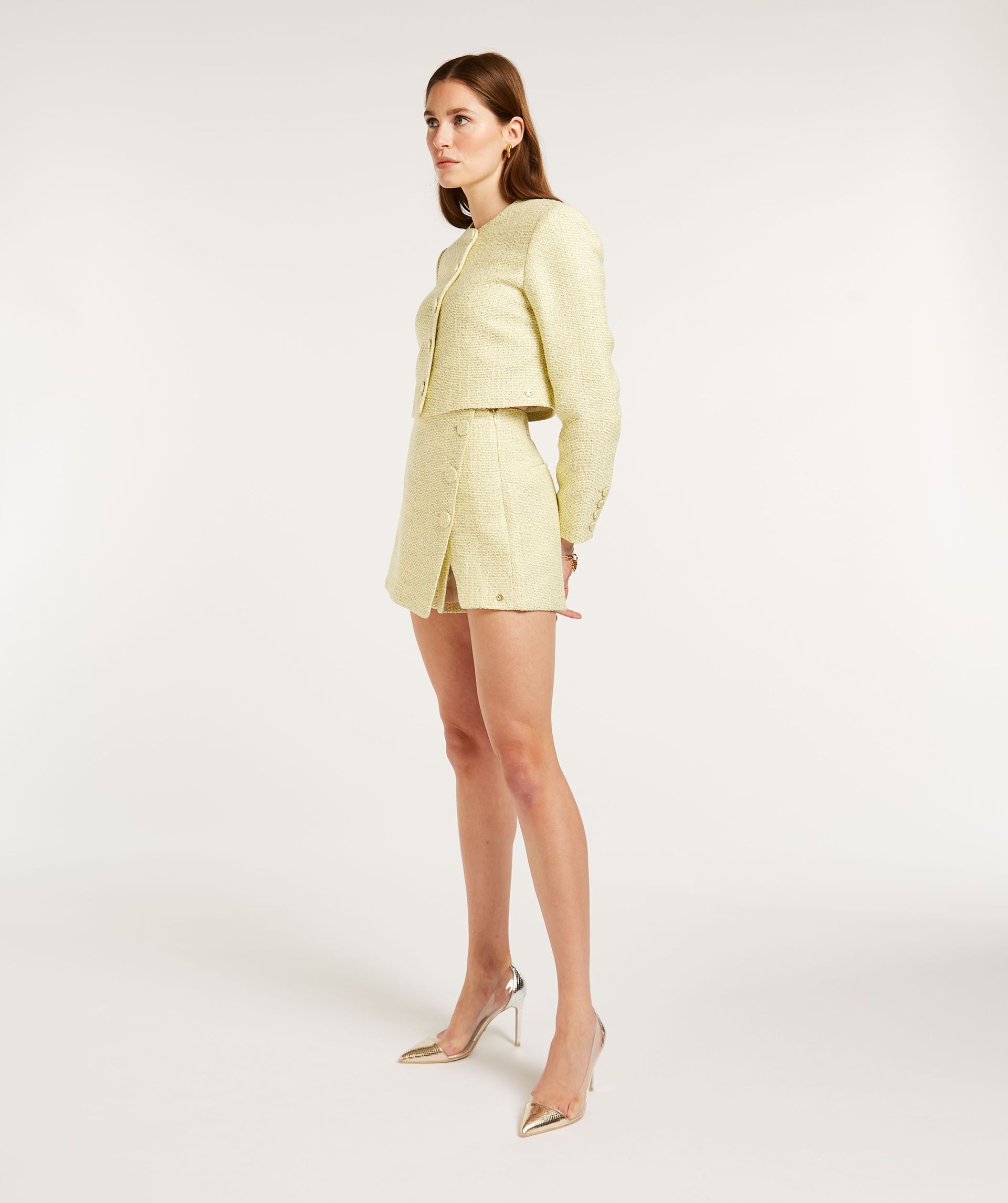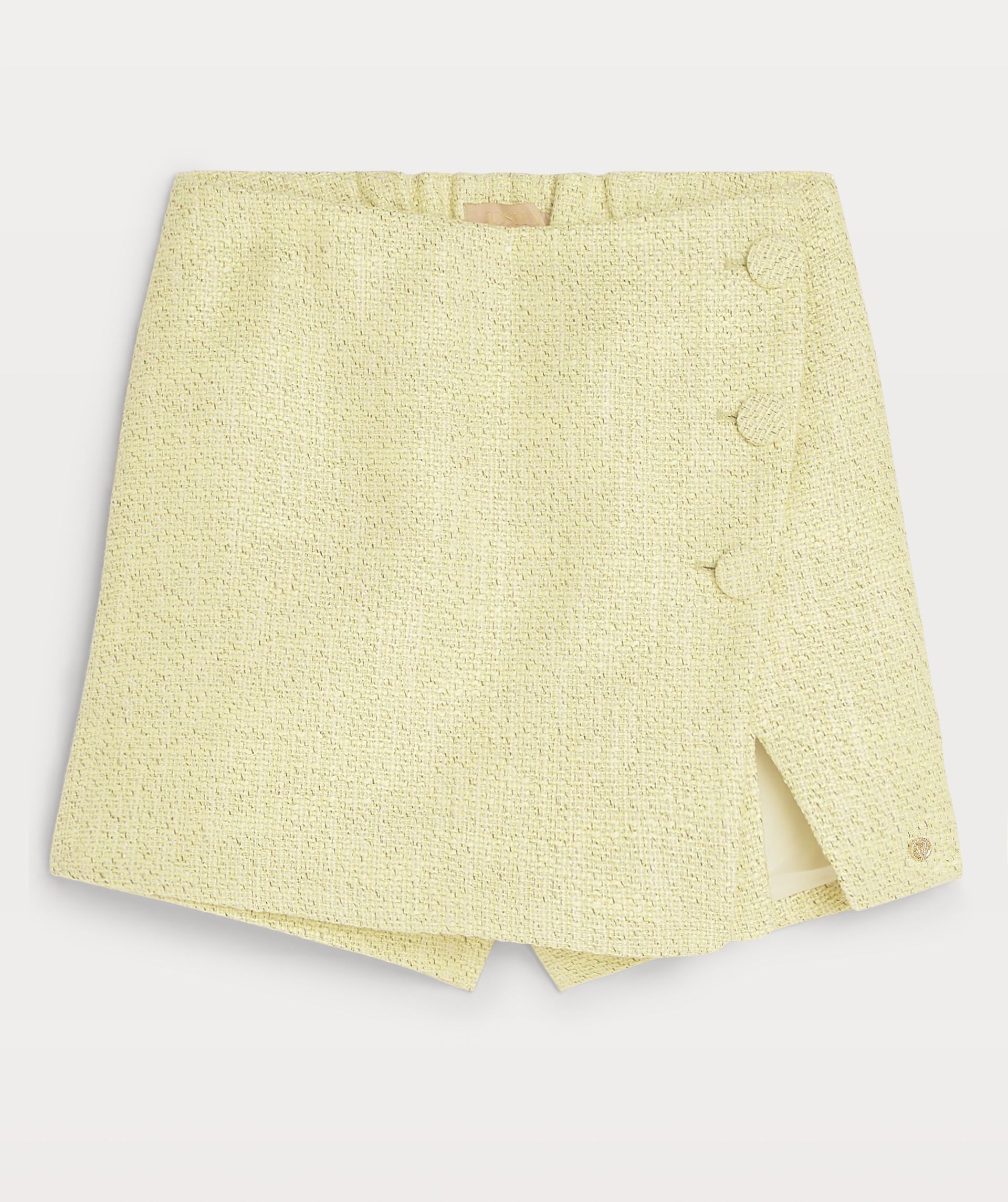 Procurando um conjunto de co-ordem? O skort JOSH V Lotti na cor Pistachio Gold Glitter faz parte de um terno completo e pode ser perfeitamente combinado com o blazer recortado Remi correspondente. A saia da calça cai alto na cintura e o elástico é aplicado na parte de trás da cintura para um ajuste extra. O curto é feito de bouclé com lurex dourado. Combine o skort com nossos acessórios de cor dourada para um visual extra chiqu