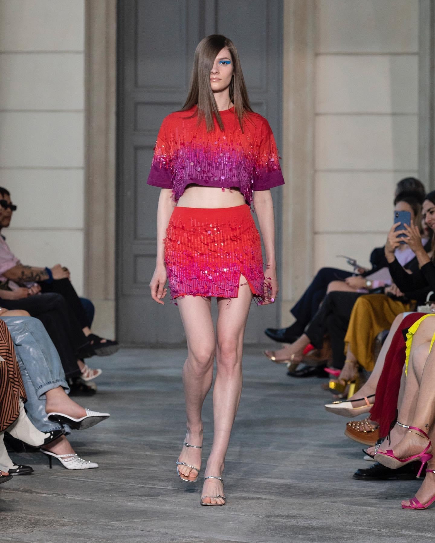 Saia Curta com uma pequena abertura na perna, bordada em Degradê nas cores pink e vermelho trazendo uma combinação perfeita das cores.