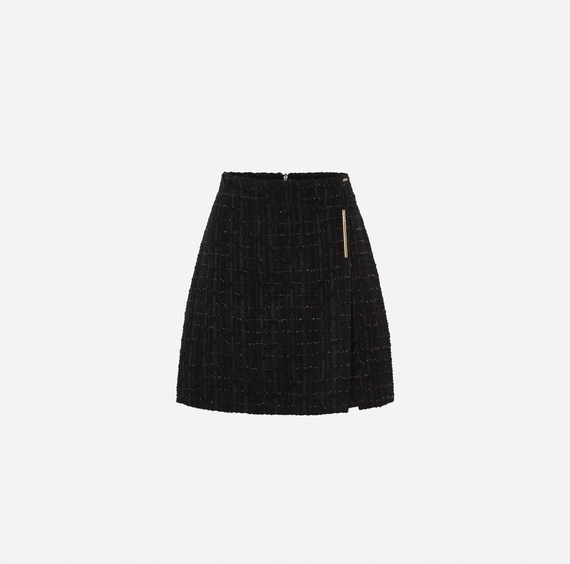 Clássica e sofisticada, esta saia curta em tweed preto é um essencial elegante que eleva qualquer look. O tecido com fios metálicos confere-lhe um toque subtil de luminosidade, enquanto o corte tipo envelope e o fecho dourado lateral acrescentam modernidade e charme. Perfeita para criar coordenados refinados, do escritório a um jantar especial.
