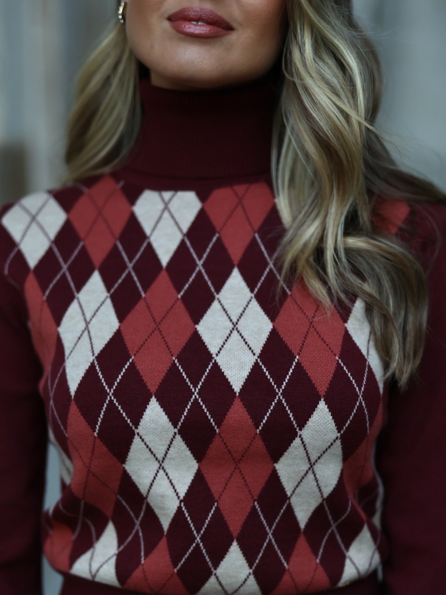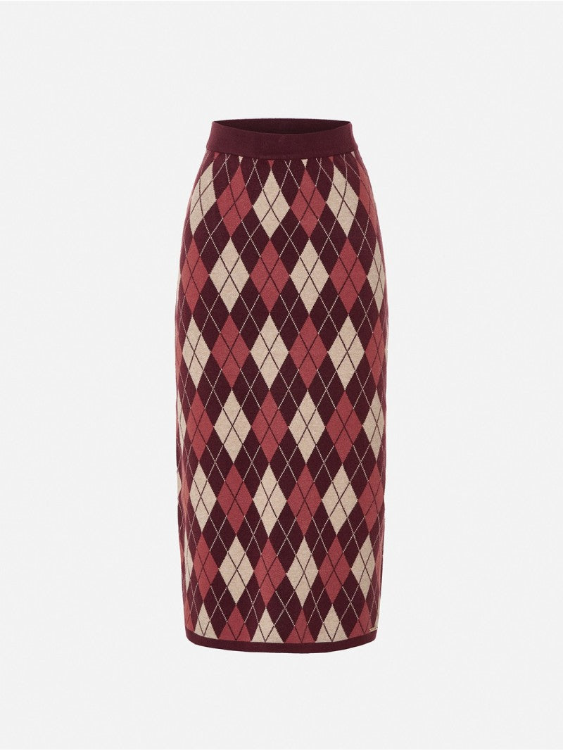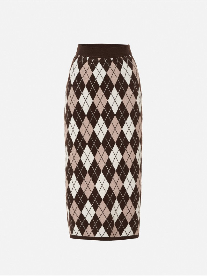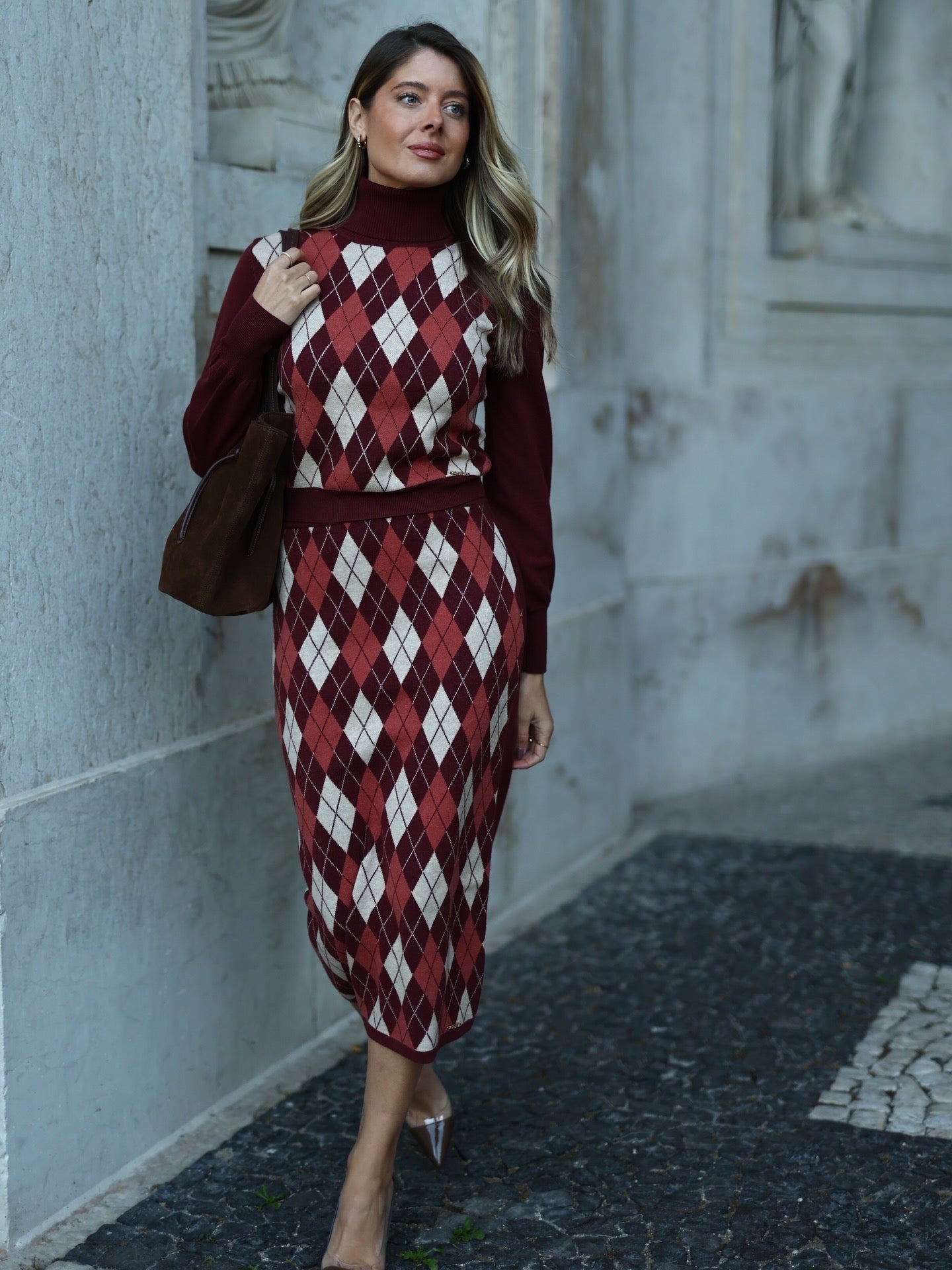Saia de malha Scripta com padrão clássico de losangos, uma peça elegante e versátil que combina conforto com estilo contemporâneo. O tecido macio proporciona um ajuste confortável e estruturado, enquanto o design gráfico em tons contrastantes acrescenta um toque sofisticado ao look.