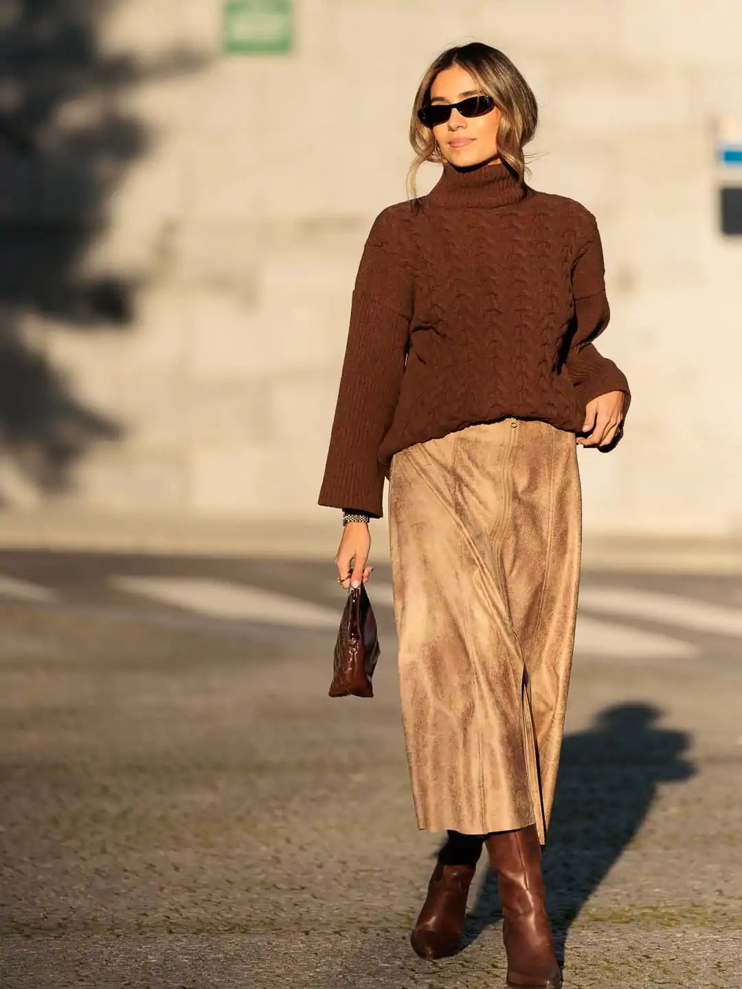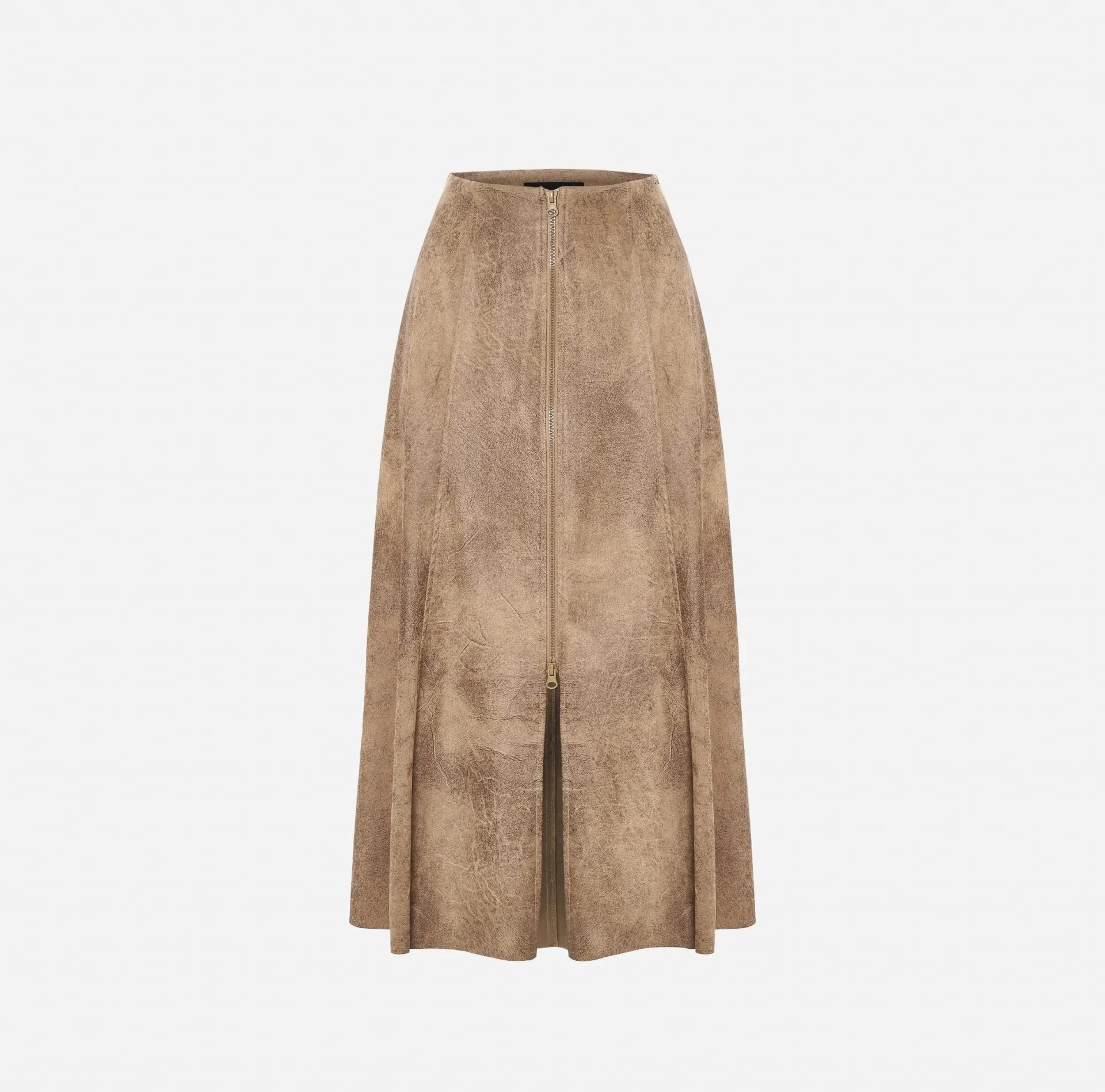 Saia midi em efeito camurça com textura suave e toque acetinado. Possui corte reto com leve evasê, fenda frontal discreta que garante conforto ao andar e fecho posterior invisível para um acabamento limpo e elegante. A tonalidade camel-bege cria um visual sofisticado e fácil de combinar com peças em tons terrosos ou neutros.