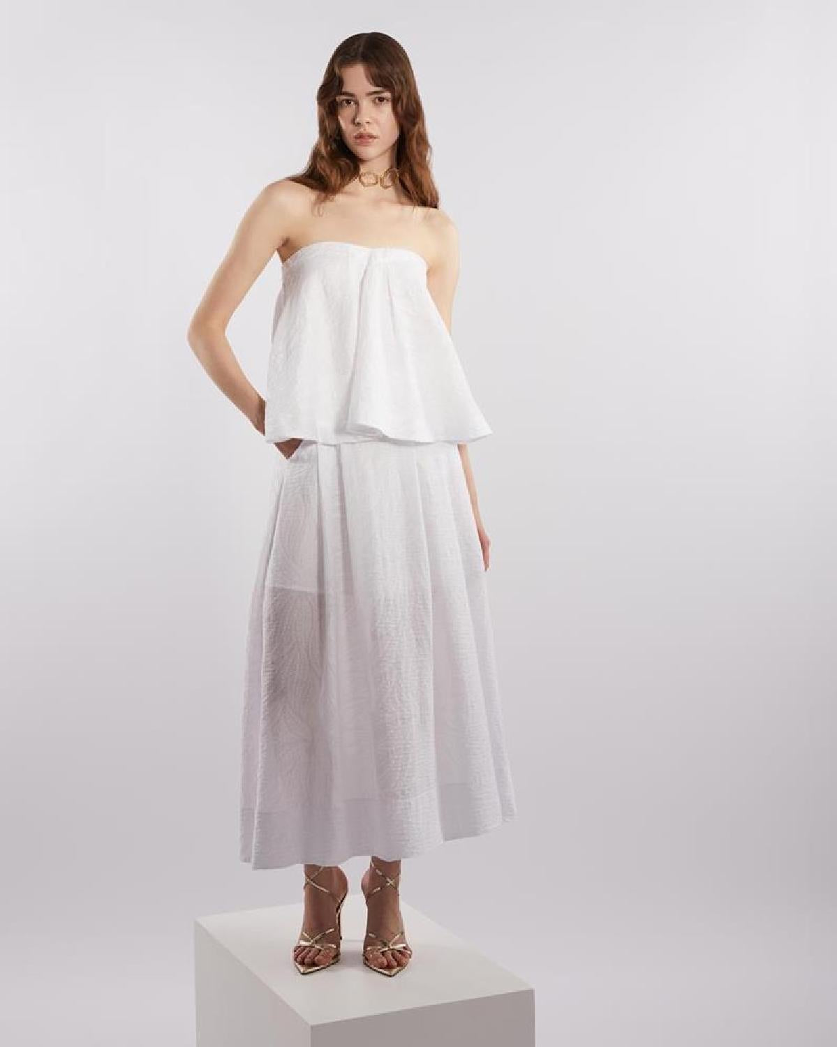 Elegante e leve, esta saia midi em tecido branco texturizado é perfeita para composições minimalistas e sofisticadas. Com caimento fluido e cintura marcada, ela oferece movimento e feminilidade sem abrir mão do conforto.