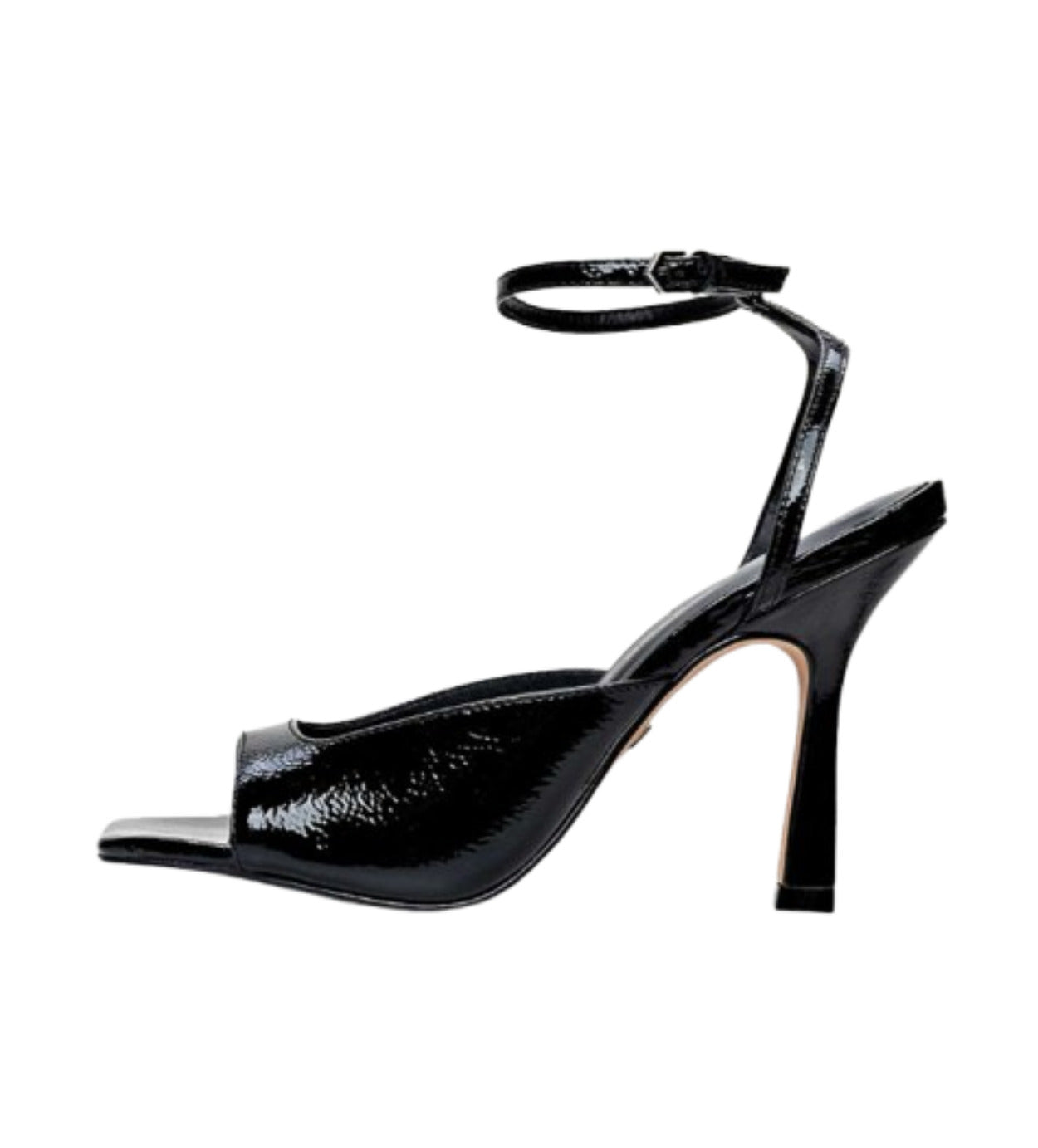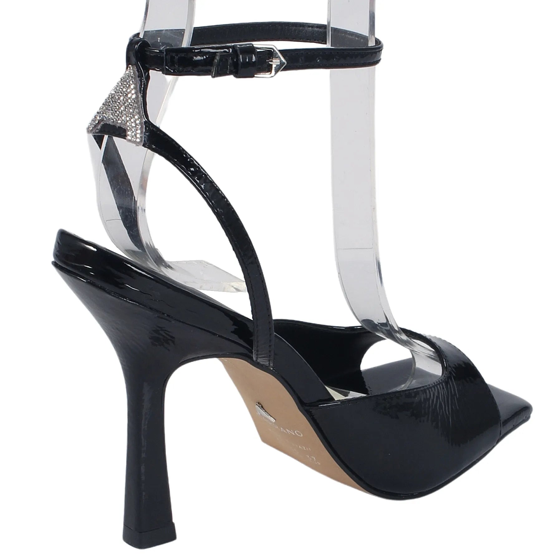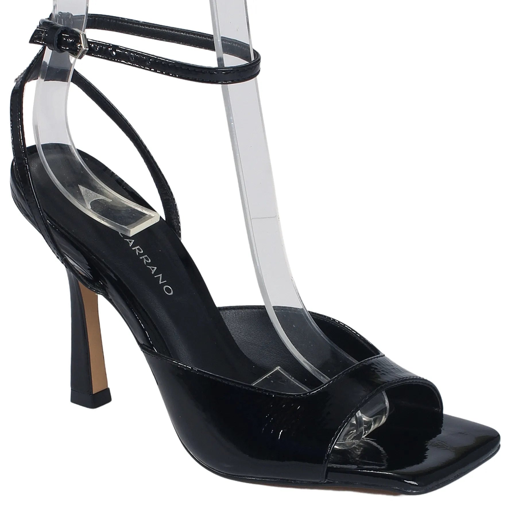 Sandália feminina Carrano confeccionada em couro verniz show. Modelo com uma tira frontal larga, tira no calcanhar e tira no tornozelo com fechamento por fivela com 5 níveis de ajuste. Salto fino forrado com 11 cm de altura, solado em poliuretano antiderrapante e forro em material sintético.