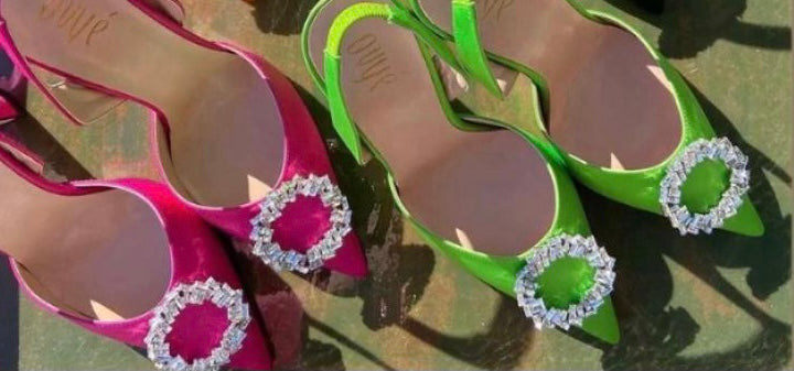 Chaussures en éco-cuir doublées de satin, avec décoration en strass.