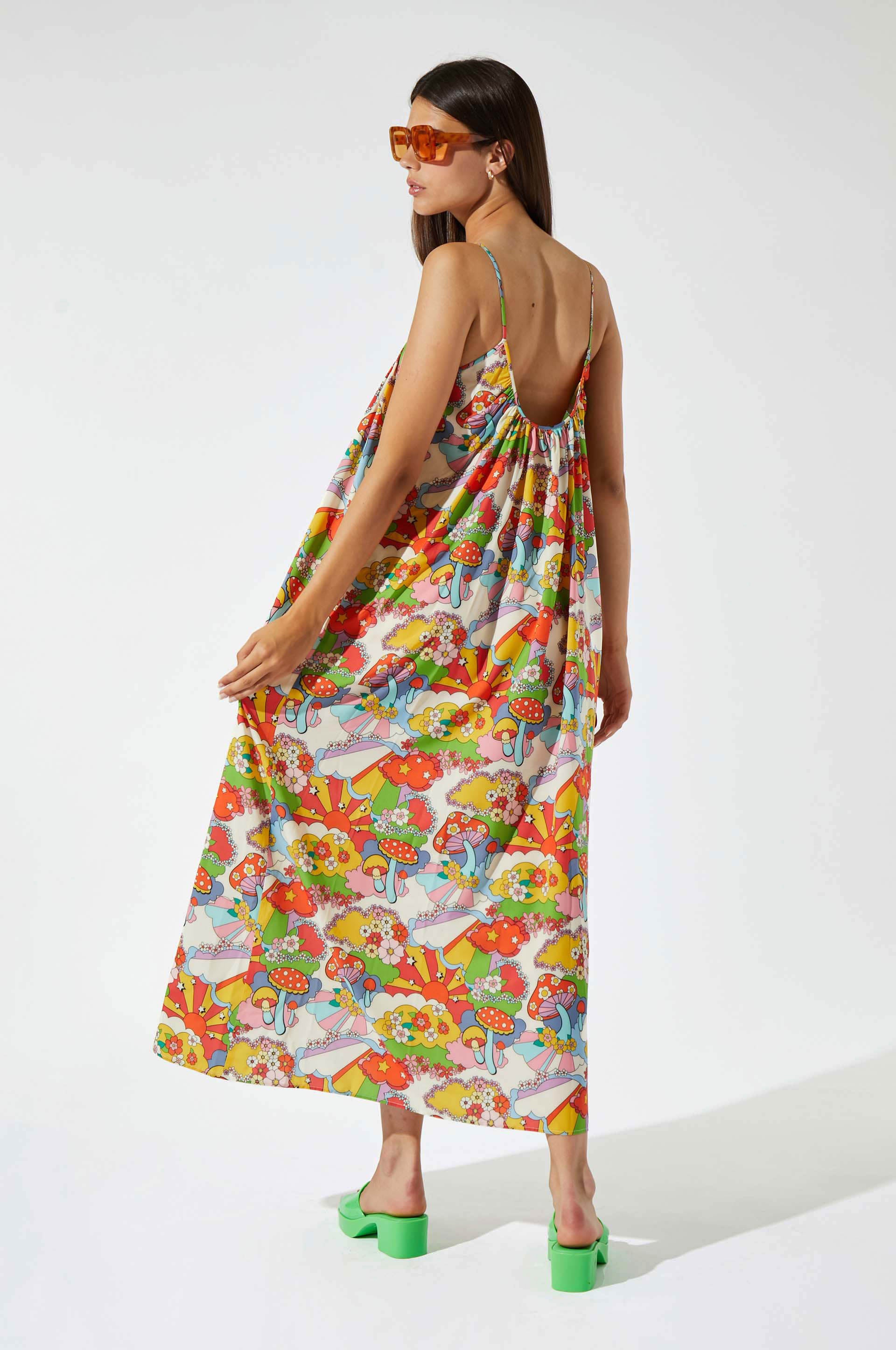 Robe longue à bretelles spaghetti. Imprimé vintage partout. Dos décolleté. Deux poches latérales.