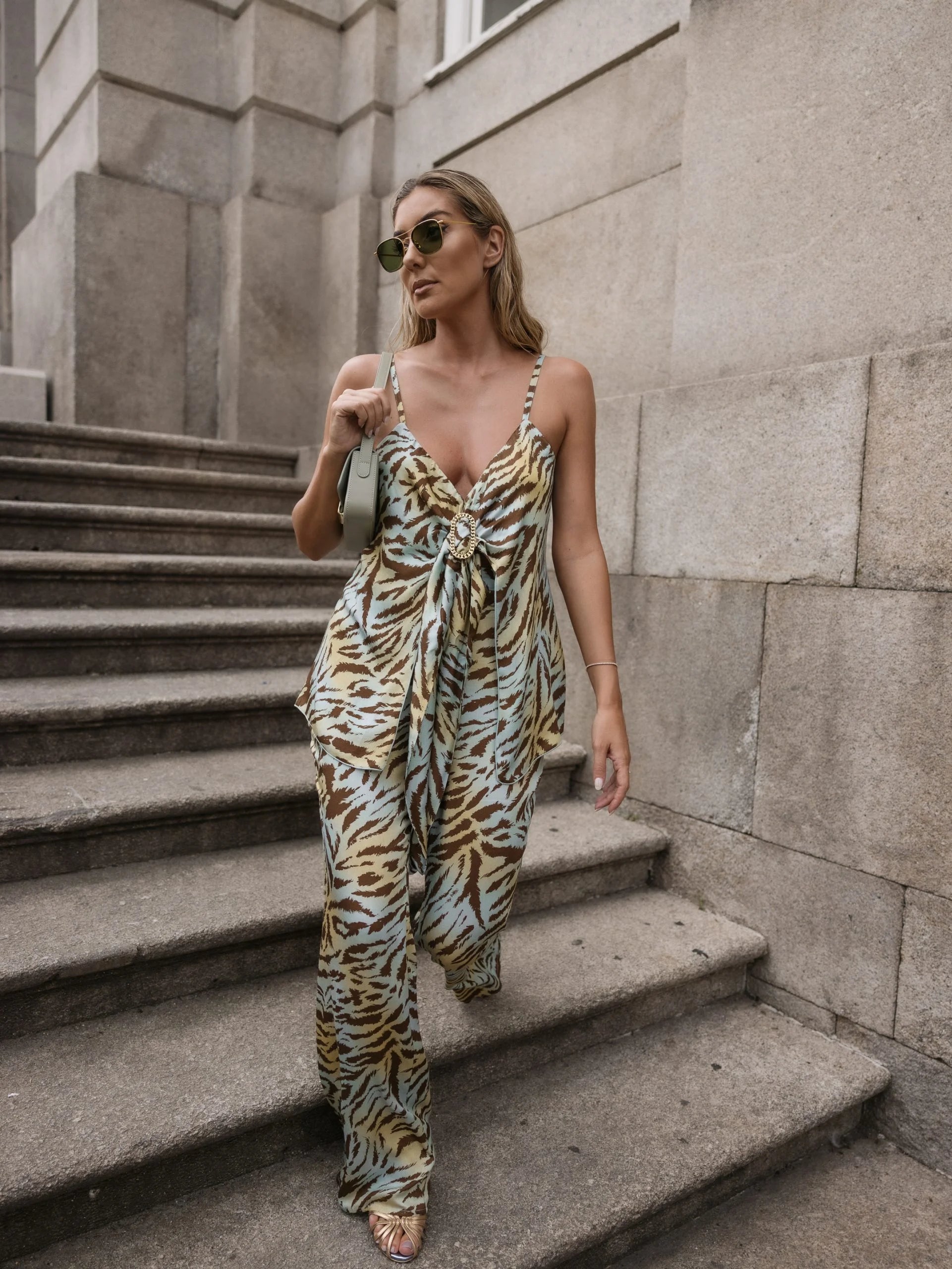 Top imprimé avec détail de boucle métallique dorée au centre de l'encolure et de l'ouverture.