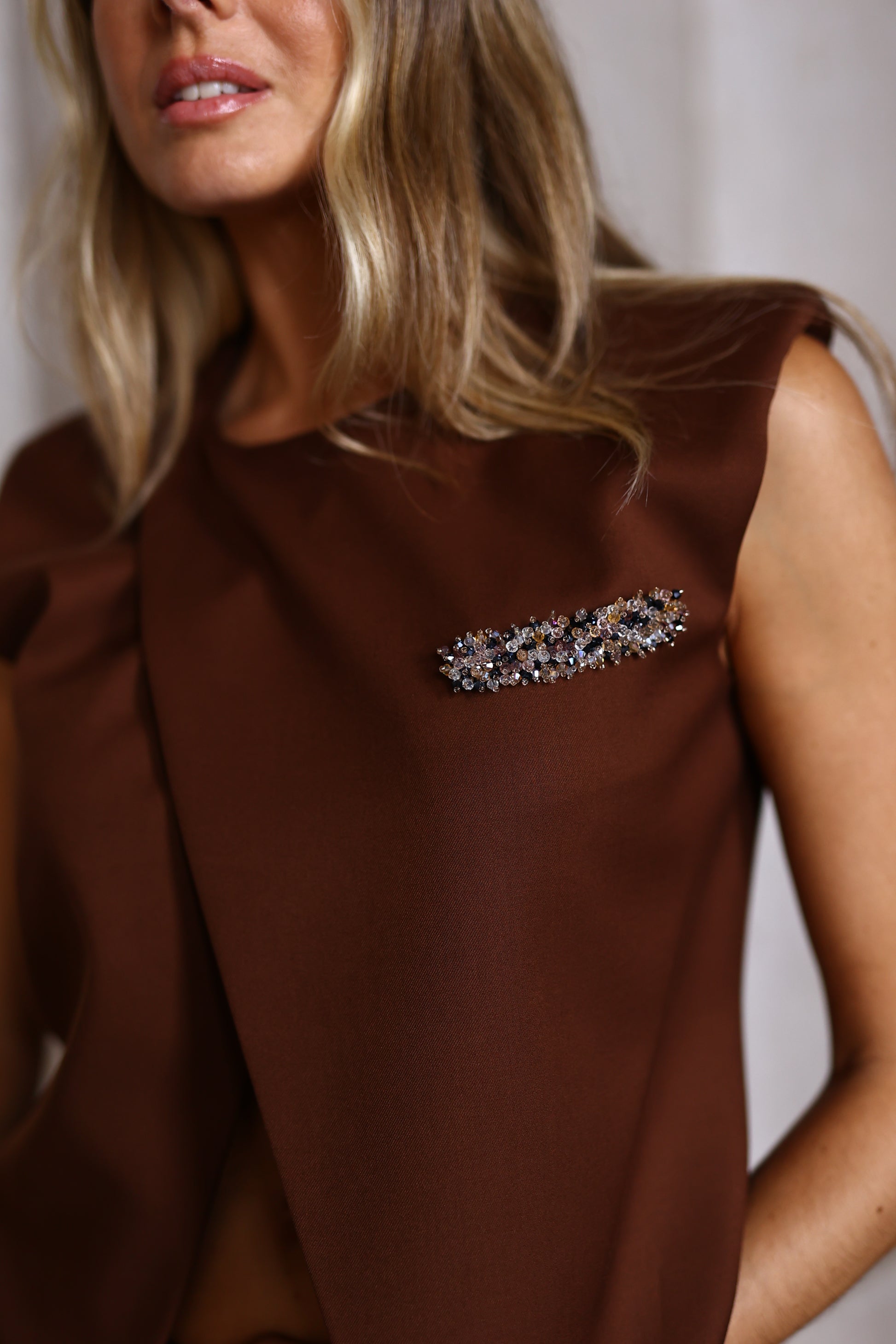 Confeccionado em tecido estruturado de alta qualidade, destaca-se pela abertura frontal enviesada e pelo bordado de cristais e pedras ton-sur-ton, que acrescenta um toque de brilho discreto e refinado.