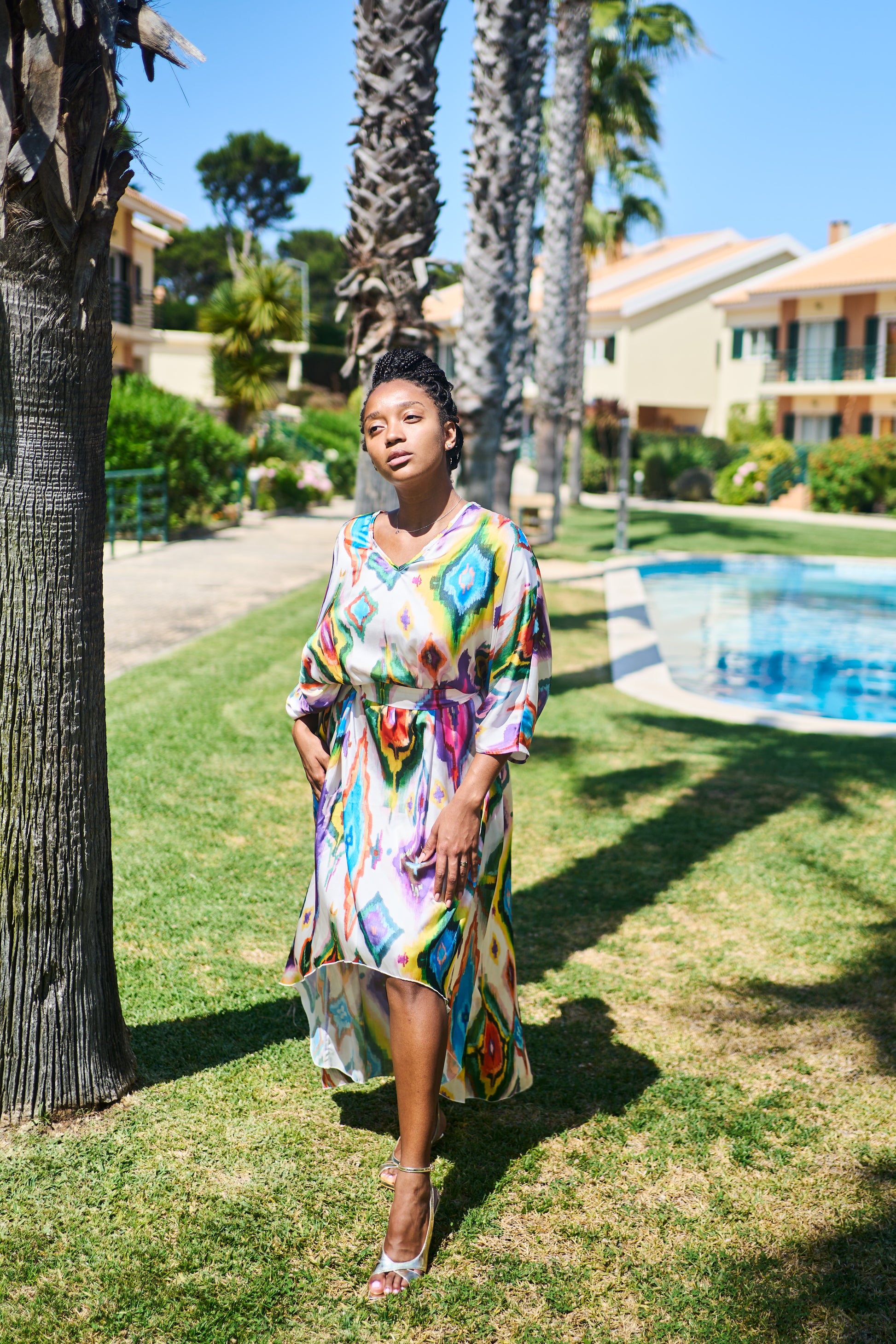 Tunique en tissu frais et fluide. se ferme avec une ceinture dans le même tissu.
