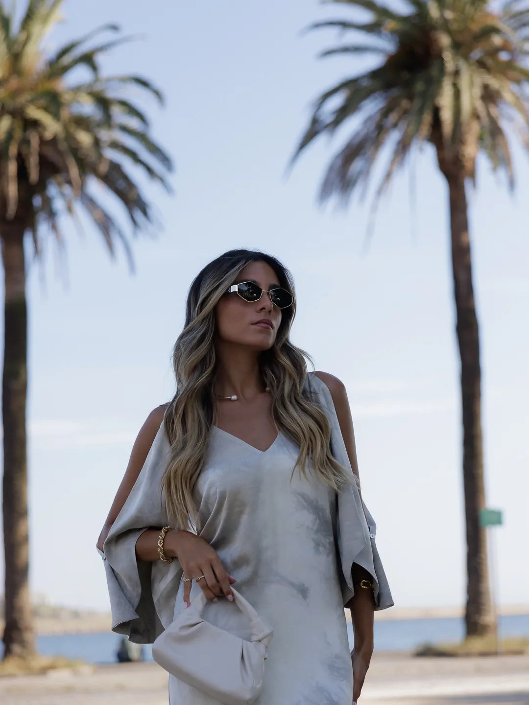 Vestido midi estampado com decote em V e pequeno detalhe de corrente nos ombros. Manga 3/4 solta com aberturas e pormenor de botão. Aperta na costa com fecho invisível. O fitting da peça é fluído.