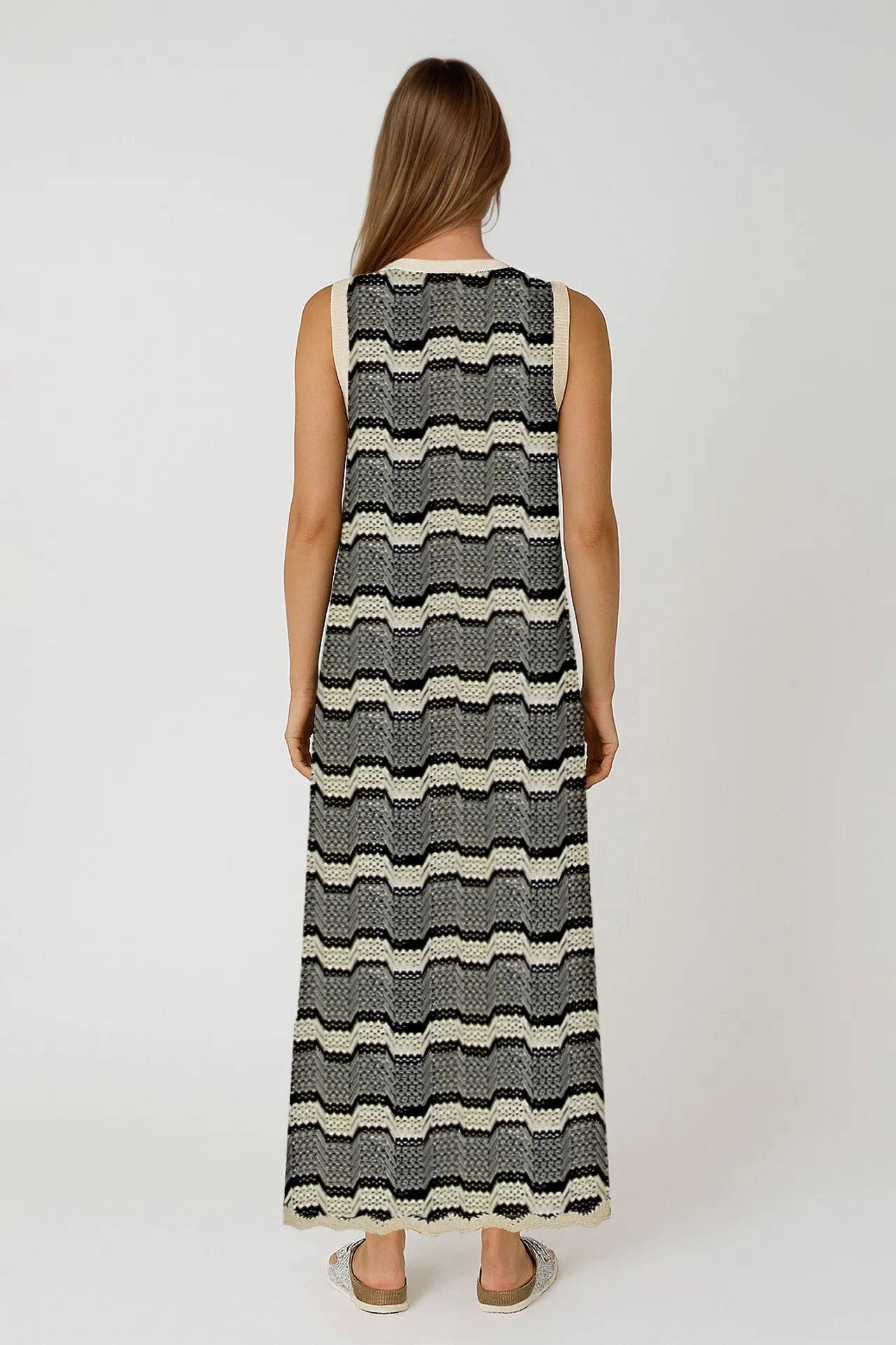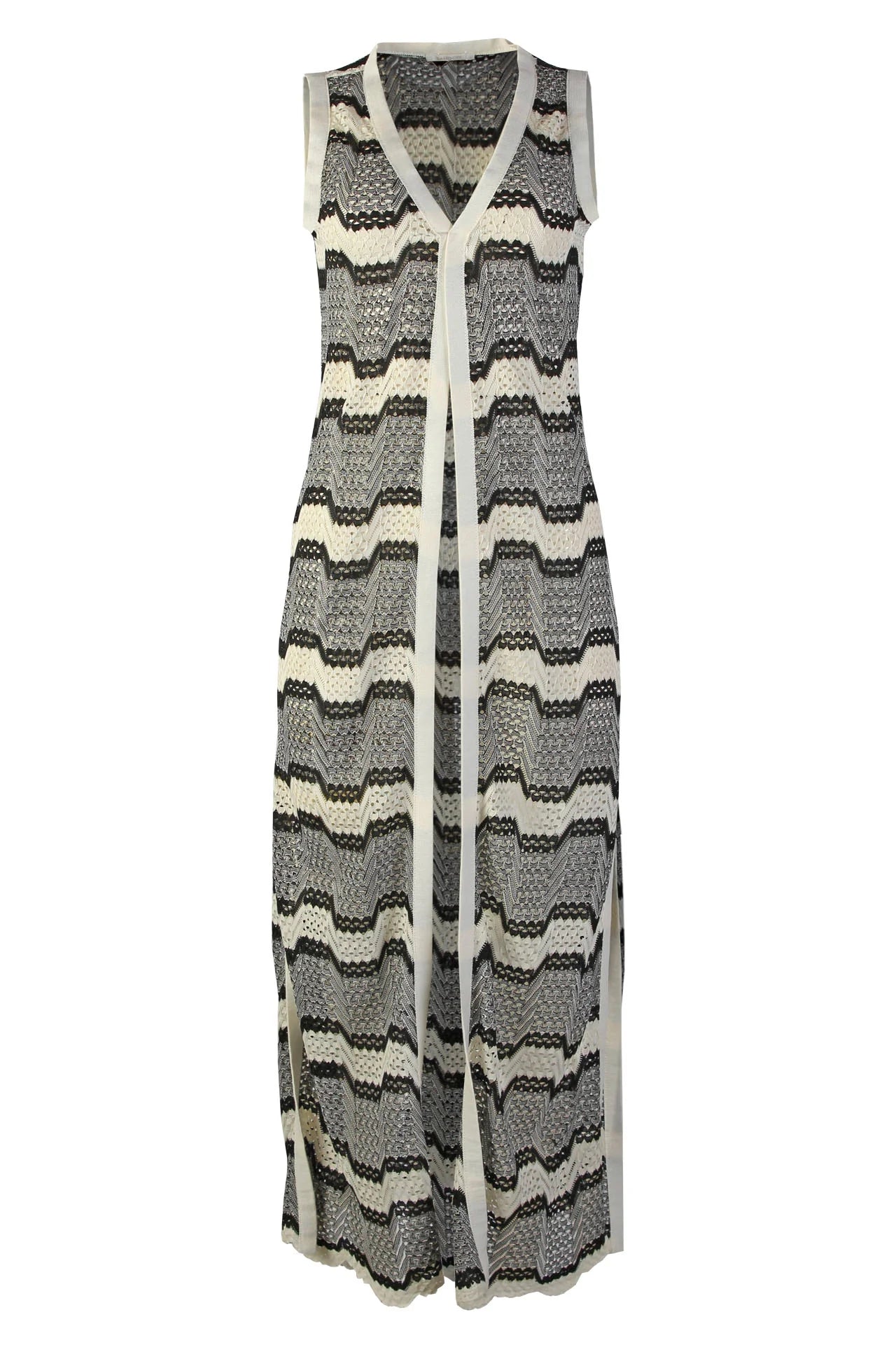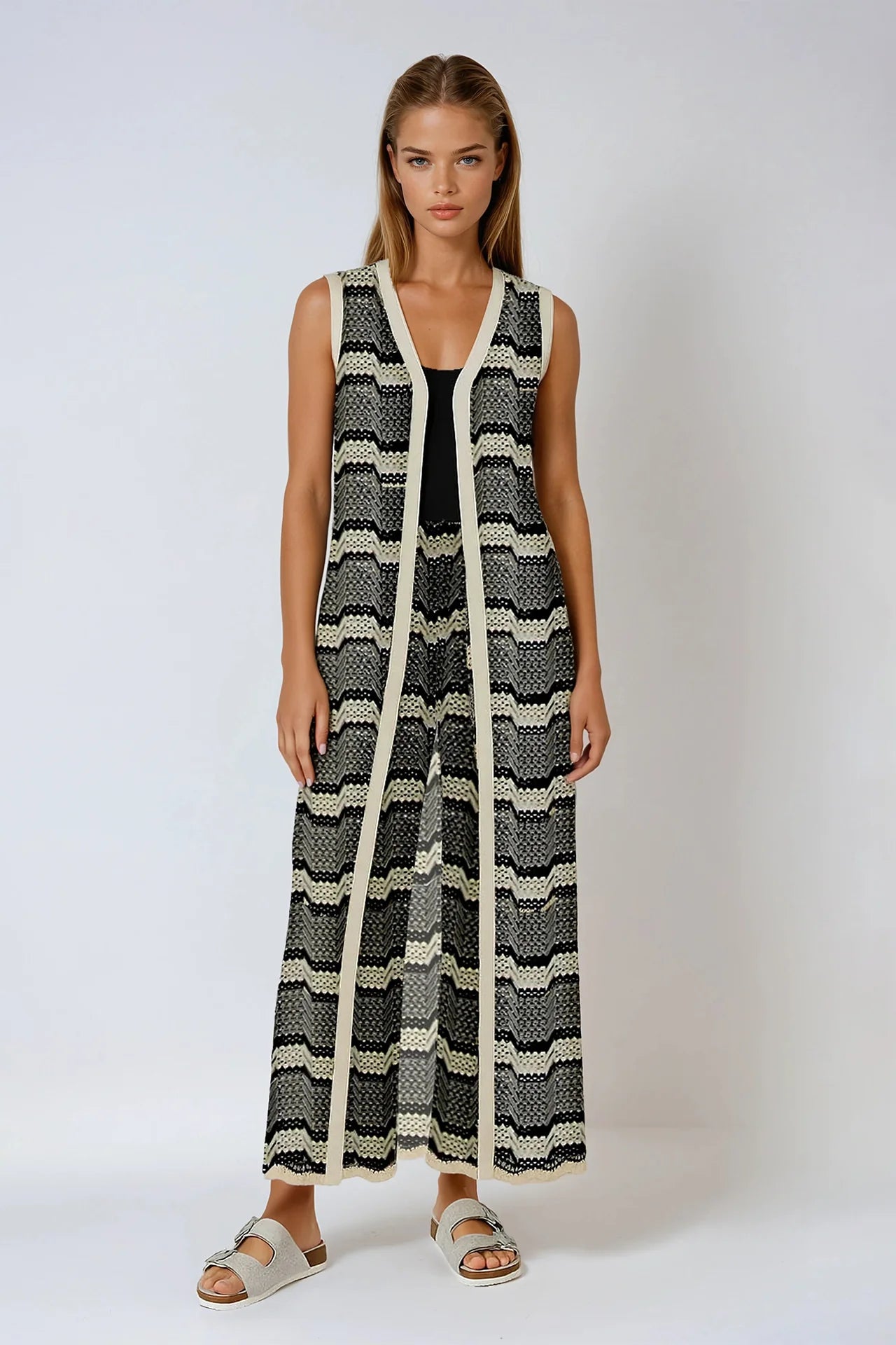 Colete comprido, de design aberto e sem fecho, com manga cava e corte fluido. A estrutura alongada valoriza a silhueta e acrescenta profundidade ao look. O padrão multicolor imprime dinamismo e personalidade, tornando esta peça um destaque imediato.