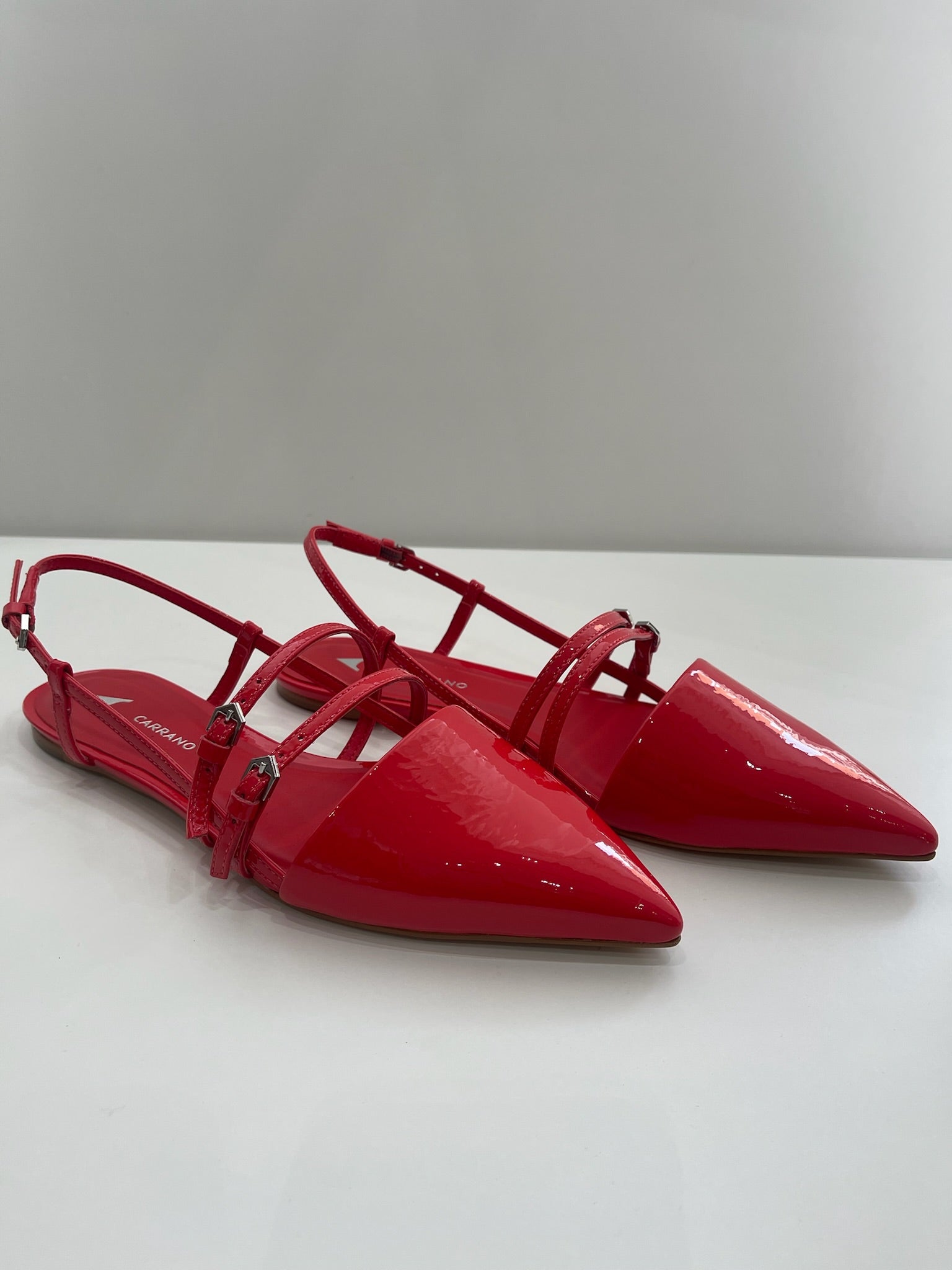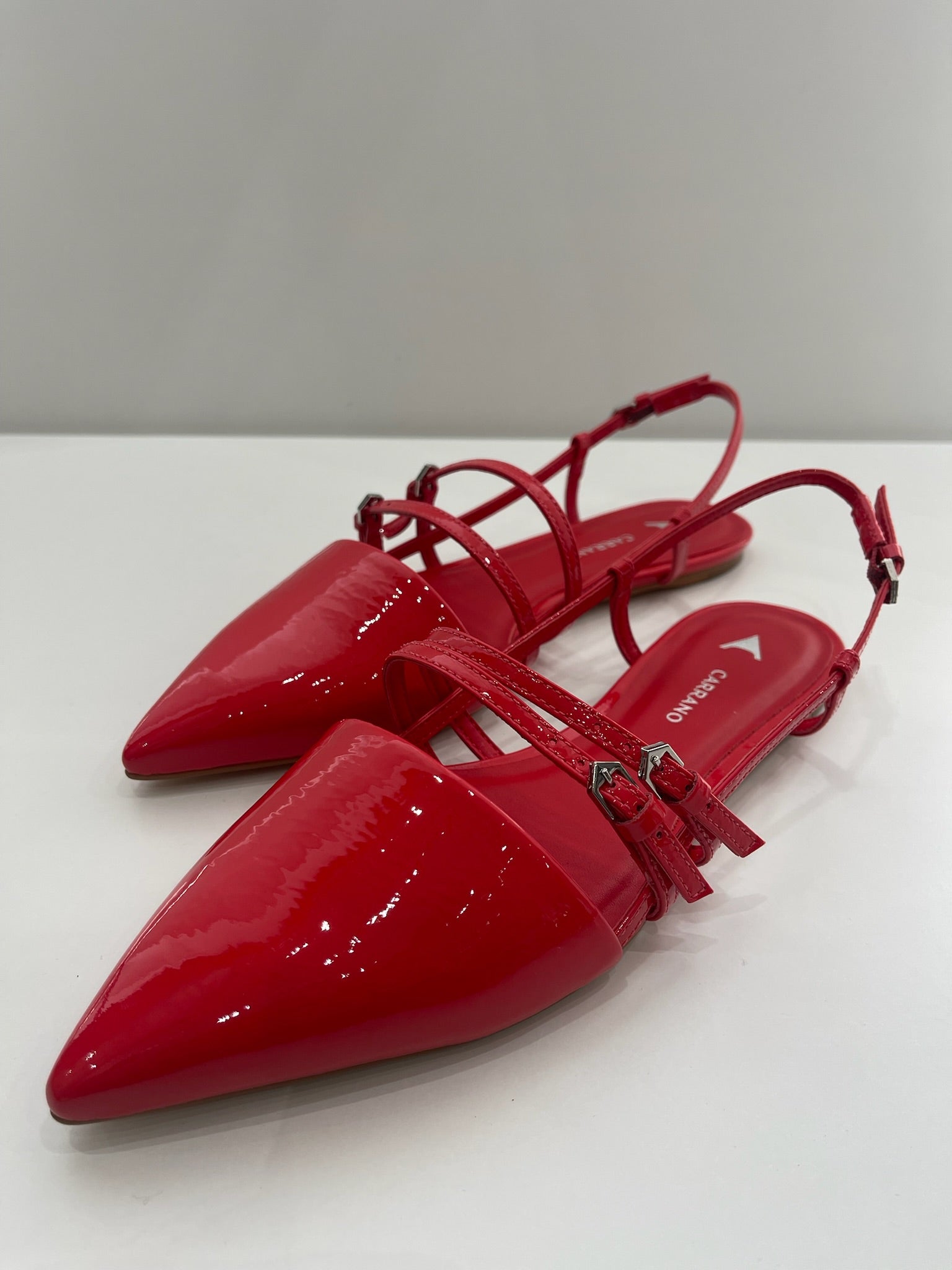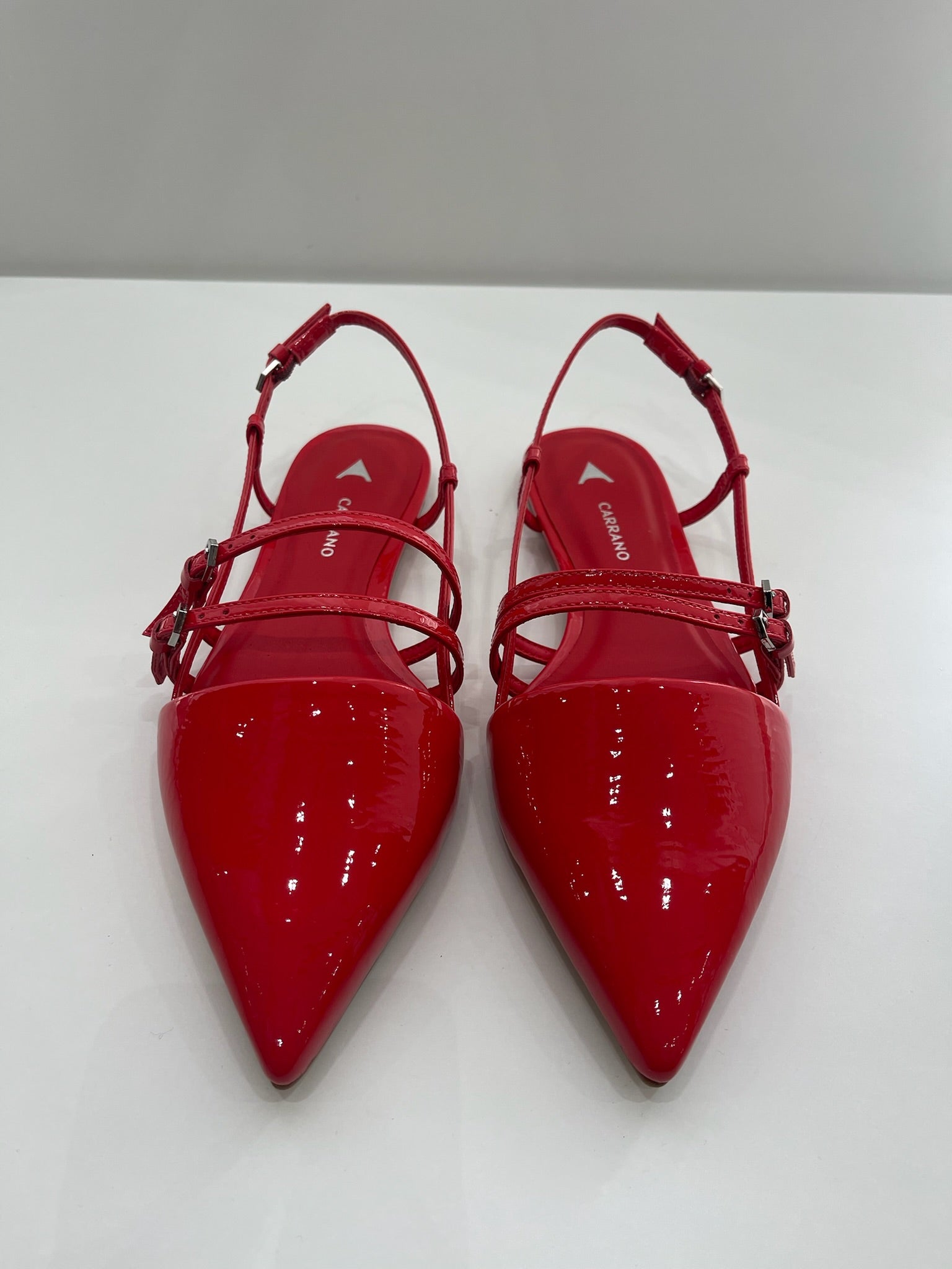 Adicione um toque ousado e sofisticado ao seu look com esta flat slingback em verniz vermelho vibrante. Com design moderno e acabamento envernizado de alto brilho, este modelo destaca-se pela elegância da ponteira fina e pelas delicadas tiras com fivelas metálicas que envolvem o pé com estilo e segurança. A palmilha acolchoada garante conforto ao longo do dia, enquanto o design slingback com ajuste permite praticidade sem comprometer o charme.