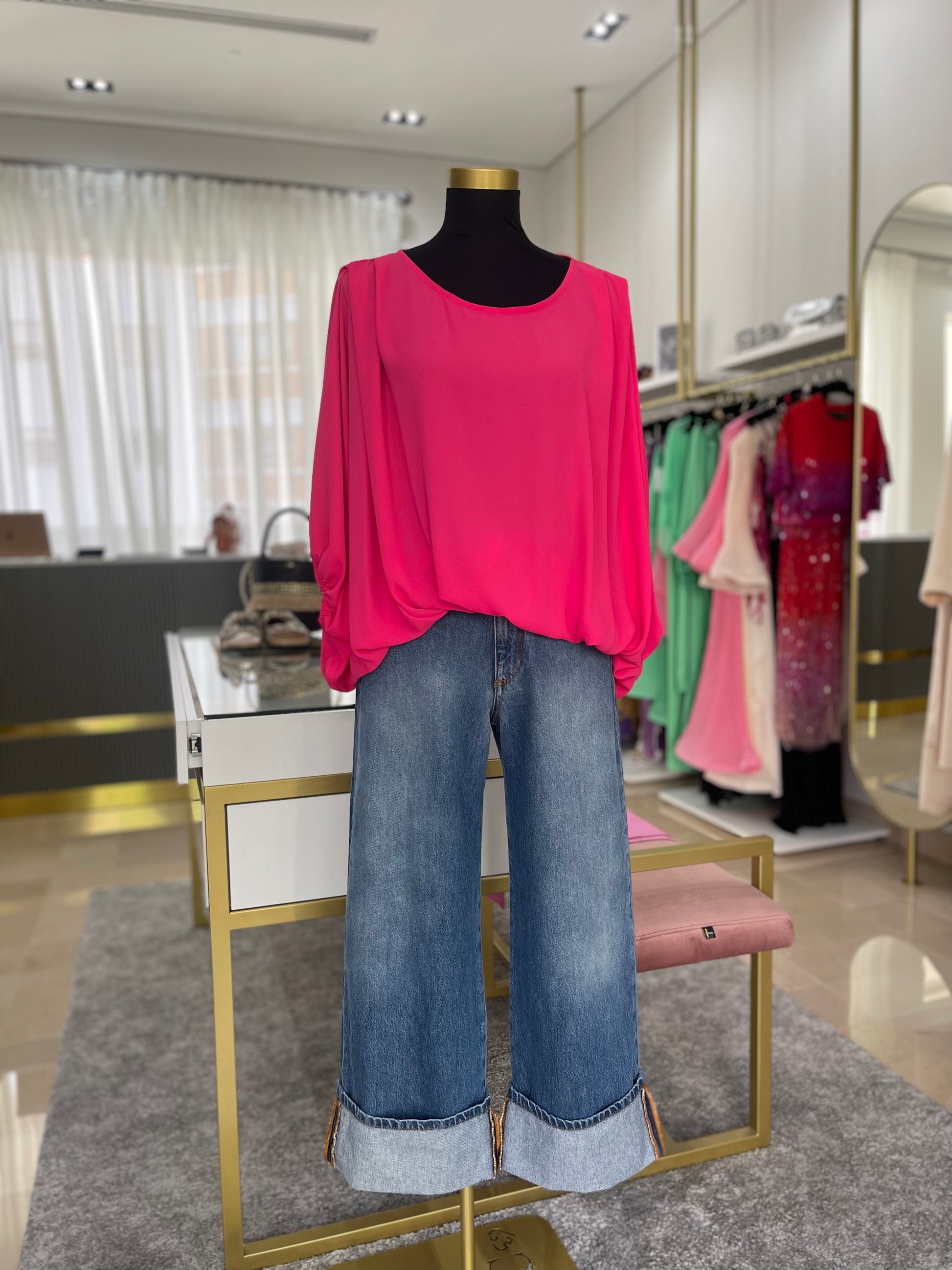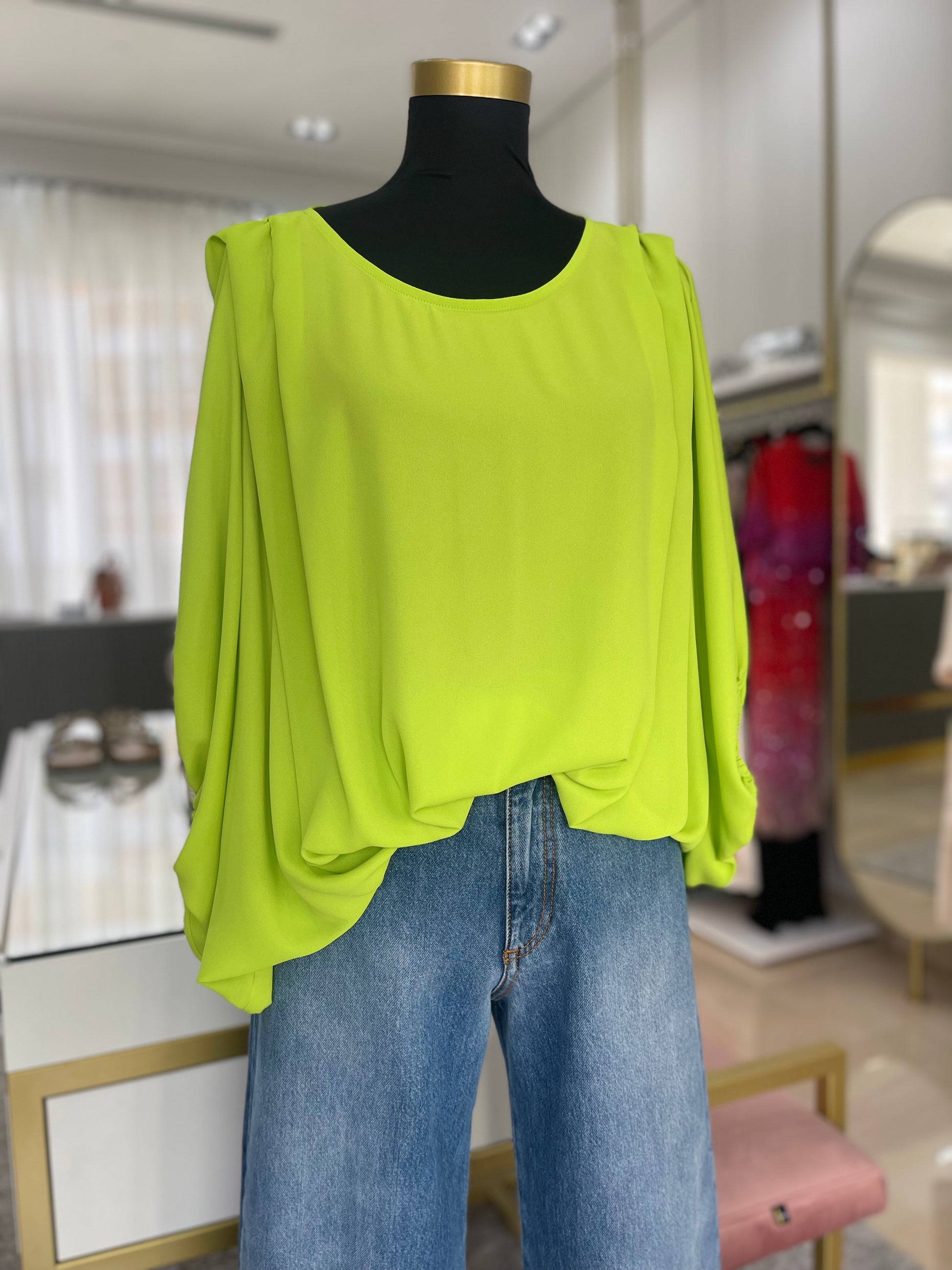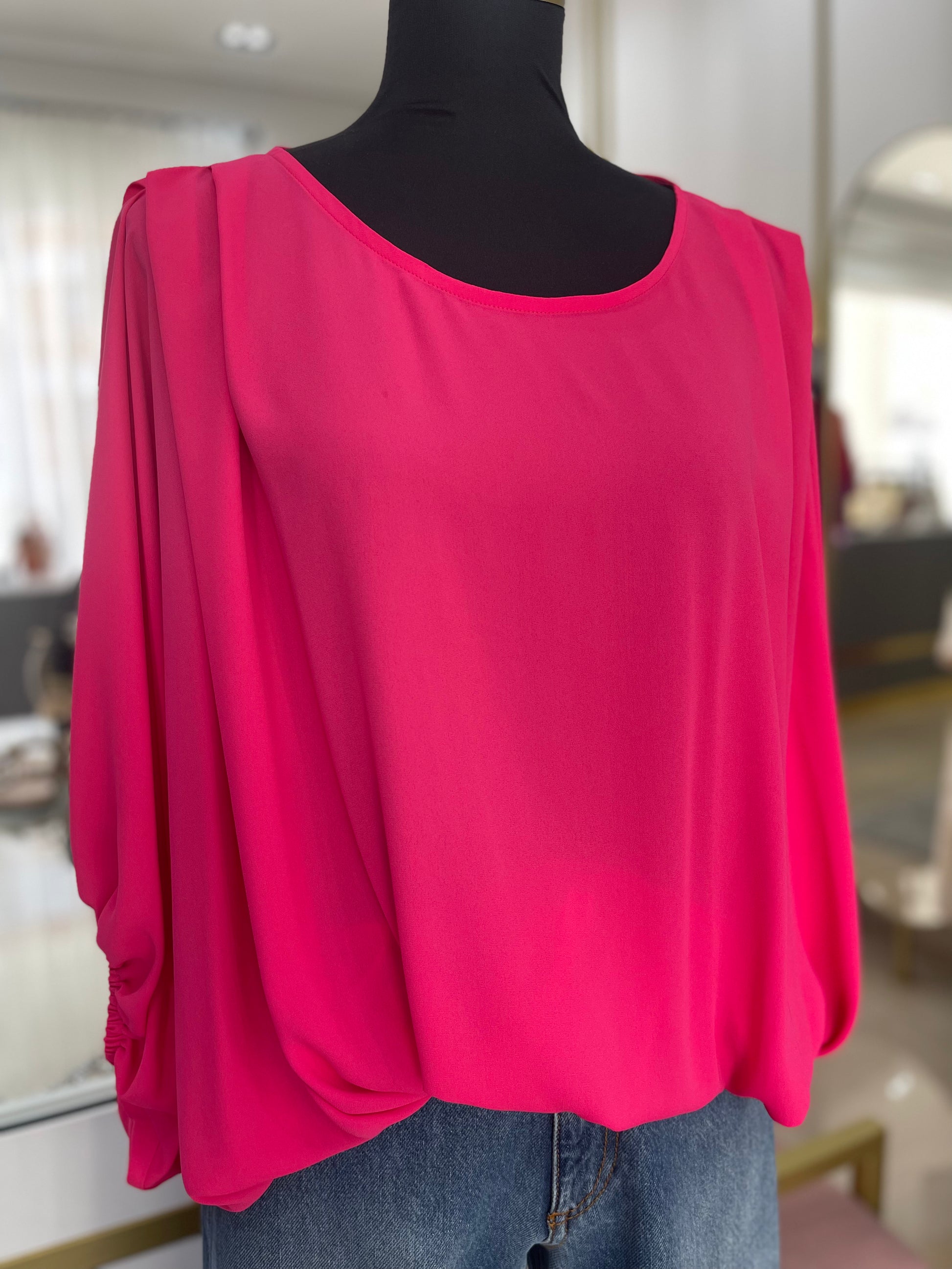 Túnica decote redondo com detalhe de pregas na zona do ombro. Contém elástico no fundo da manga e do corpo que cria um efeito balão à peça.