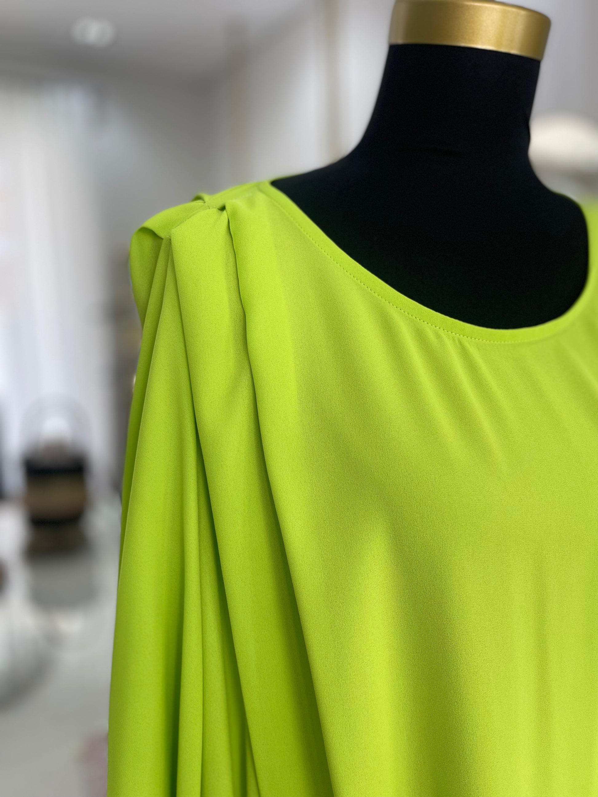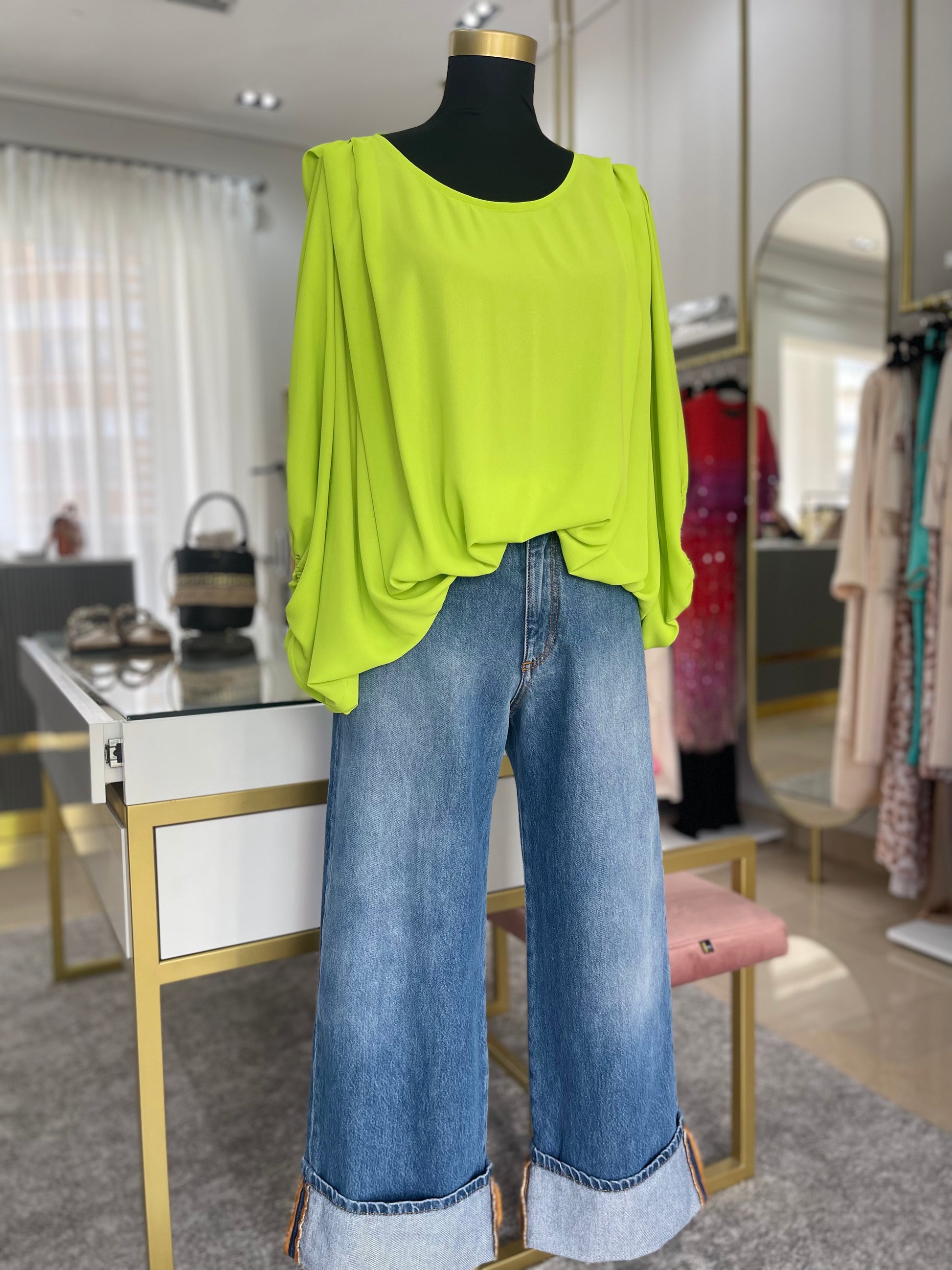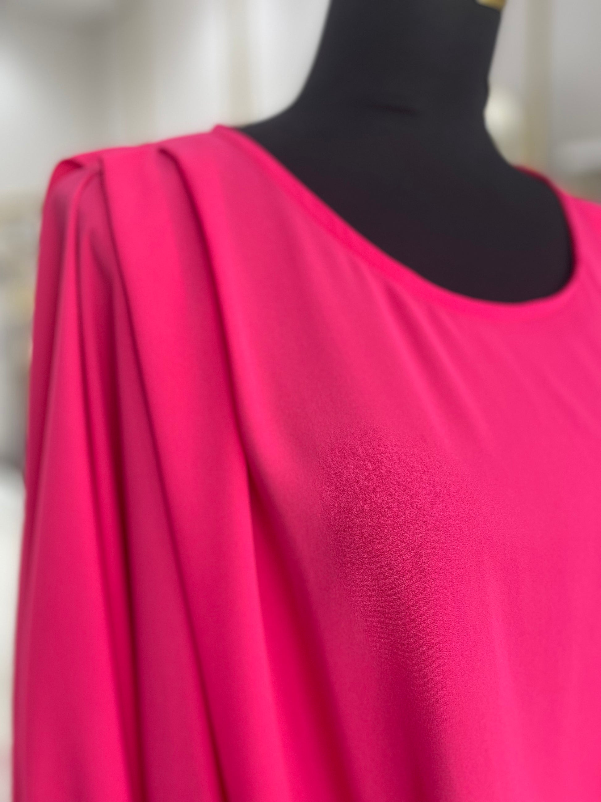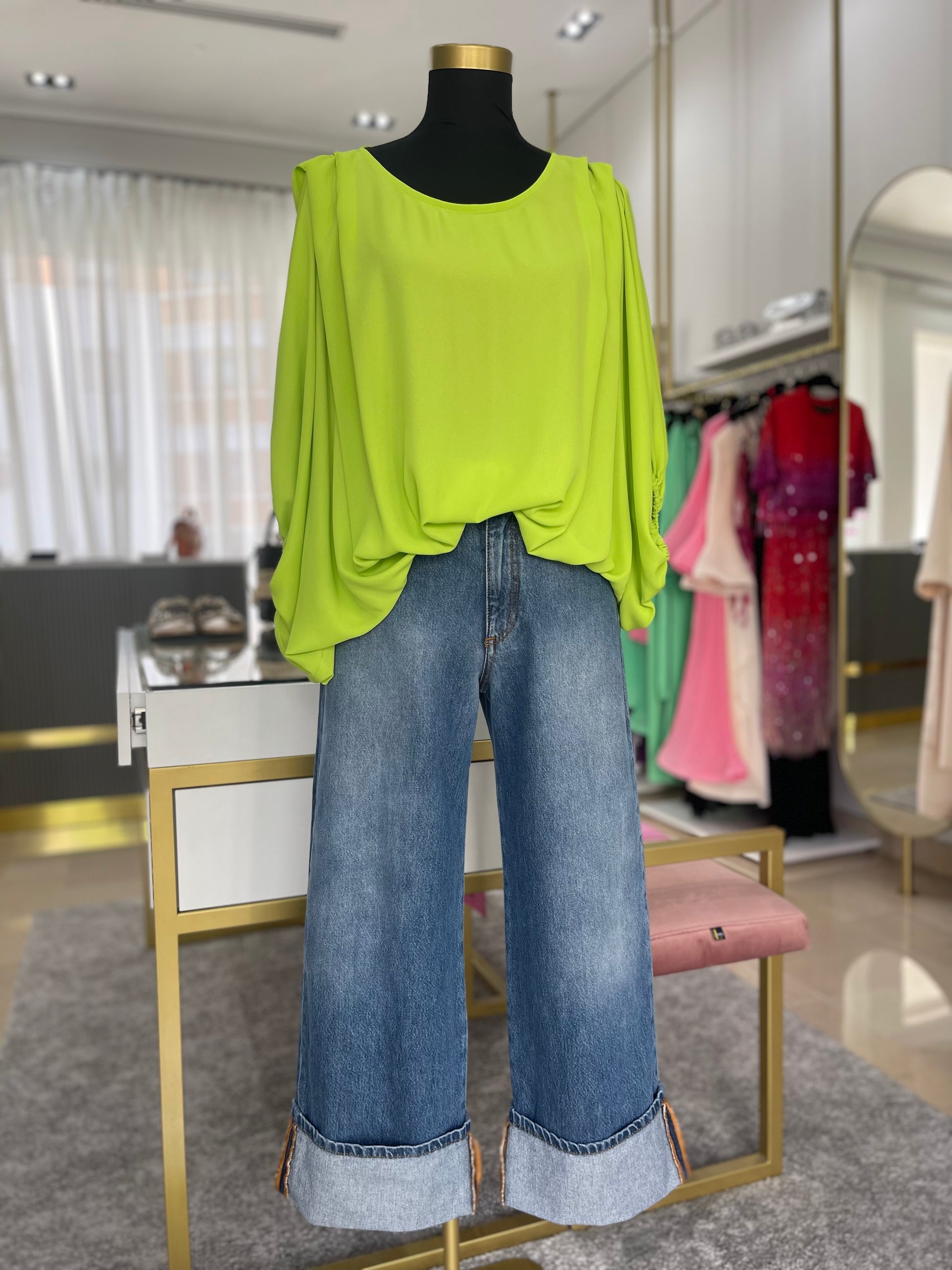 Túnica decote redondo com detalhe de pregas na zona do ombro. Contém elástico no fundo da manga e do corpo que cria um efeito balão à peça.