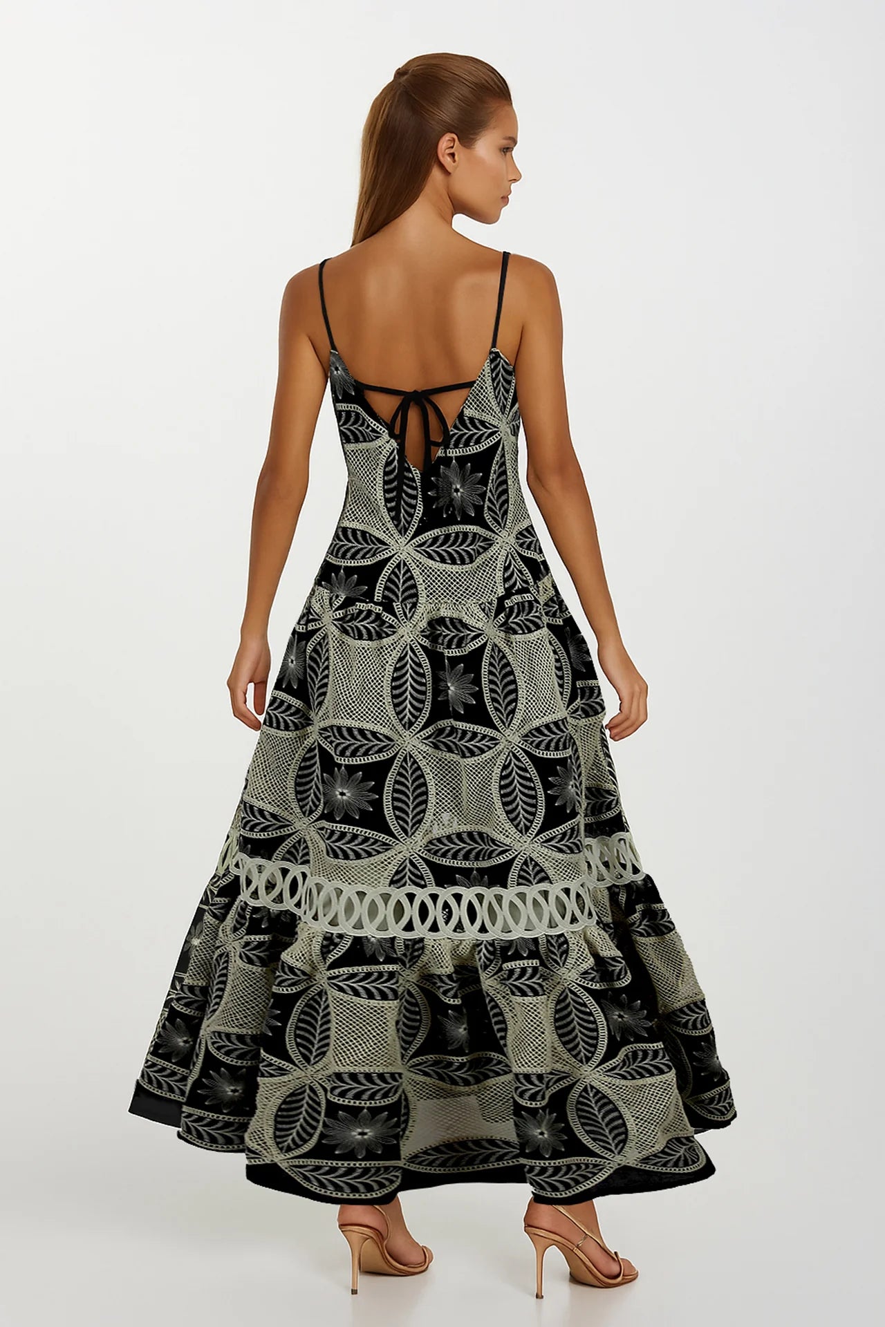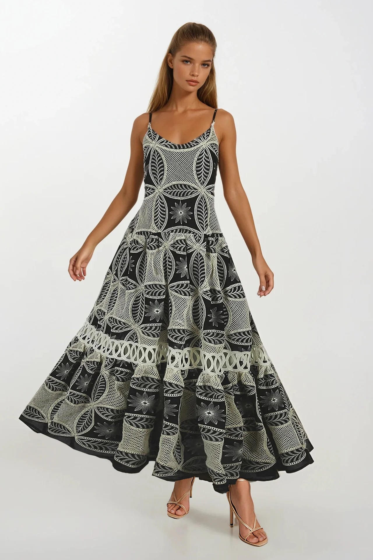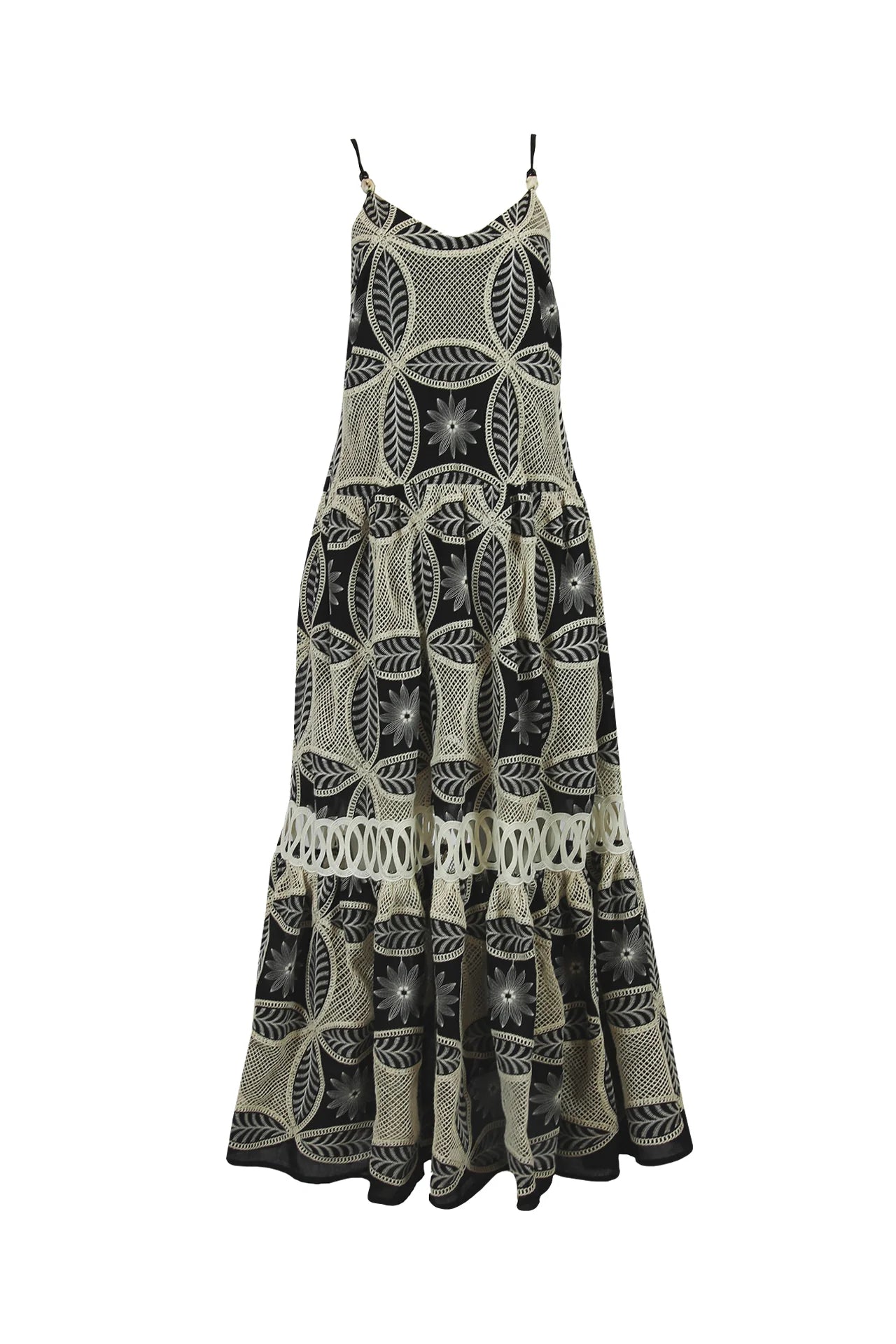 Vestido comprido em fio de algodão, com decote em bico e alças finas. Bordados delicados ao longo da peça e forro interior a condizer. Um modelo leve e sofisticado, ideal para os dias mais quentes.