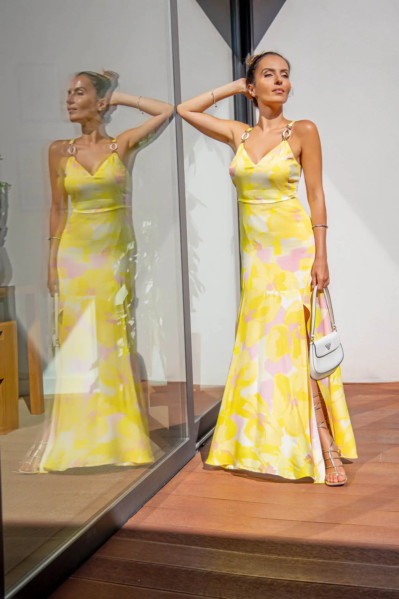 Vestido estampado comprido com aplicações nas alças. Decote em V e corte abaixo do peito. Fitting ajustado na parte superior e fluído na parte inferior. Abertura lateral e aperta na costa com fecho invisível.