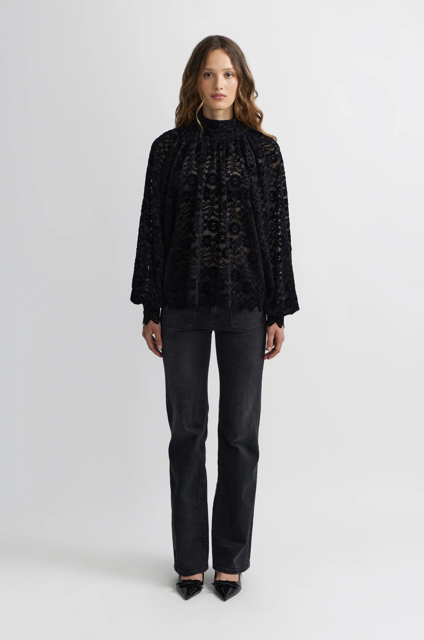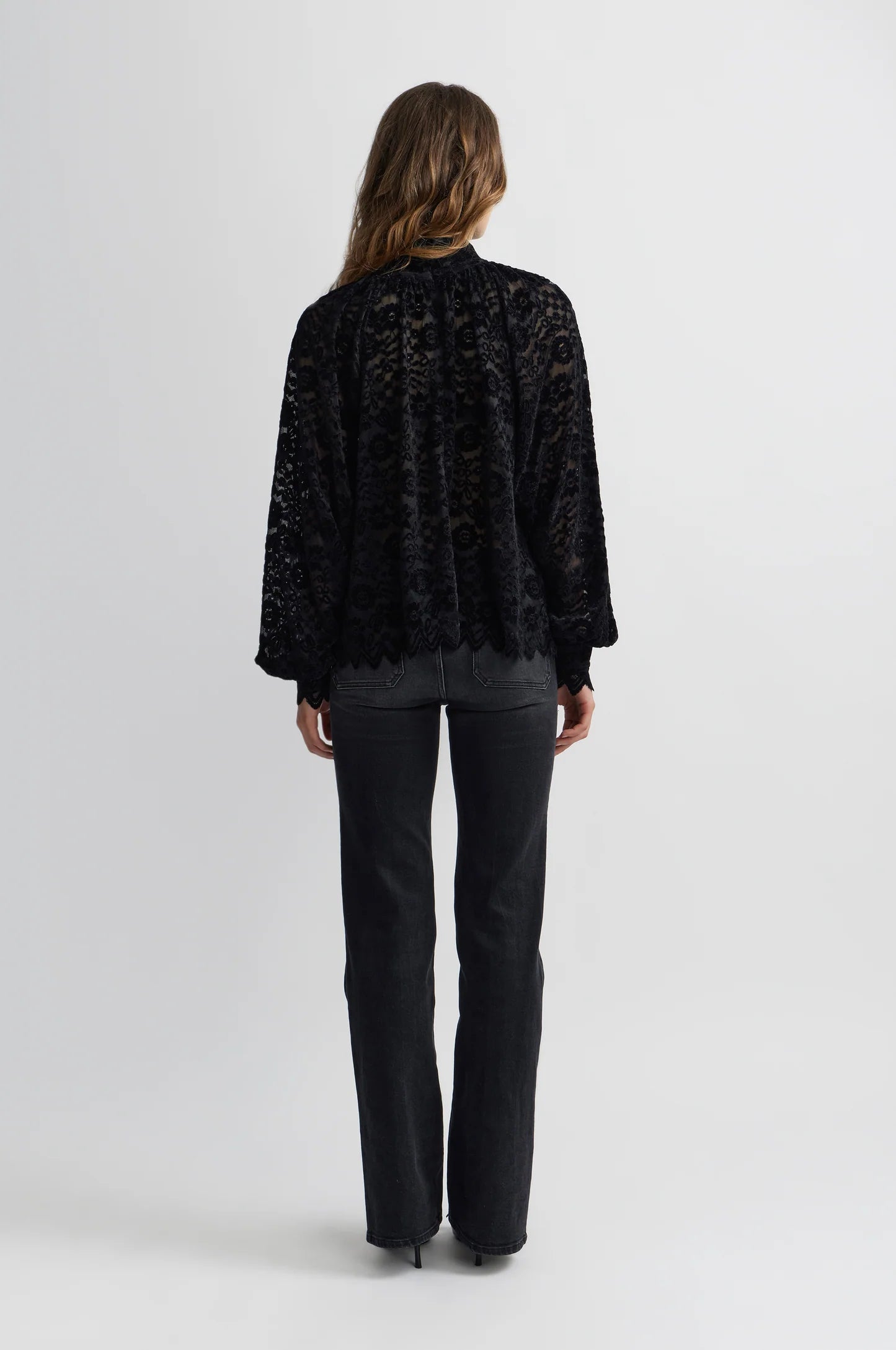 A Corbeille Blouse da Manoush é uma blusa em renda preta que se destaca pela gola alta elegante e pelas mangas compridas em balão, que acrescentam volume e sofisticação à silhueta. Delicada e feminina, é uma peça statement ideal para looks refinados de dia ou de noite.