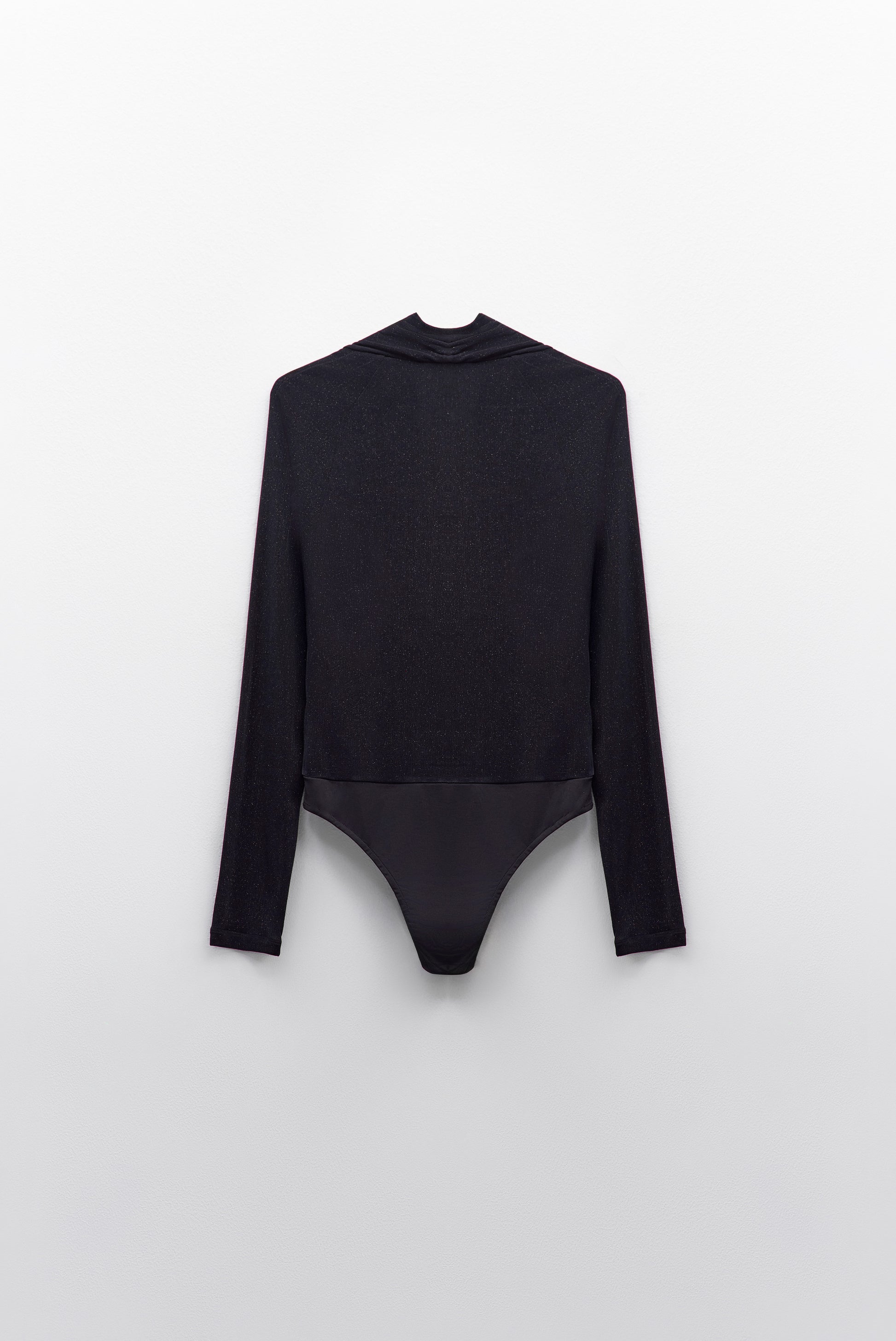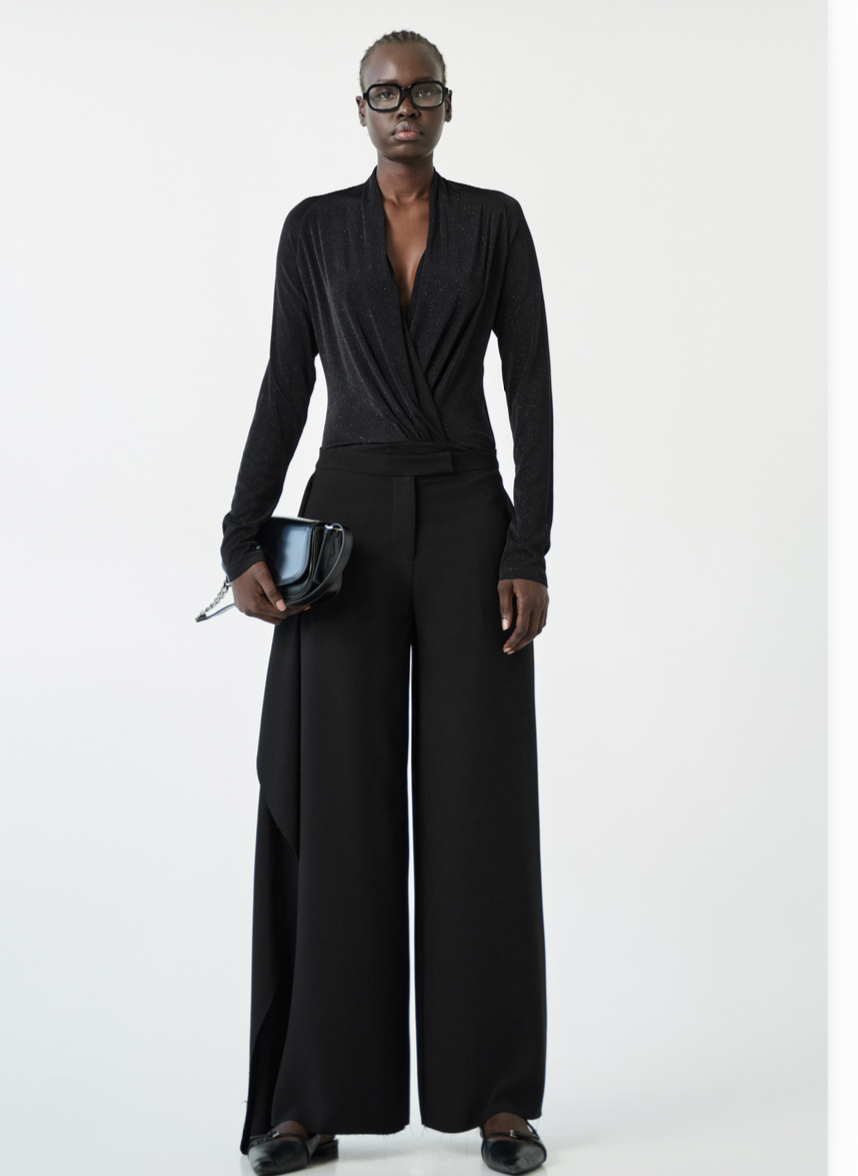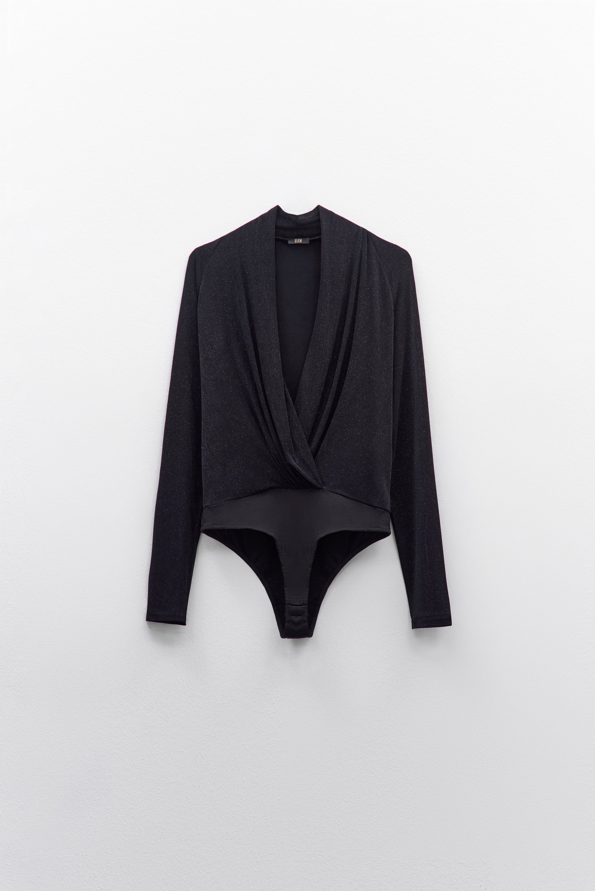 Body elegante de manga comprida com decote profundo cruzado que valoriza o colo de forma sofisticada. O tecido com brilho subtil confere um toque moderno e refinado, perfeito para ocasiões especiais ou looks mais marcantes.
