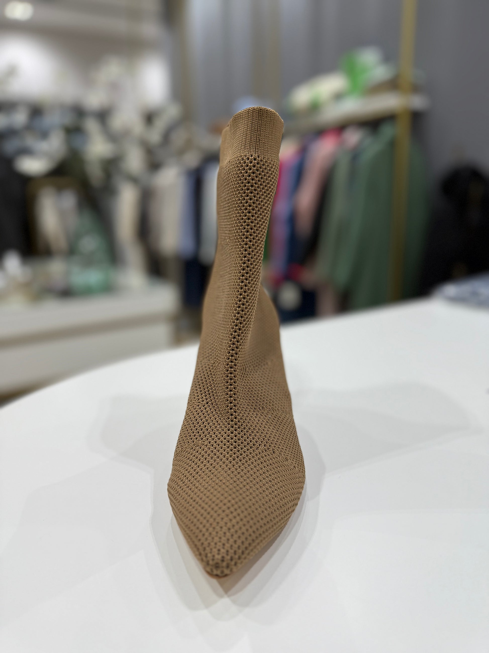 Bota em knit. O modelo tem cano baixo, salto bloco e bico fino. Ajustado ao pé, cano estilo meia e tira de gorgurão na parte traseira com aplicação do ícone Carrano, que auxilia no calce