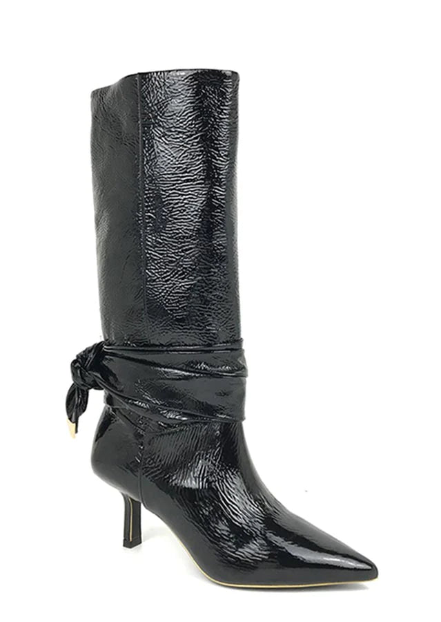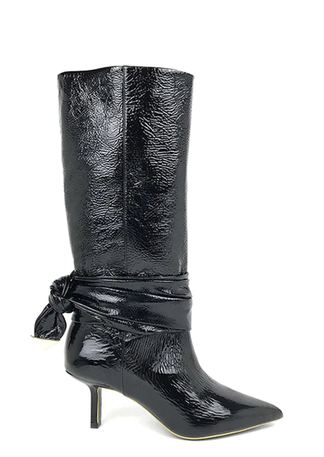 Uma bota de couro ou verniz de salto médio, para uma mulher urbana moderna.