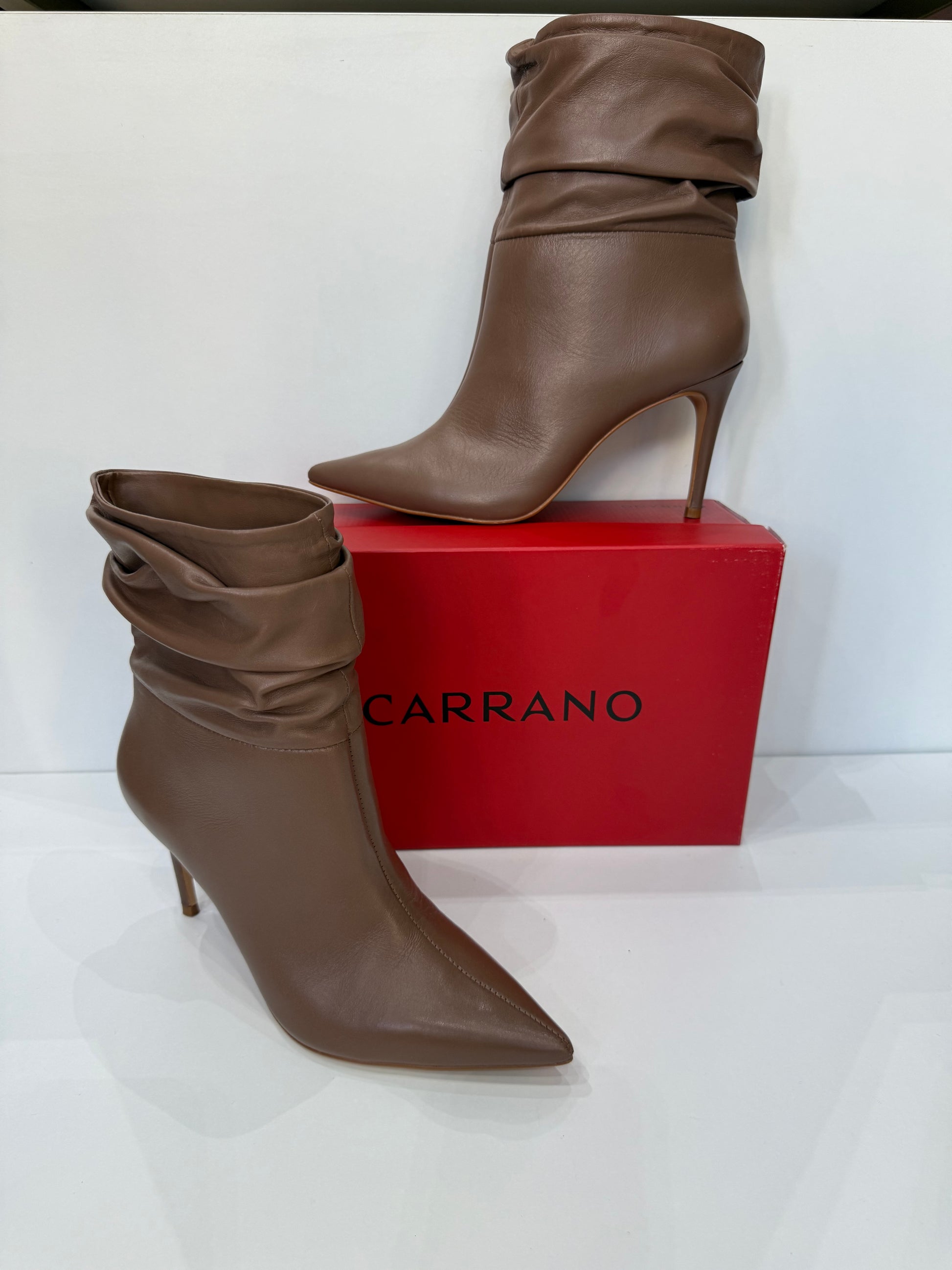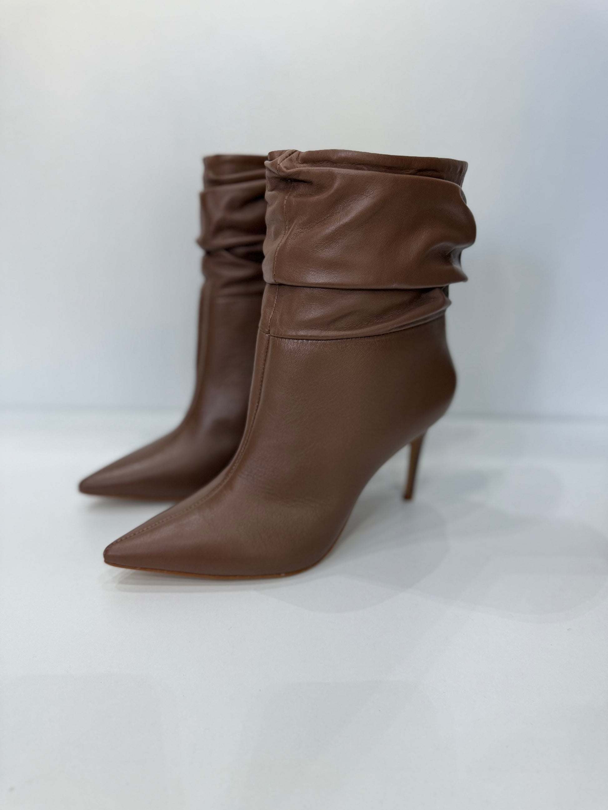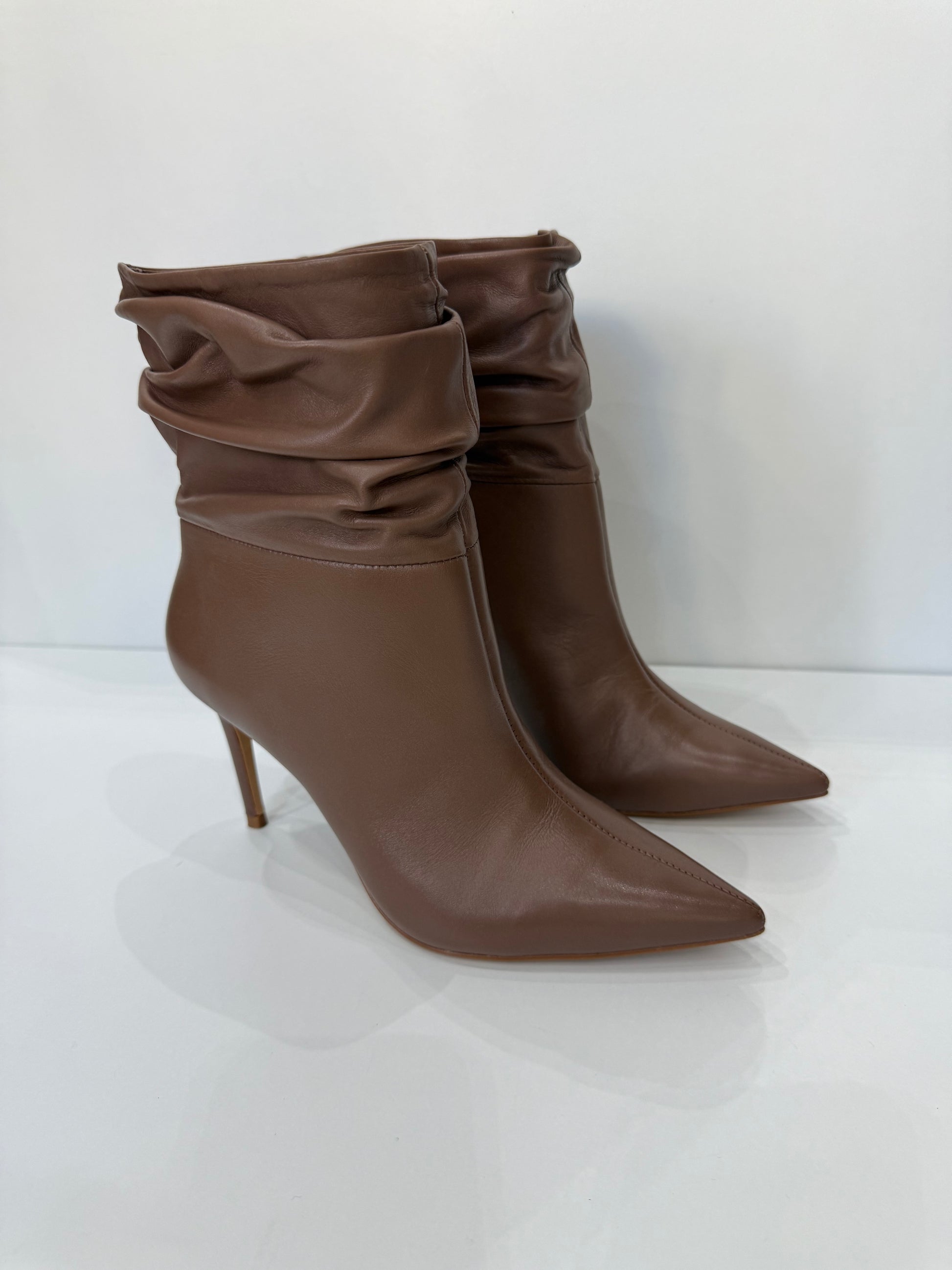 Bota de cano curto em pele macia, com acabamento drapeado e bico fino. O salto alto fino alonga a silhueta, enquanto o design elegante e moderno adiciona sofisticação a qualquer look.