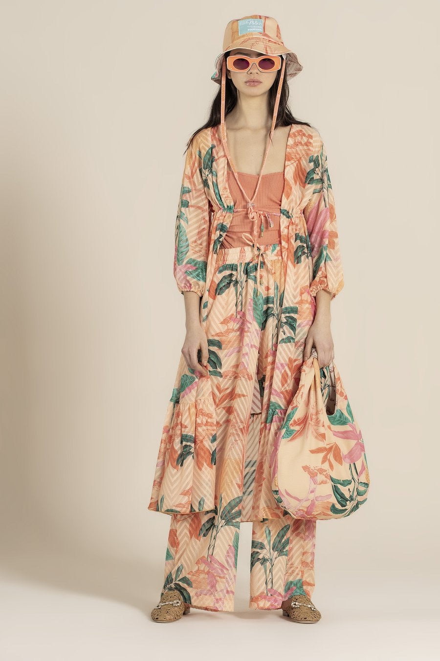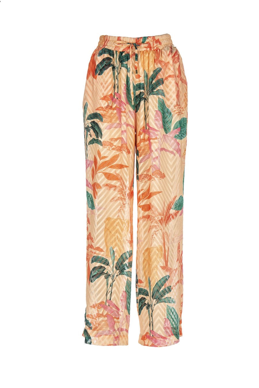 Calças com Print floral em tons de laranja. Existe túnica a condizer.