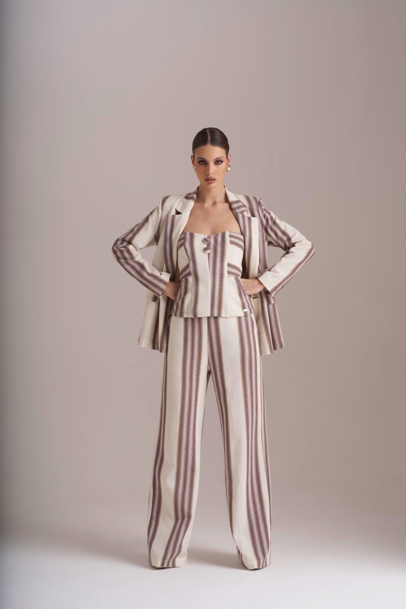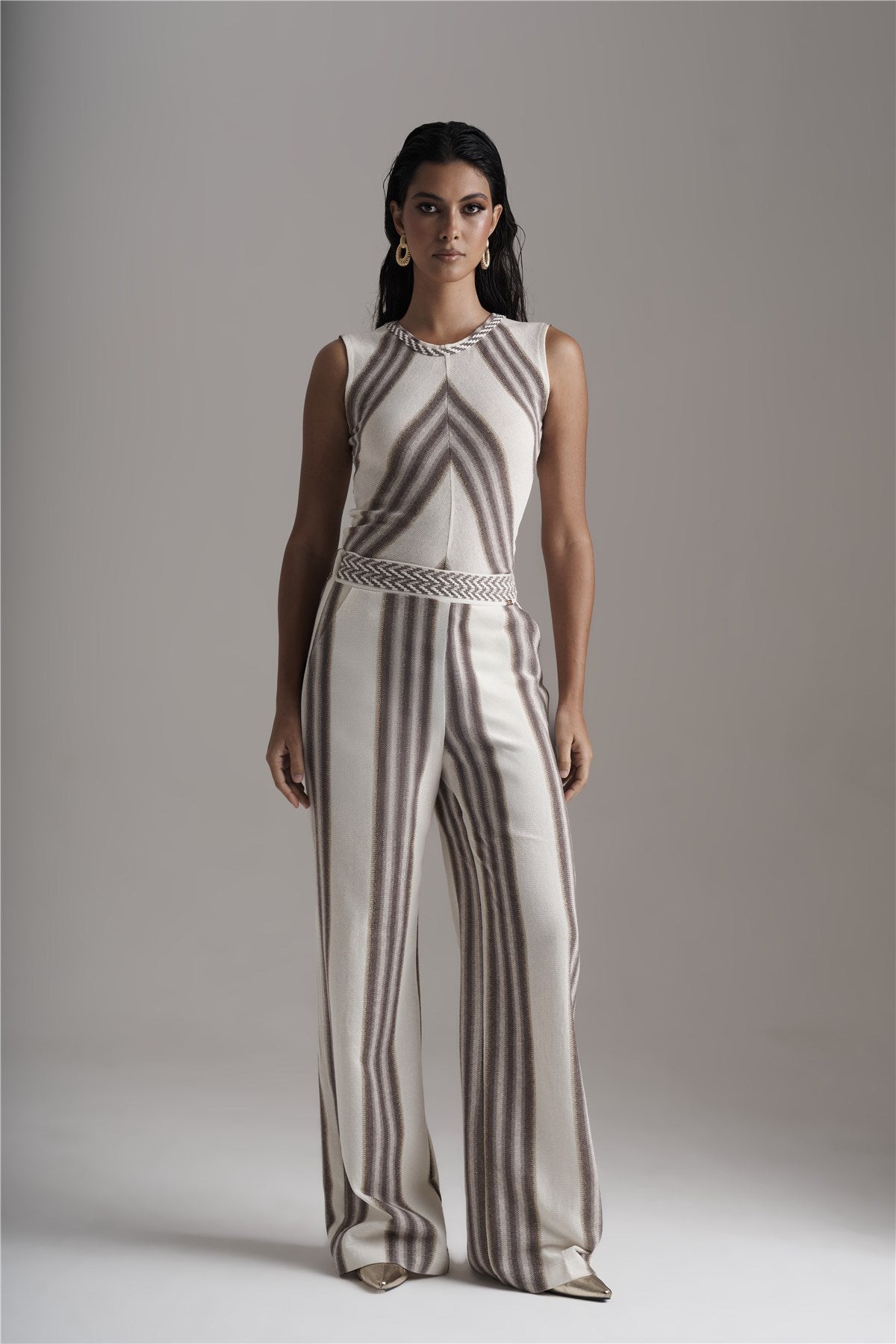 As Calças Rachel da Pho Firenze destacam-se pelo seu padrão exclusivo em riscas verticais que alternam tons de bege, taupe e creme, criando um efeito visual refinado e alongador.