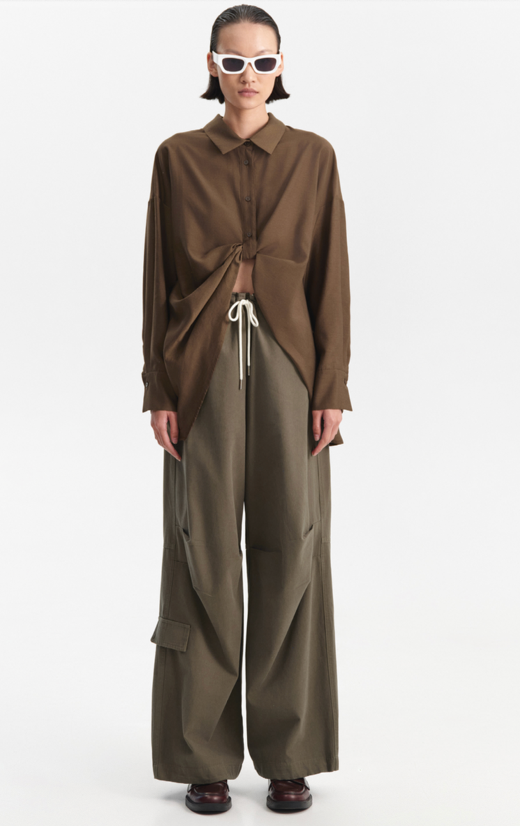 Camisa OVERSIZED em tom castanho com design contemporâneo e detalhe de laço frontal que cria um efeito volumoso e sofisticado. O colarinho clássico e o abotoamento discreto equilibram a ousadia do laço com elegância intemporal.