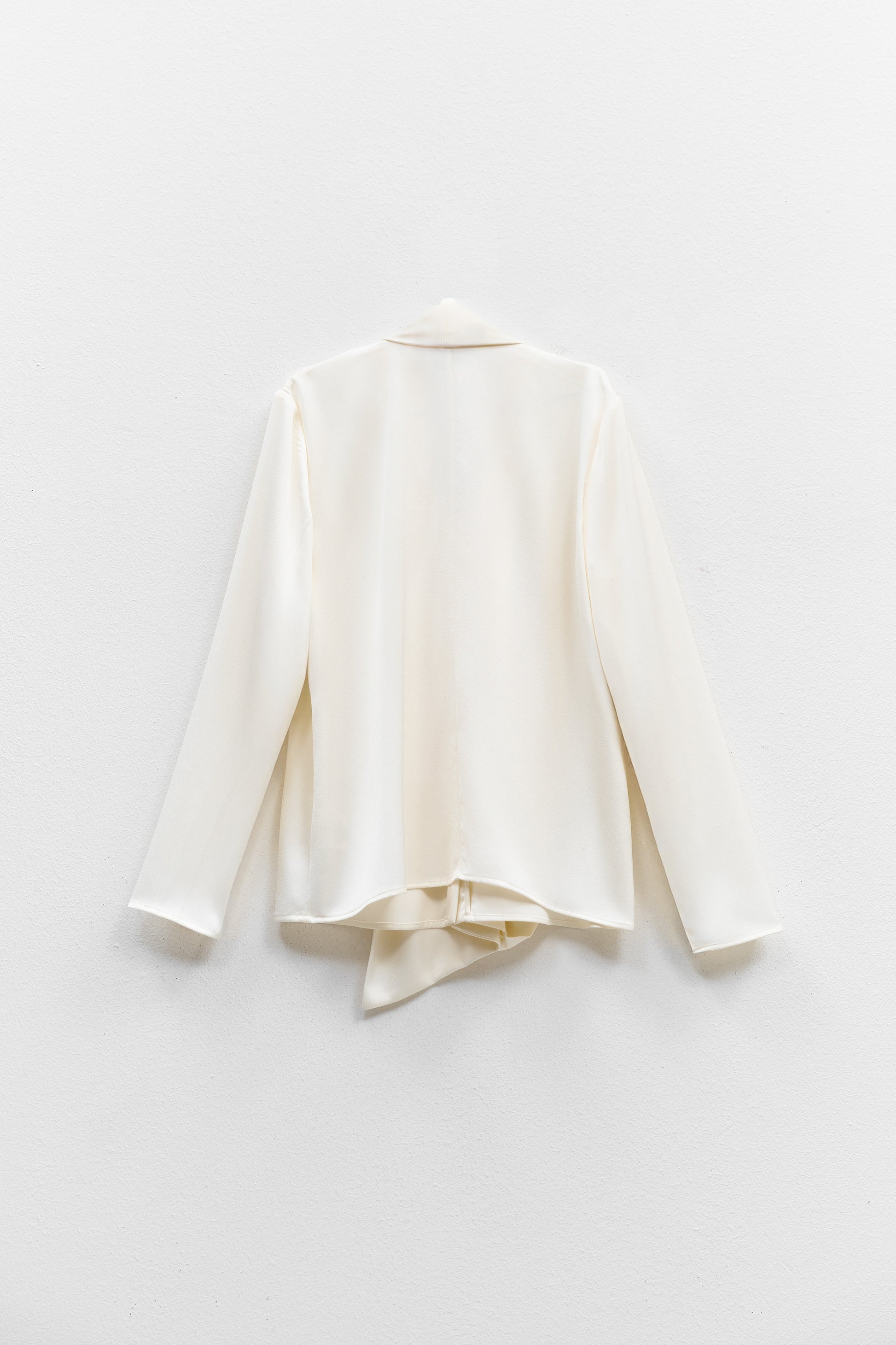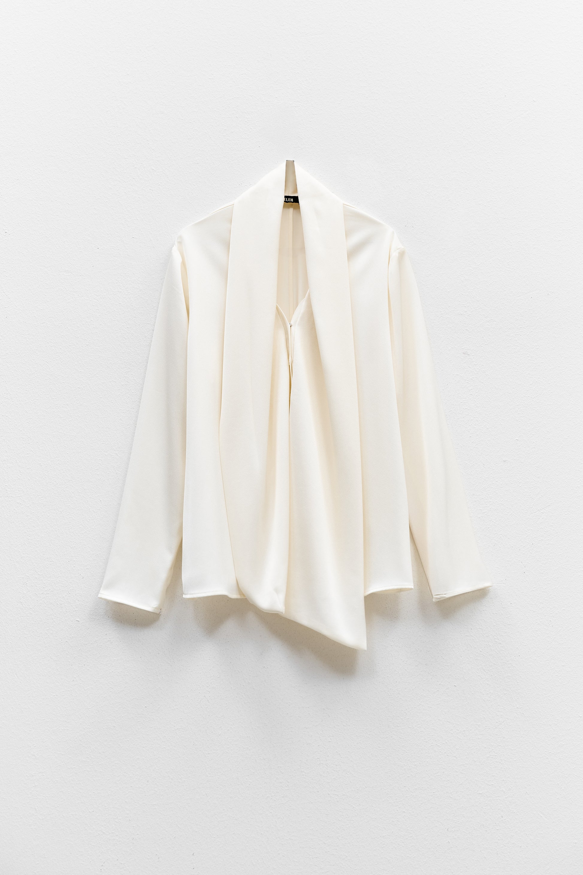 Veste Grande. Camisa em tom creme com corte fluido e sofisticado, destacando-se pela gola ampla e elegante que cria um efeito envolvente no decote. O design assimétrico na parte frontal acrescenta modernidade e movimento à peça.