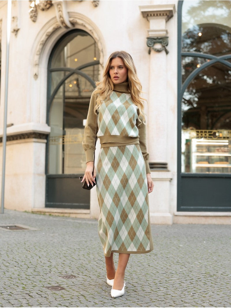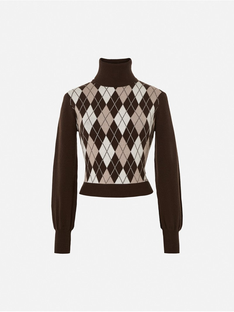 Dá um toque clássico e elegante ao teu guarda-roupa com esta camisola de gola alta e padrão de losangos em estilo argyle. O design intemporal combina perfeitamente com a silhueta moderna e justa ao corpo, ideal para looks sofisticados ou casuais. Feita com malha macia e confortável, esta peça oferece o equilíbrio perfeito entre estilo e conforto nos dias mais frios.