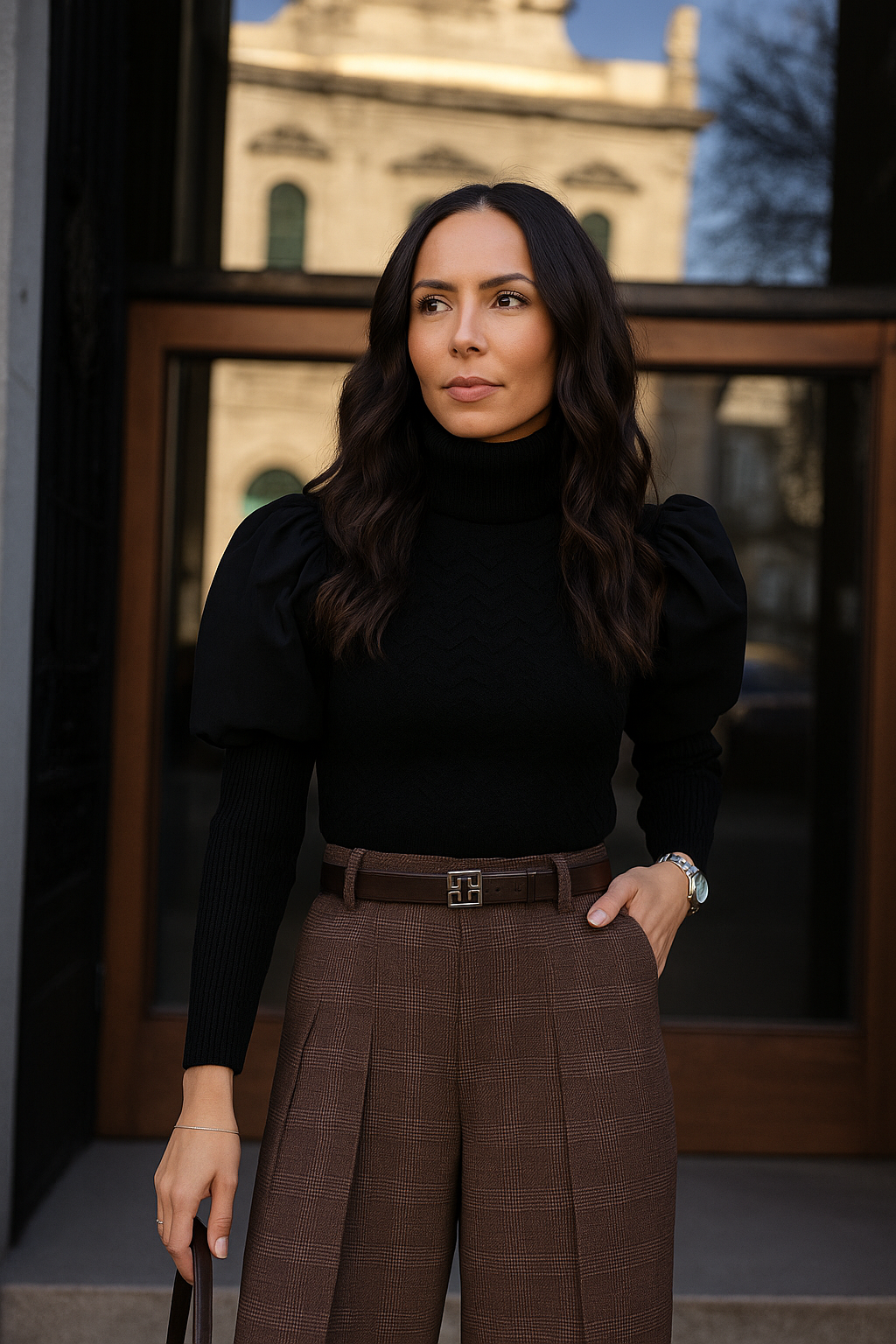 Camisola de malha macia e quente, com gola alta e mangas abalonadas em tecido contrastante. O corpo em malha apresenta um padrão discreto em relevo, enquanto as mangas volumosas conferem um toque feminino e sofisticado. Uma peça versátil e elegante, perfeita para coordenar com saias ou calças de alfaiataria.
