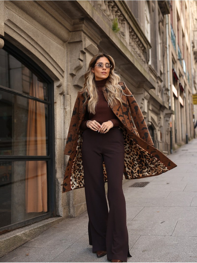 Casaco comprido em tecido encorpado com padrão animal print em tons de castanho e preto. O modelo apresenta gola clássica com lapelas largas e forro interior contrastante com estampa de leopardo, criando um efeito visual impactante e elegante. A mistura de fibras garante conforto e estrutura, tornando esta peça perfeita para looks sofisticados e ousados nos dias frios.
