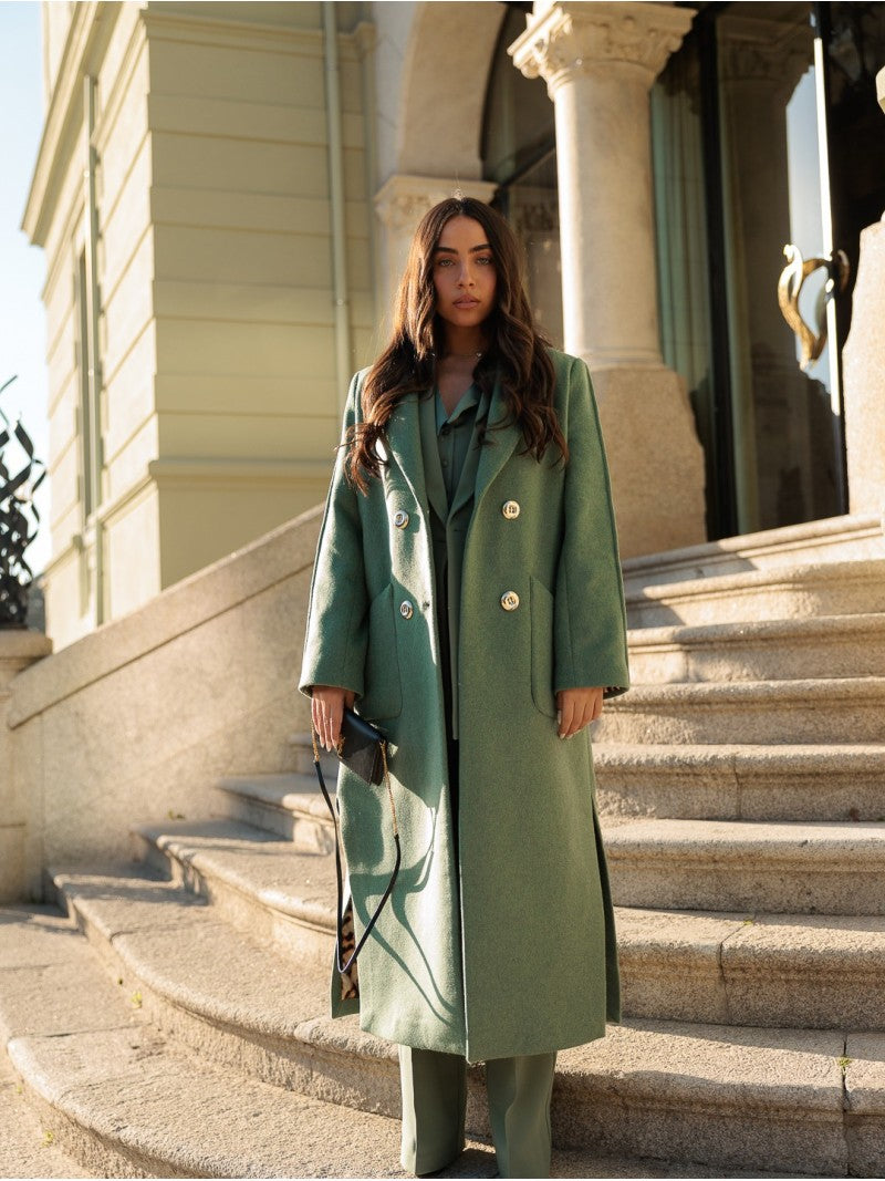 Casaco comprido em mistura de lã com corte reto e elegante. Apresenta gola clássica, aberturas laterais e fecho duplo com botões dourados que acrescentam um toque sofisticado e moderno. O tecido encorpado e macio oferece conforto e estrutura, enquanto o tom verde suave traz um ar contemporâneo e refinado. Perfeito para usar sobre coordenados monocromáticos ou looks de alfaiataria.