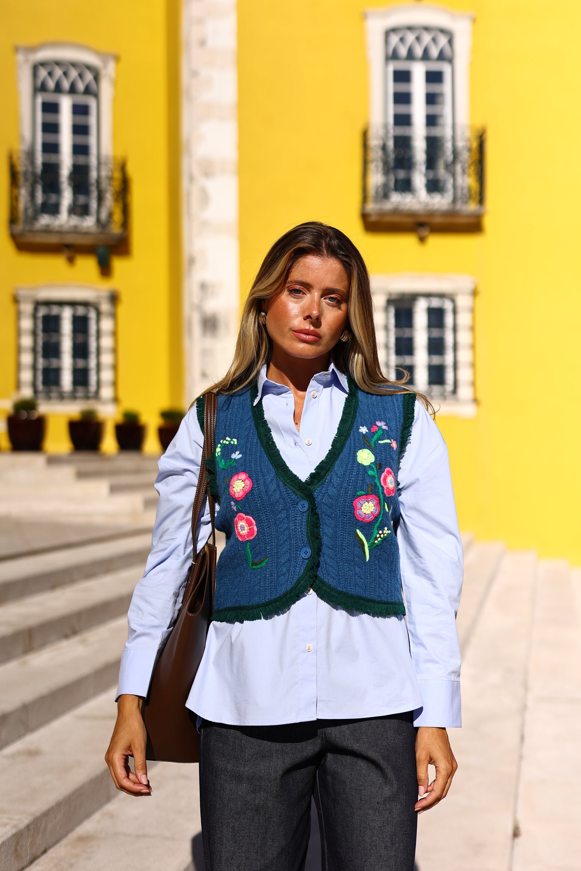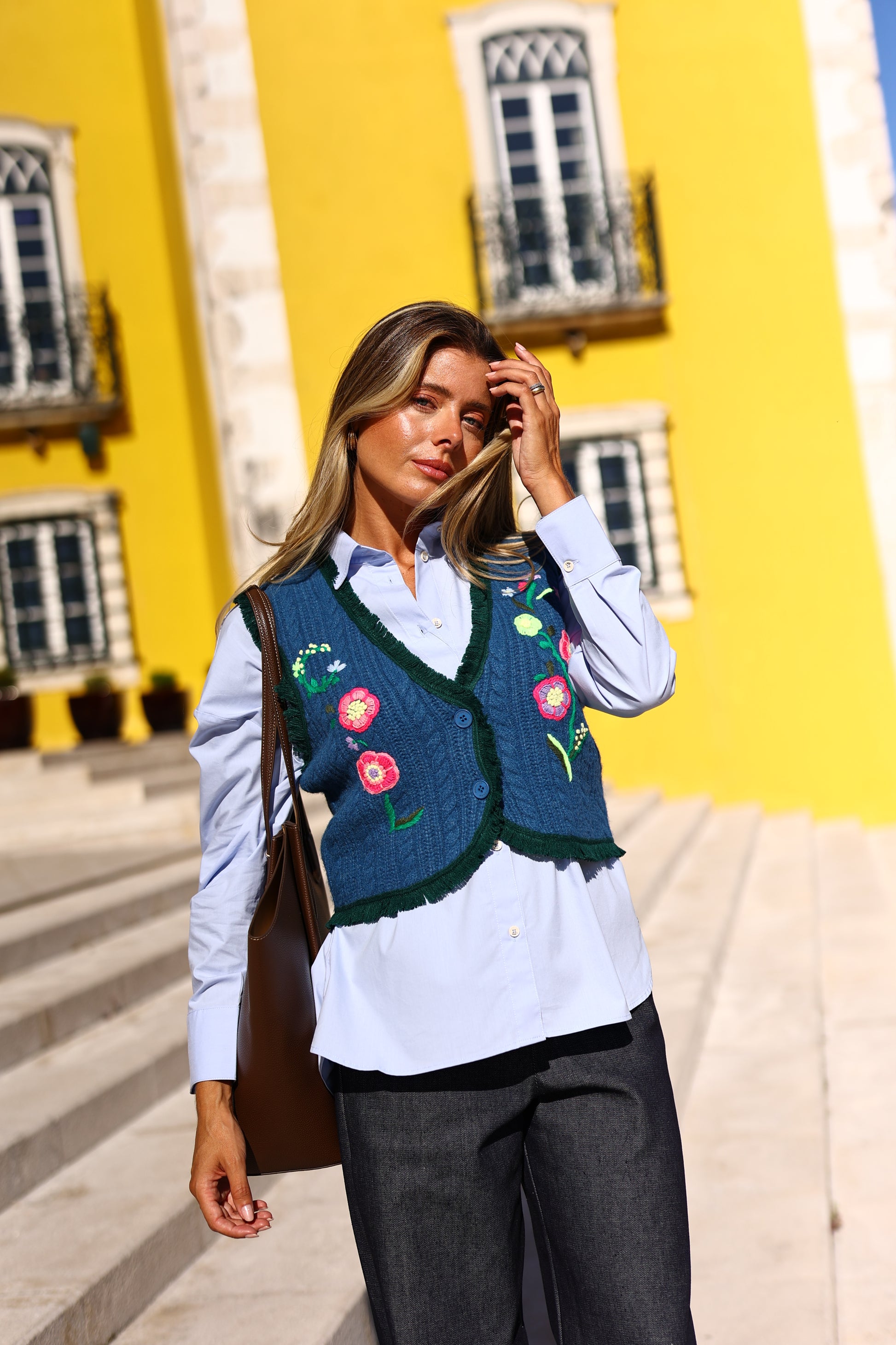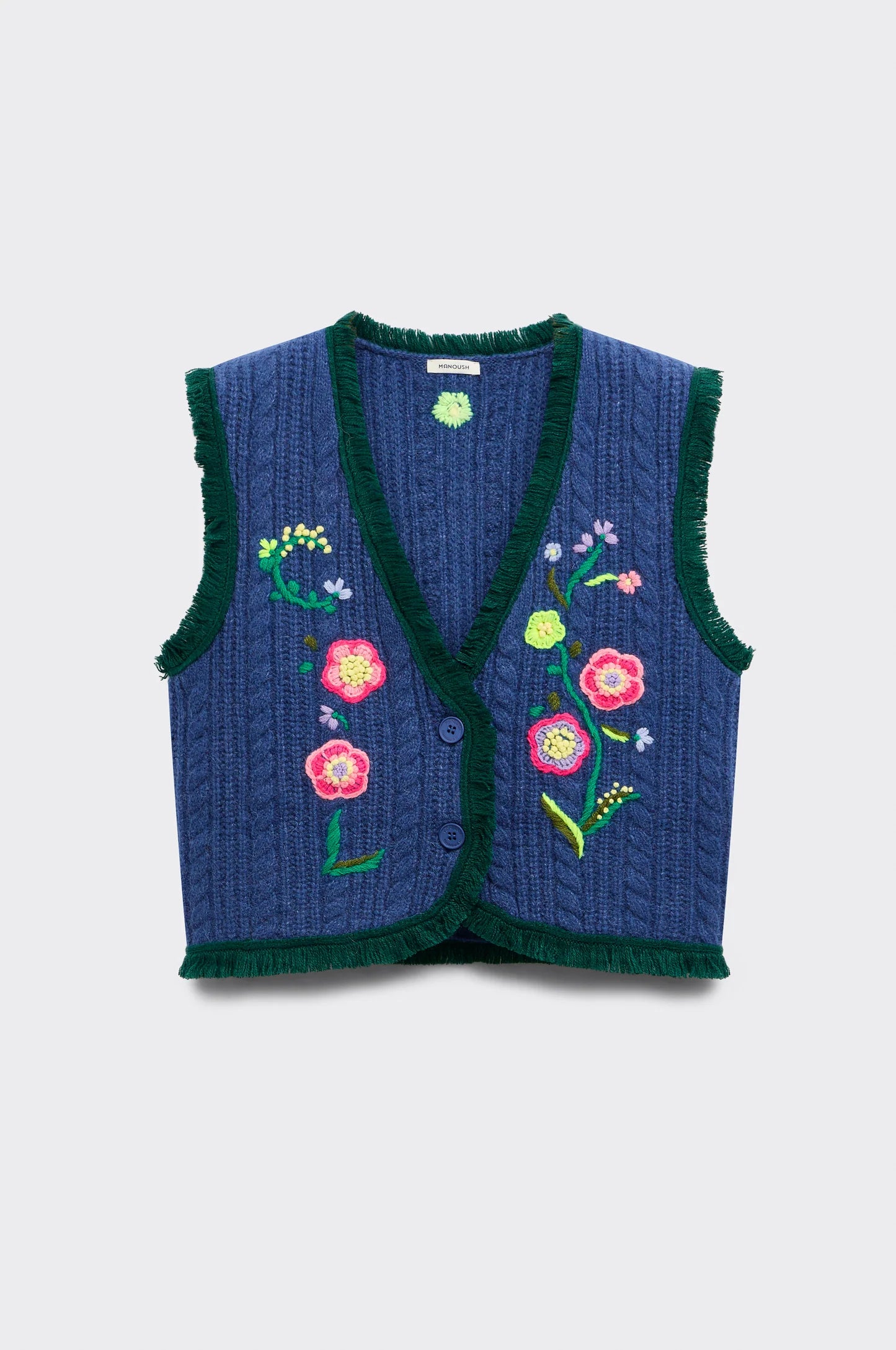O Gilet Cool da Manoush é um colete de malha torsadée que combina delicadas bordadeiras florais com acabamentos franjados, criando um visual boémio, romântico e sofisticado. Uma peça artesanalmente rica, perfeita para acrescentar textura, cor e personalidade a qualquer look.
