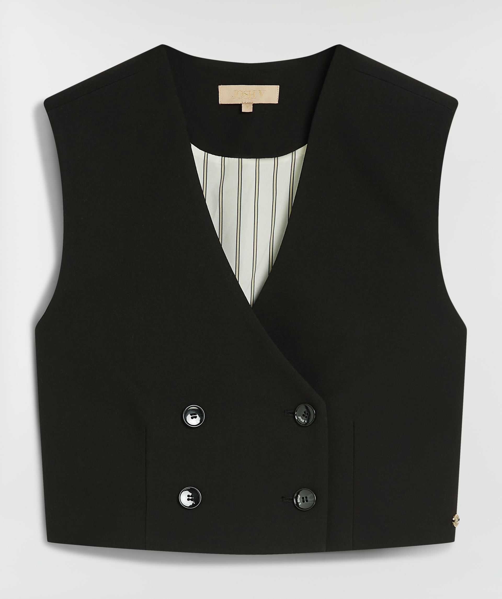 Este gilet elegante apresenta um design moderno e minimalista, com decote em V e fecho por botões e botão interiorpara um ajuste impecável. Sem mangas, é uma peça versátil que pode ser usada sozinha ou em sobreposições.
