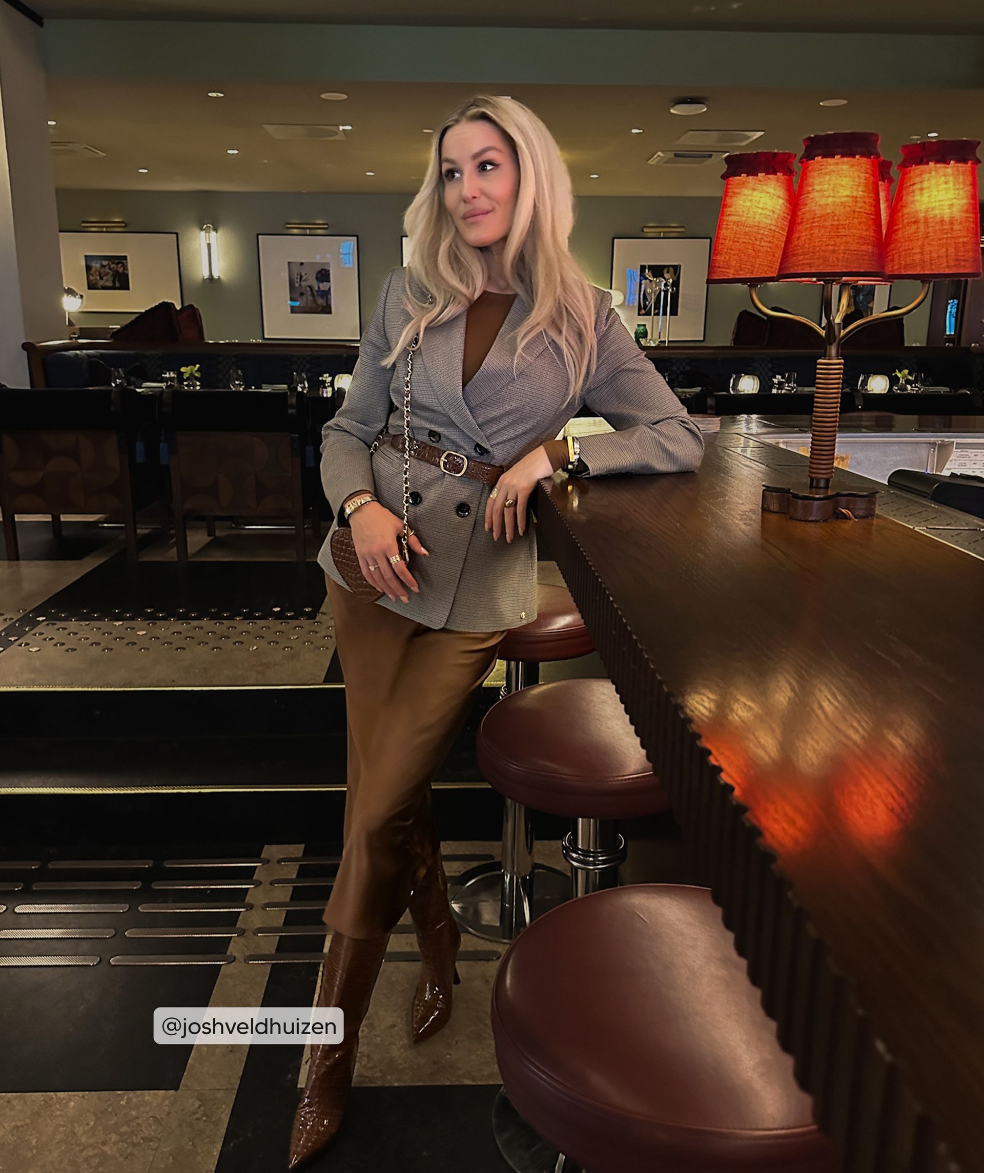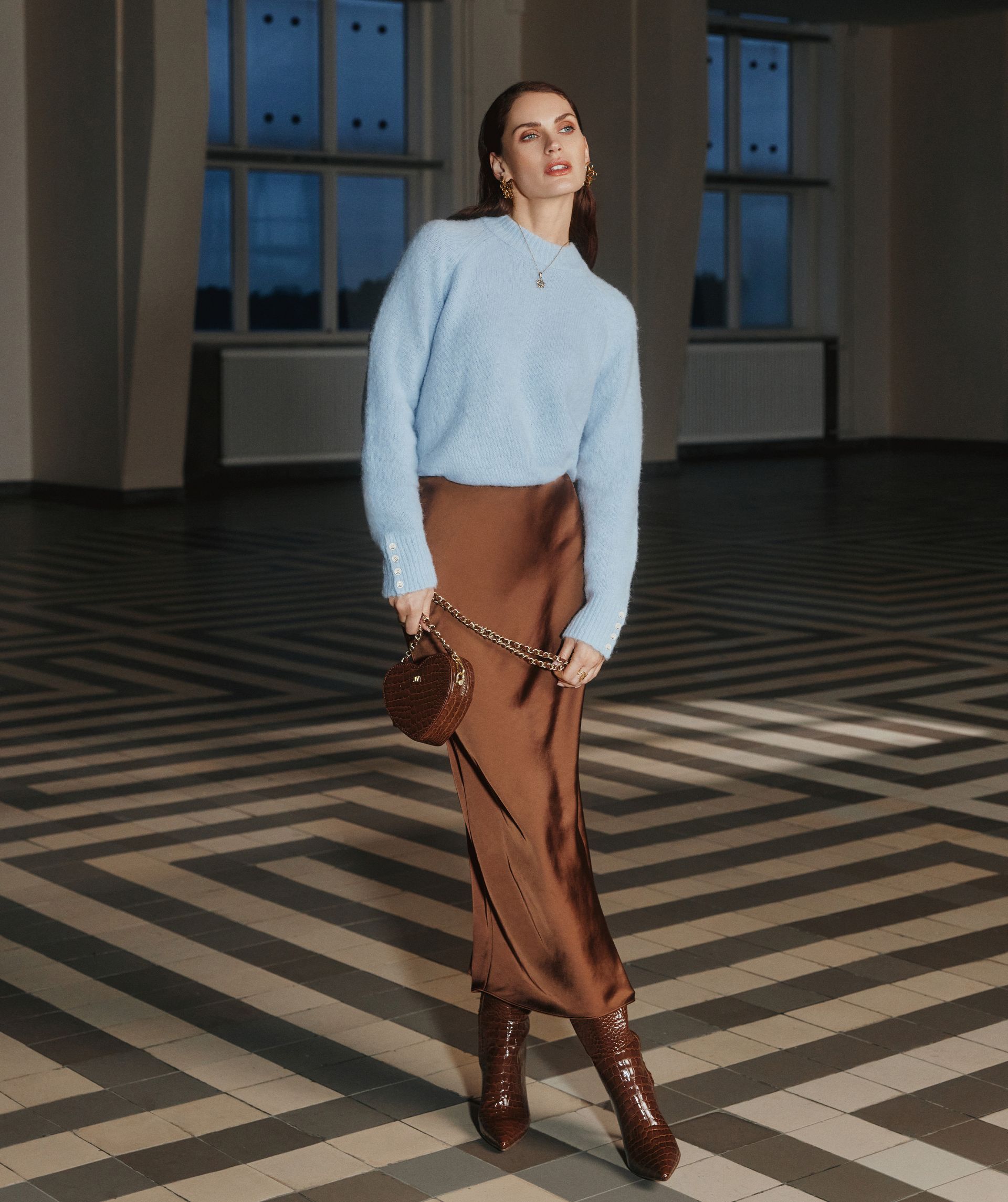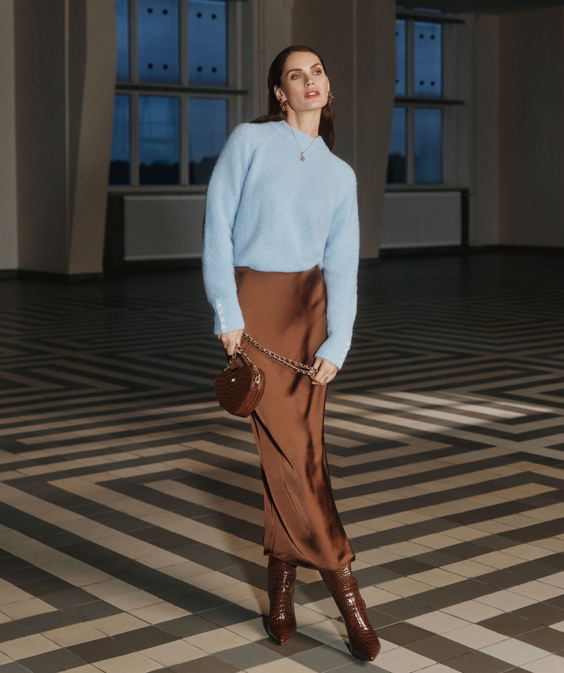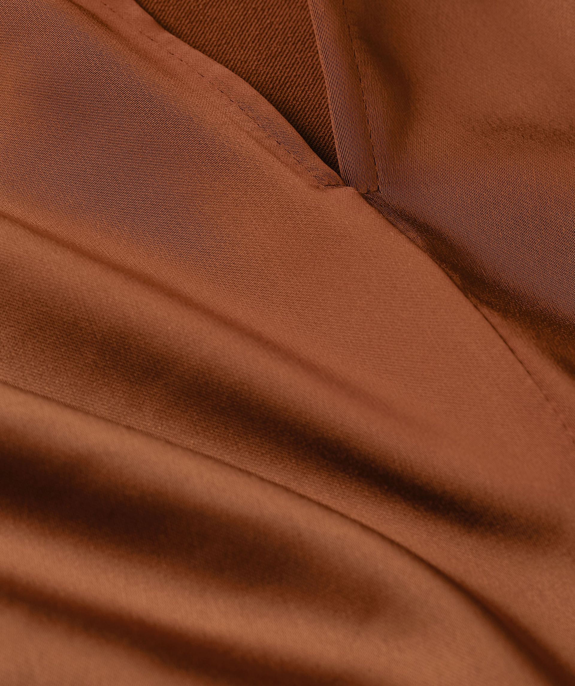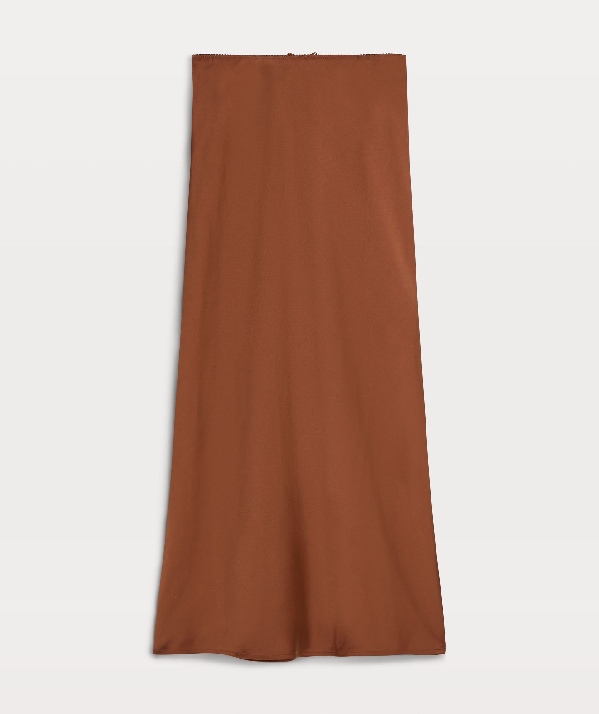 JOSH V Irenne feminino saia com cor Mocha Brown é uma elegante saia midi com um look satijn, as suas roupas são luxuosas e elegantes. A saia de cintura subida é feito de poliéster reciclado com um acabamento elegante. A faixa traseira elástica pode ter uma altura confortável e confortável. Dica de estilo: combinar midirok com um top e stijlvolle hakken para um look chique de draag de rok com um trui e ténis para um look casual.