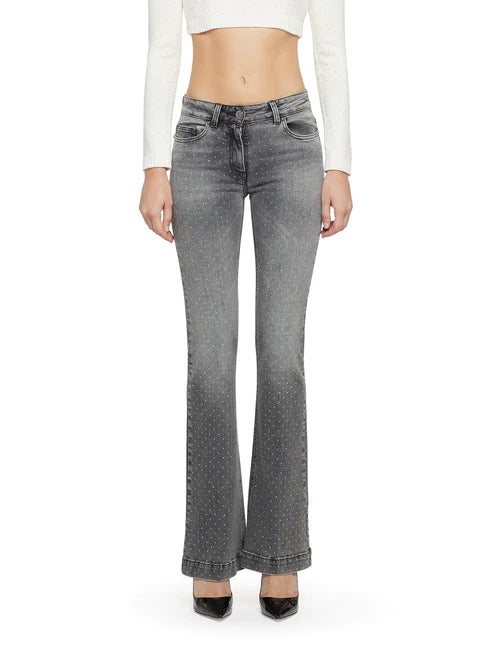 Jeans flare em lona elástica com aplicação de micro tachas.
