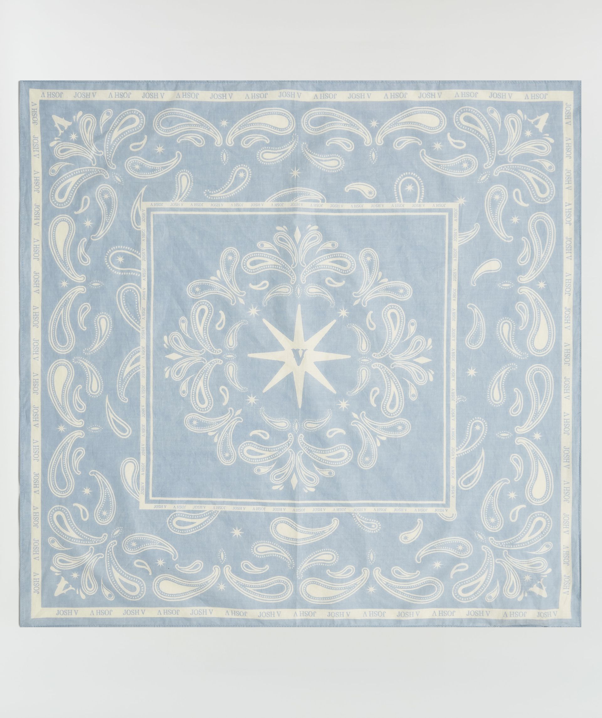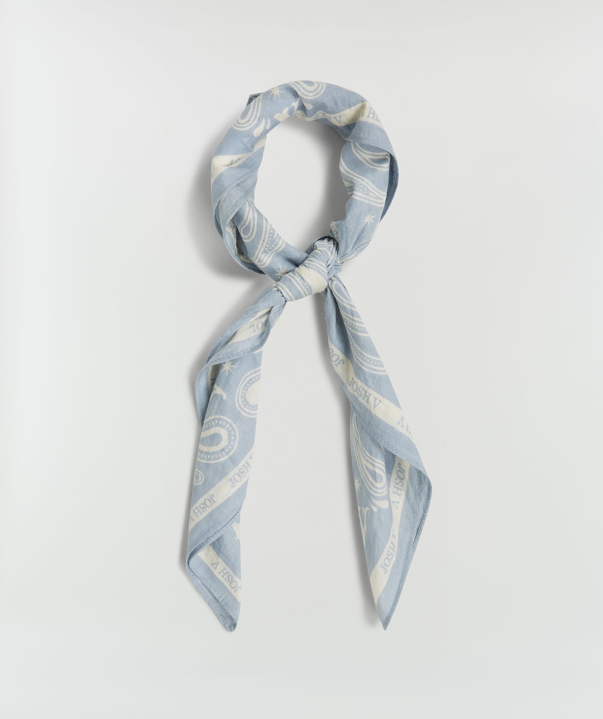 Complete o seu look JOSH V com o cachecol Marlie para mulher em azul celeste. Este cachecol é adornado com um padrão de arte JOSH V em tons sazonais de primavera. Use-o ao pescoço, no cabelo ou como um detalhe chique na sua mala.