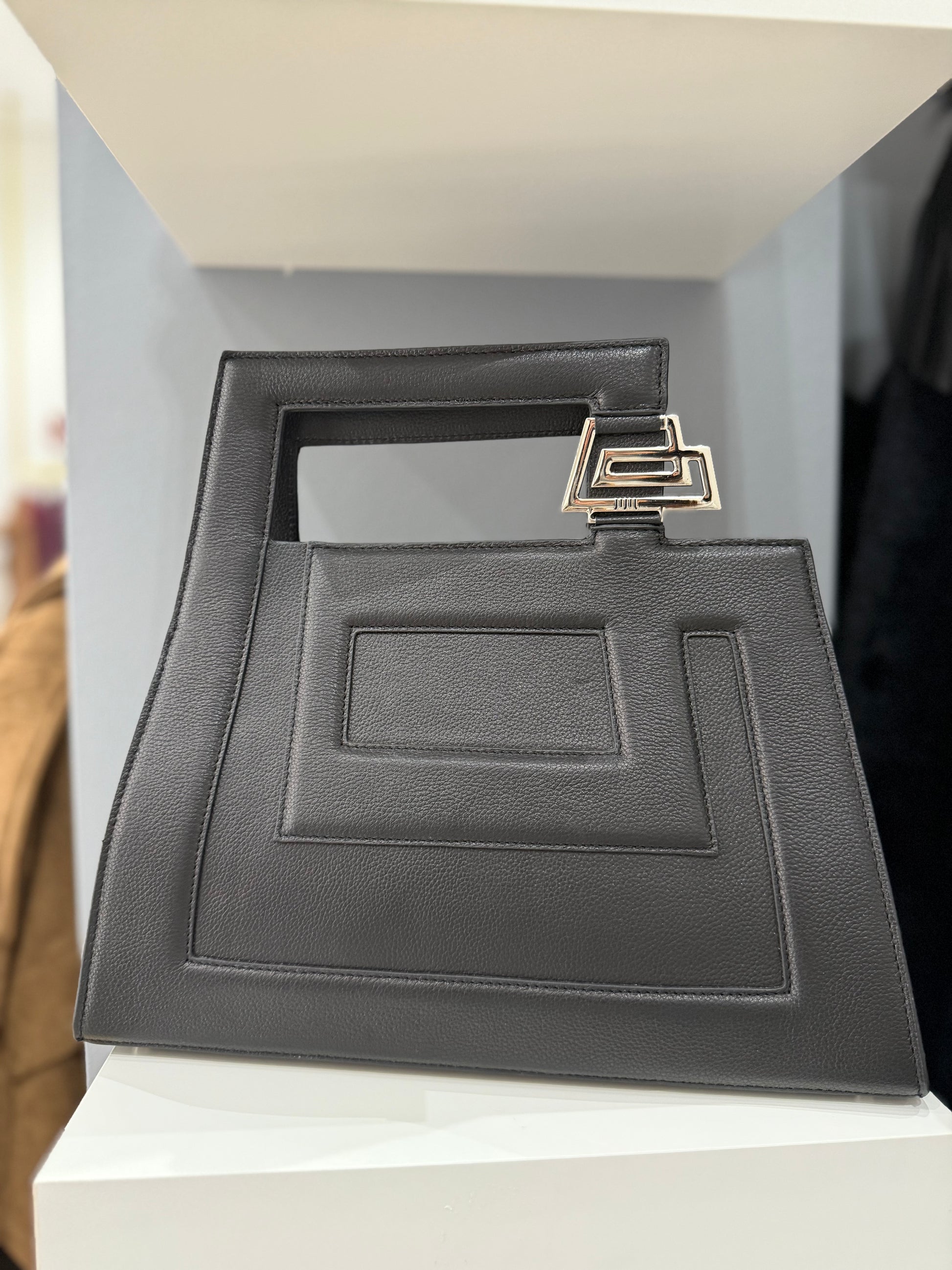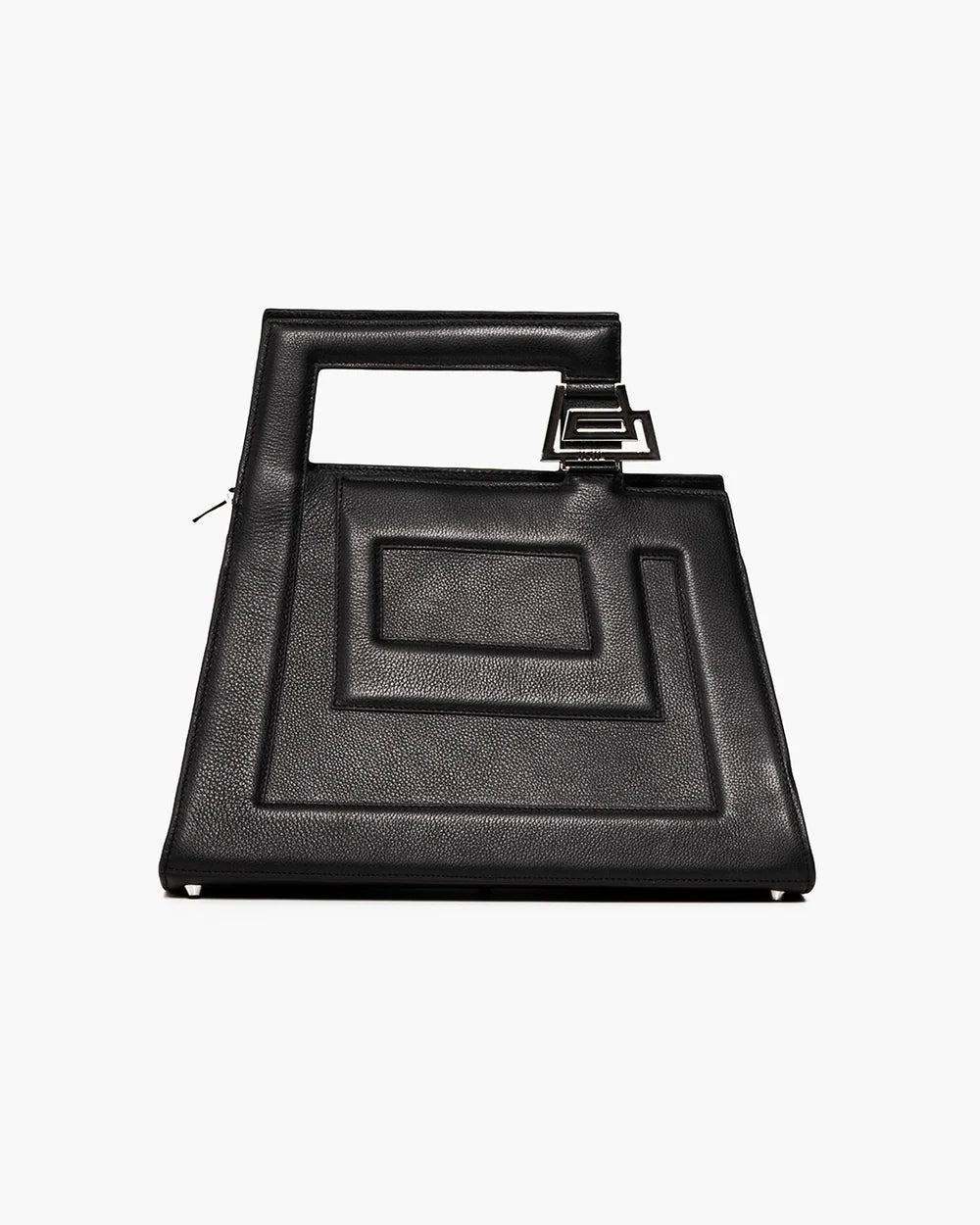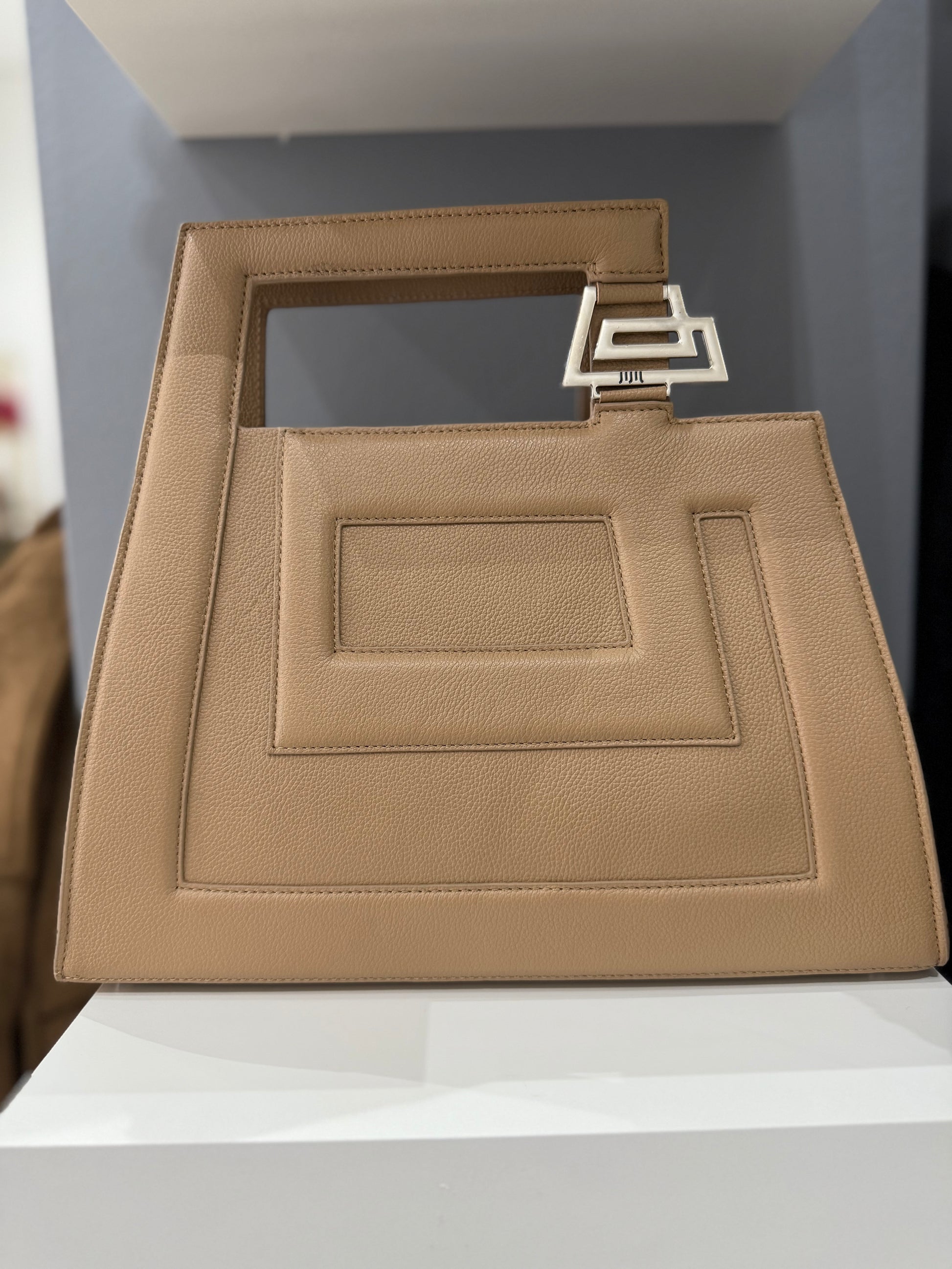 Mala estruturada da Jijil em pele de vitelo com textura martelada, super macia ao toque. Design geométrico com bombado que recria o gráfico icónico do logo da marca. Possui dupla asa, fecho em zip e detalhes metálicos prateados para um toque sofisticado. Inclui alça de ombro em pele para maior versatilidade.