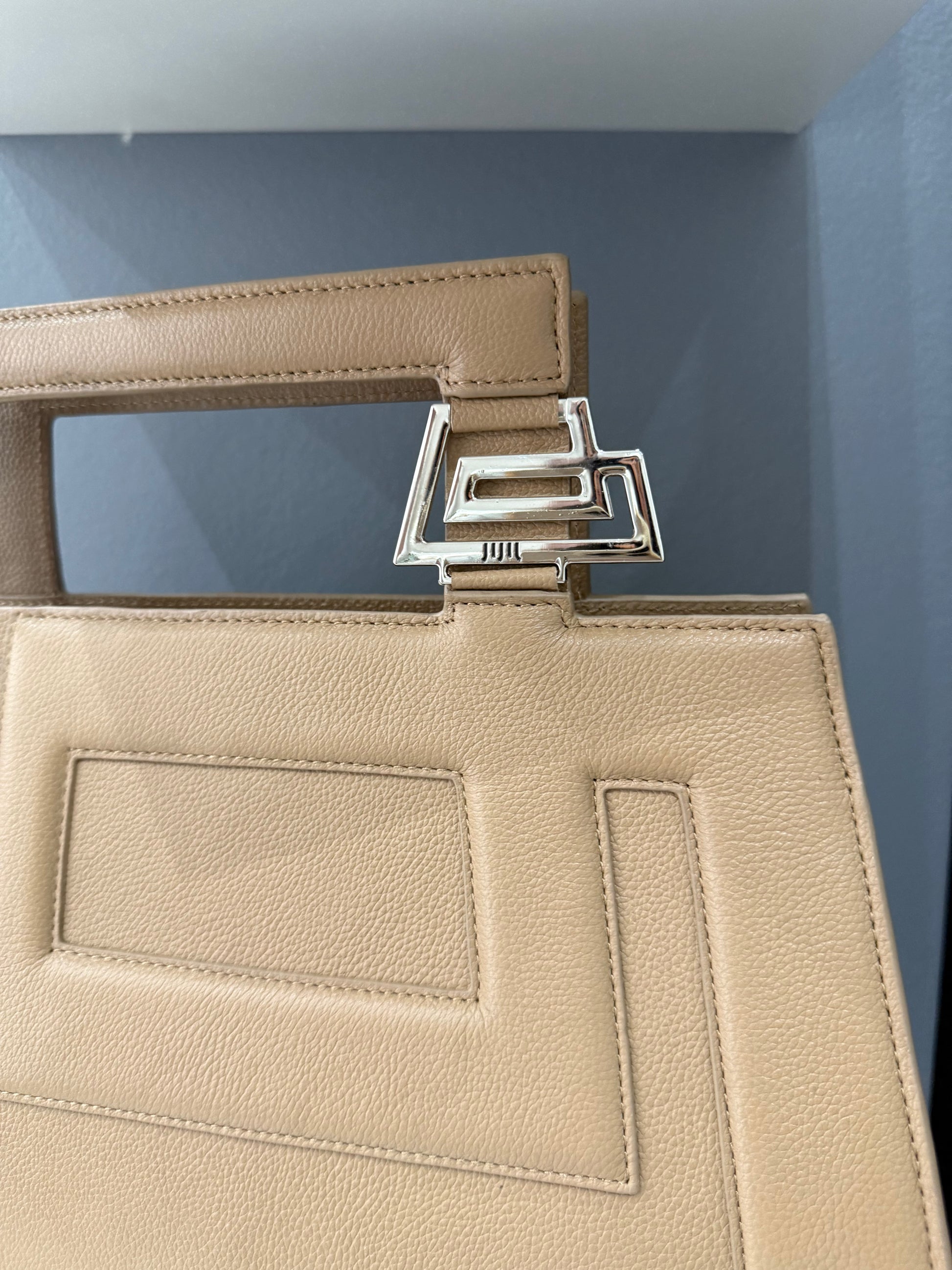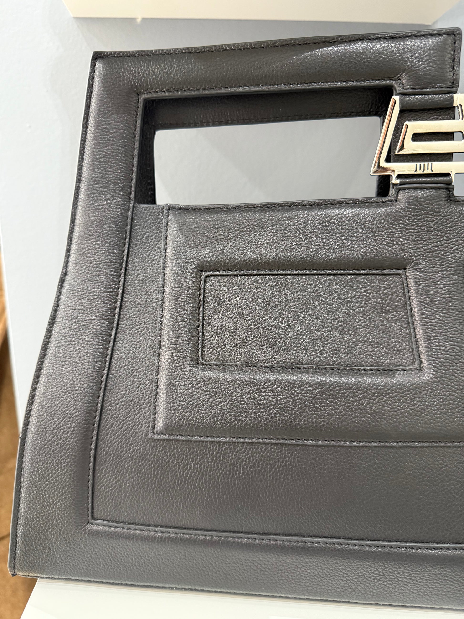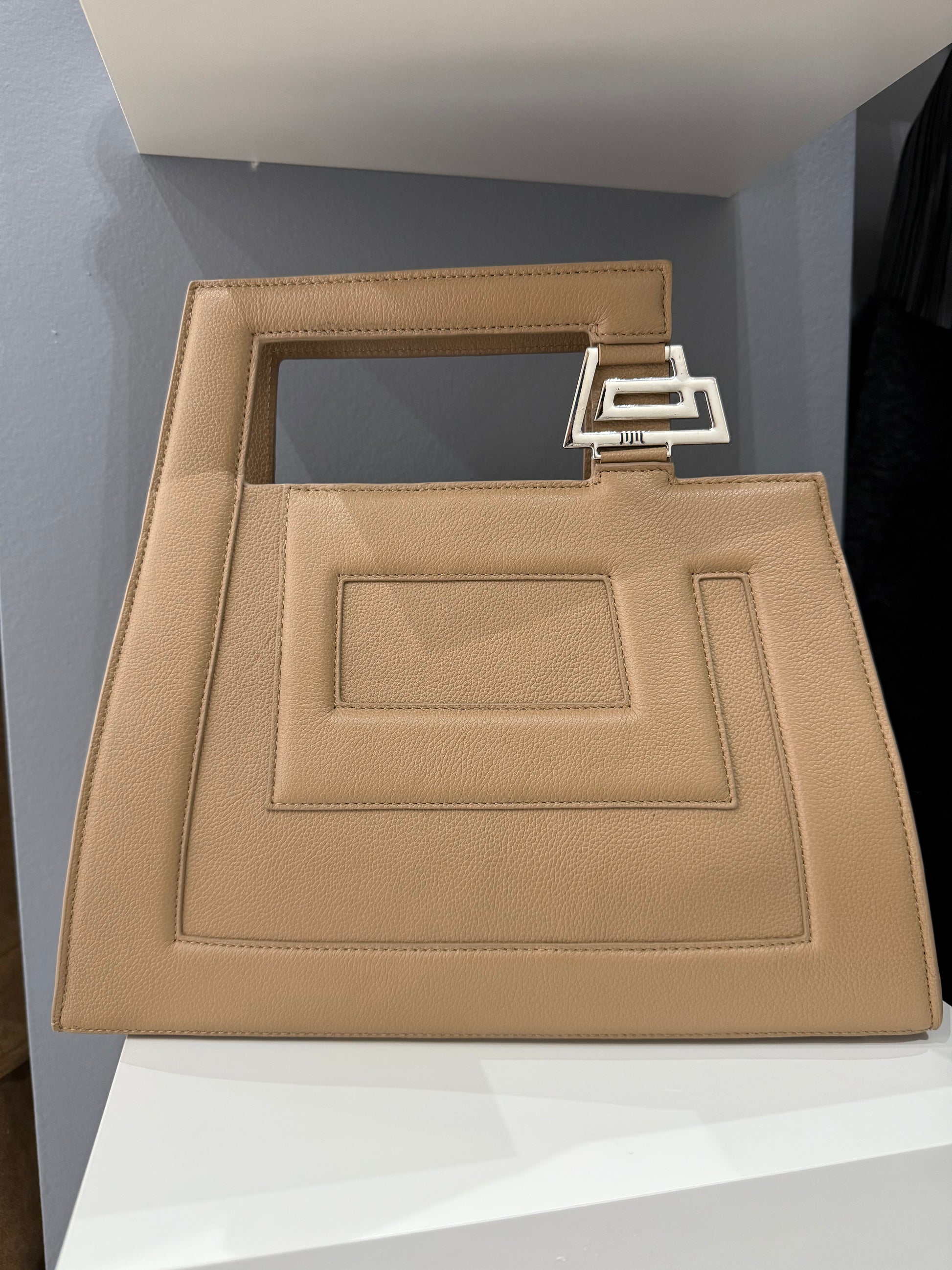 Mala estruturada da Jijil em pele de vitelo com textura martelada, super macia ao toque. Design geométrico com bombado que recria o gráfico icónico do logo da marca. Possui dupla asa, fecho em zip e detalhes metálicos prateados para um toque sofisticado. Inclui alça de ombro em pele para maior versatilidade.