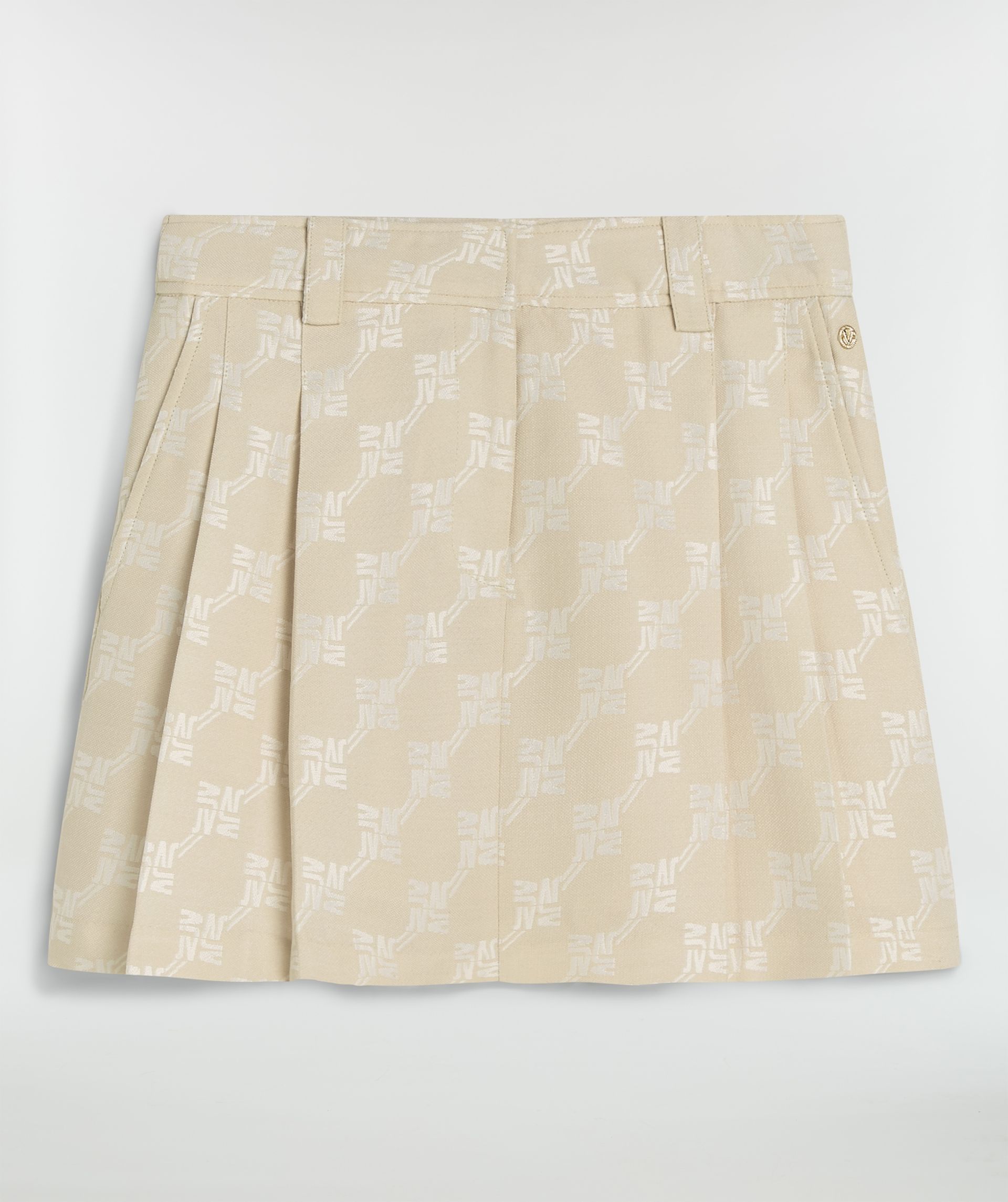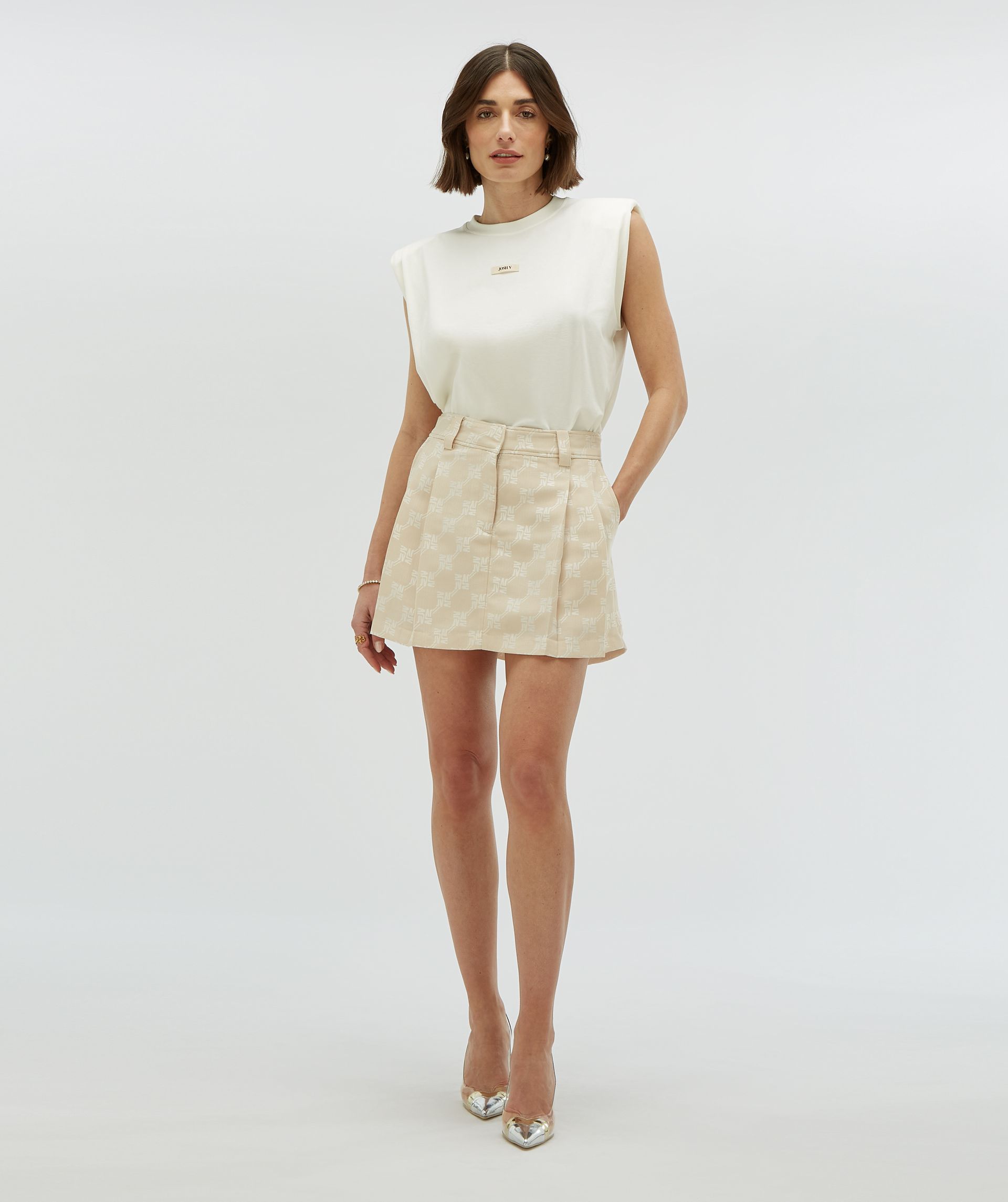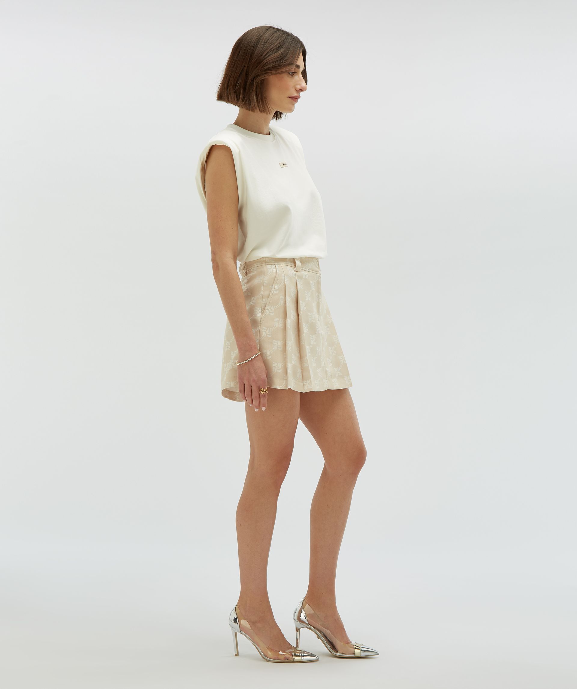 A saia feminina JOSH V Nena em Ecru é feita de poliéster reciclado com um padrão de logotipo de tecido jacquard. Uma característica única é o detalhe da fivela na parte de trás, permitindo que você ajuste a cintura. Além disso, a saia inclui shorts embutidos para maior conforto. Este mini skort com logotipo é perfeito para várias ocasiões. Combine-o com o blazer JOSH V Danea combinando para um conjunto de correspondência de destaque, ou estilize-o com um top e sandálias para um visual casual de verão.