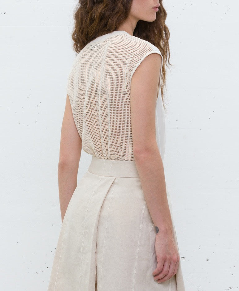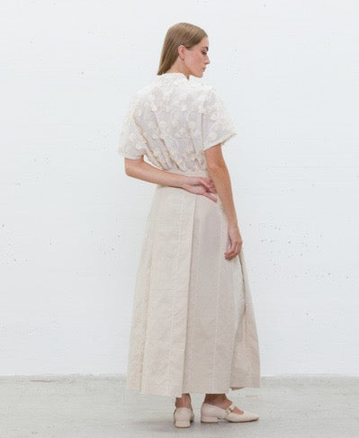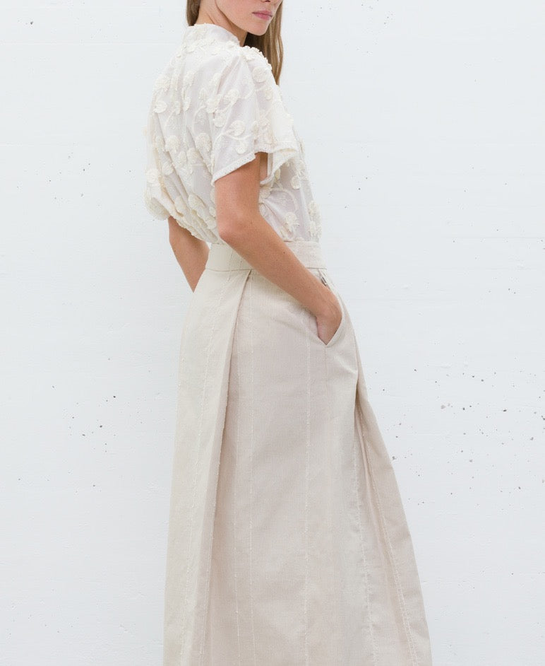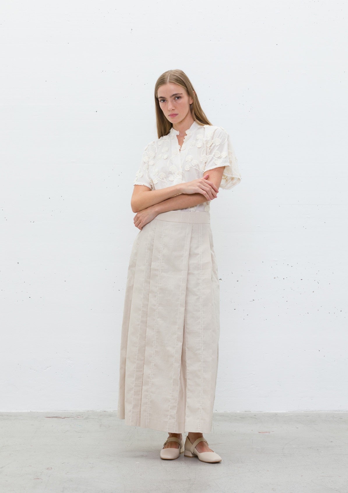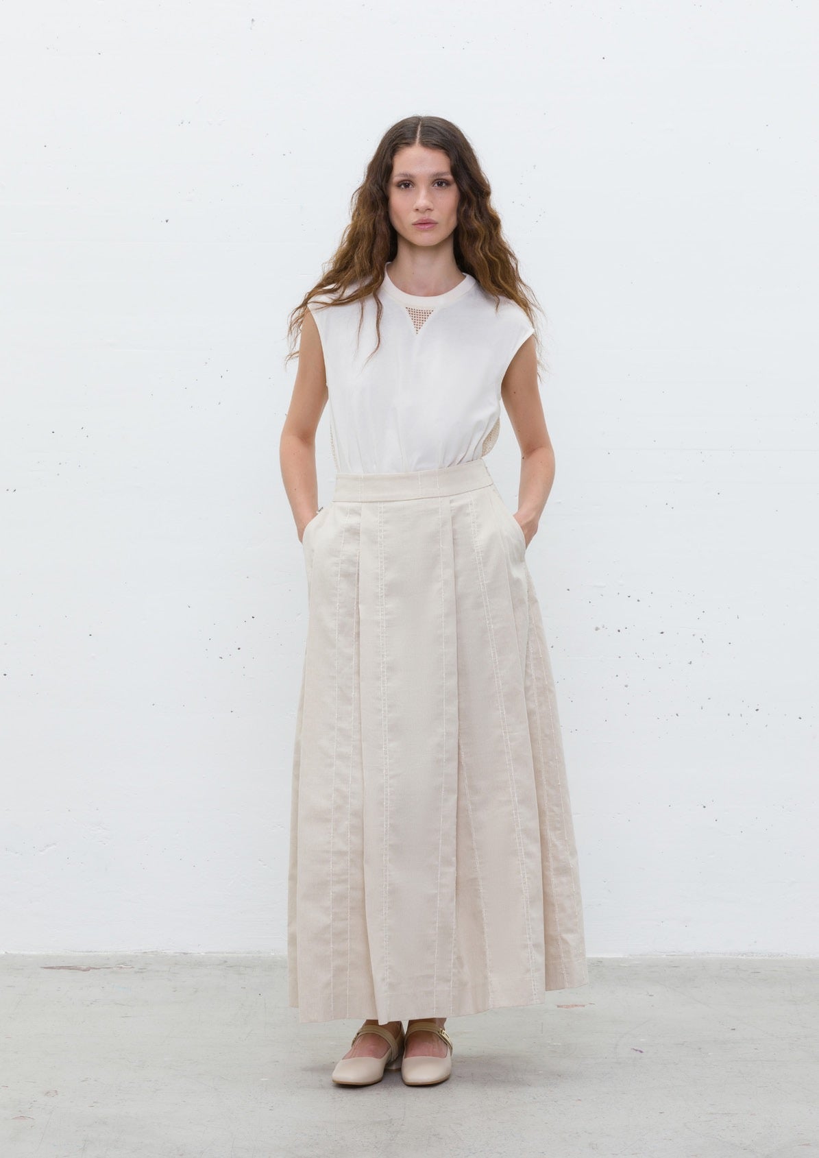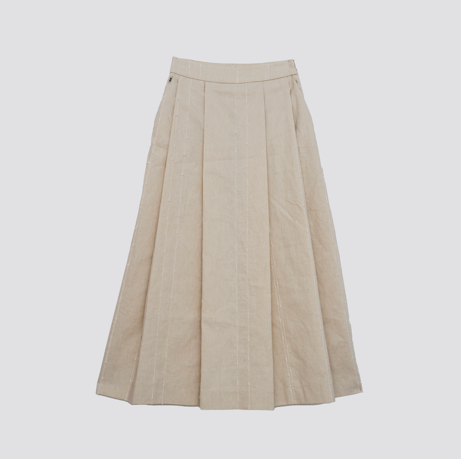 Saia comprida em tom bege natural, confecionada em linho com textura leve e confortável. O design apresenta pregas estruturadas que criam movimento elegante, com cintura média e fecho lateral discreto. Possui riscas verticais subtis que alongam a silhueta e adicionam um toque de sofisticação.