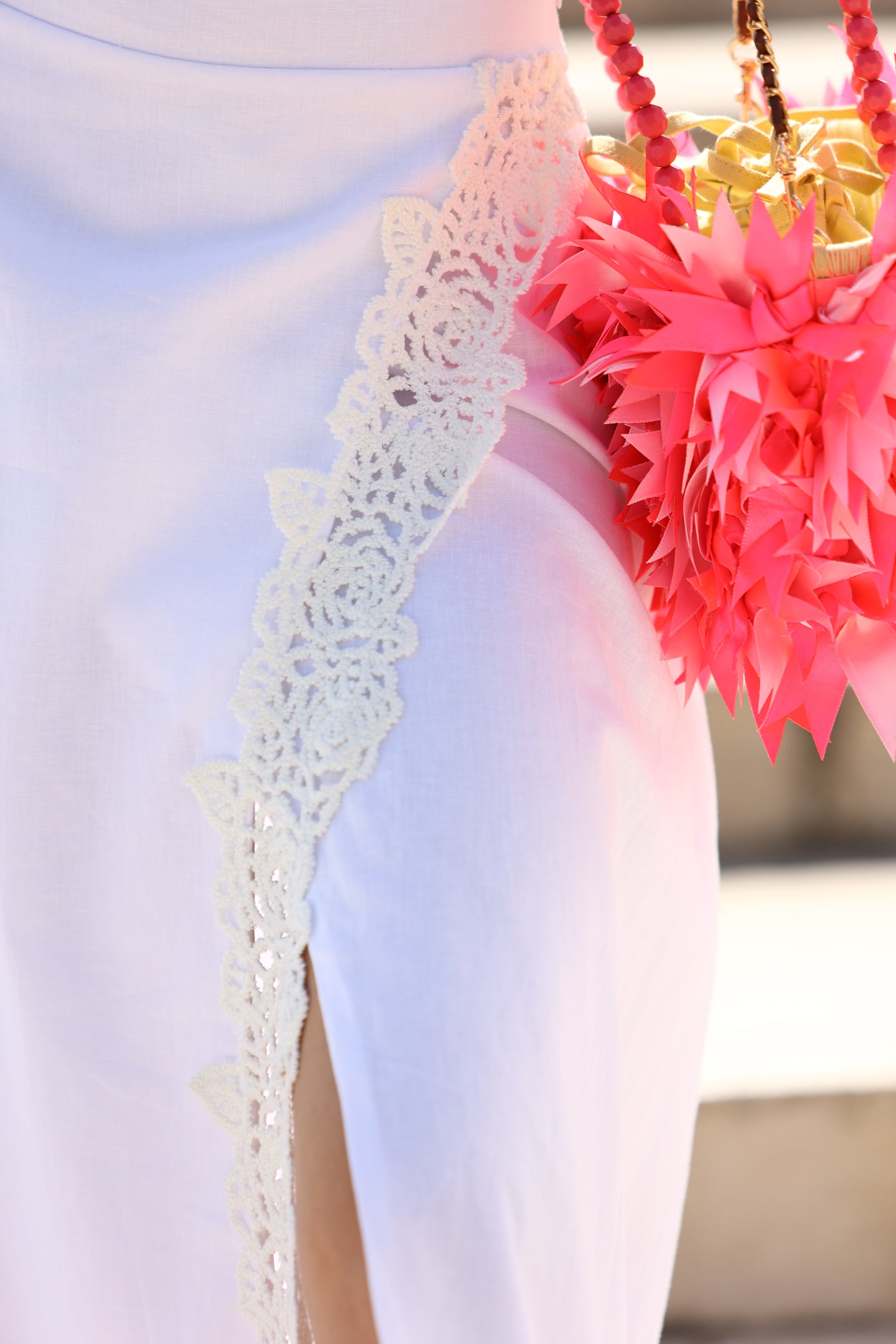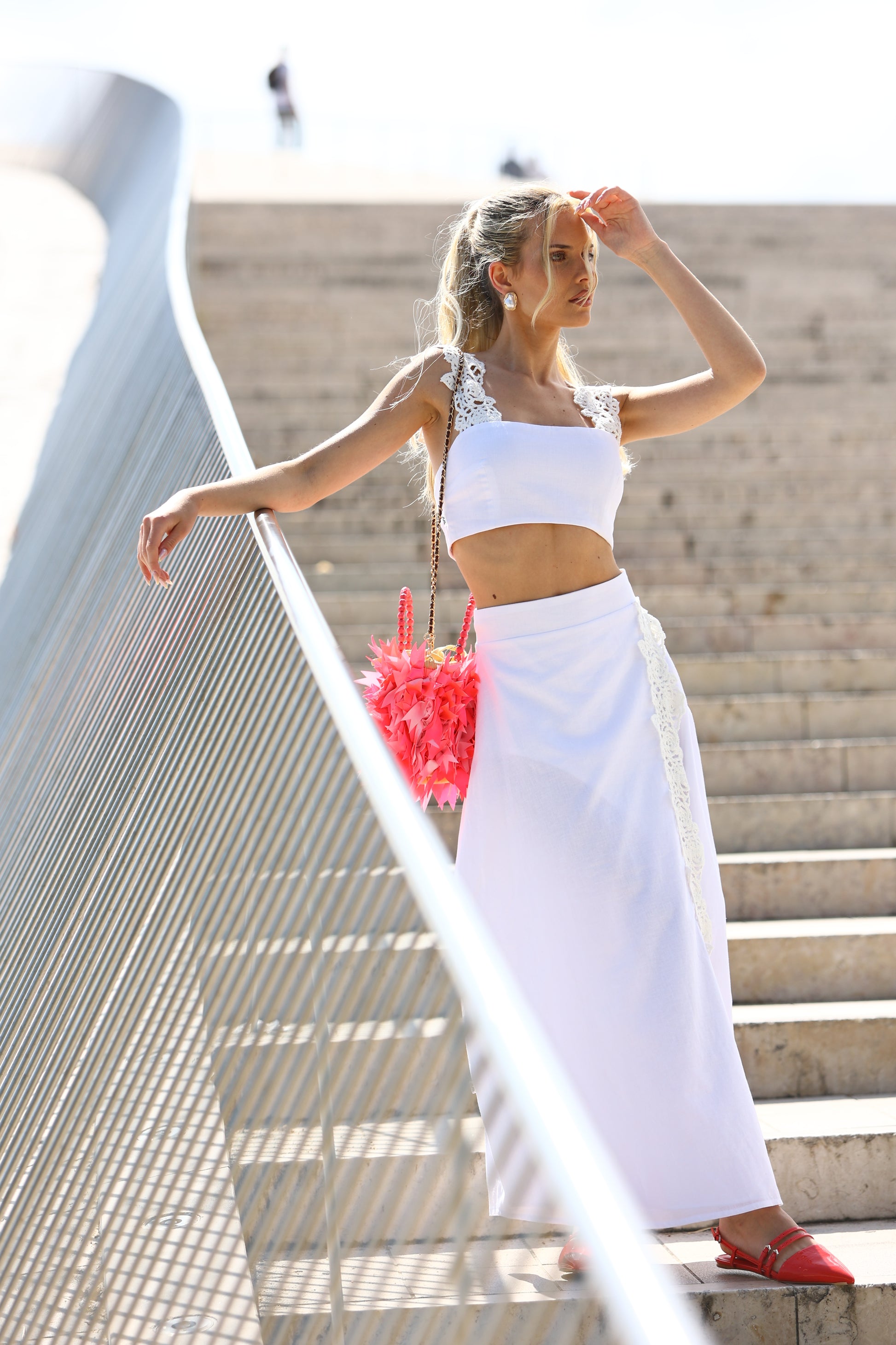 Saia midi de corte evasê com caimento fluido e delicado, adornada com uma elegante aplicação de renda floral em linha vertical na parte frontal. O design minimalista é elevado pelo toque artesanal da renda, proporcionando charme e sofisticação à peça.
