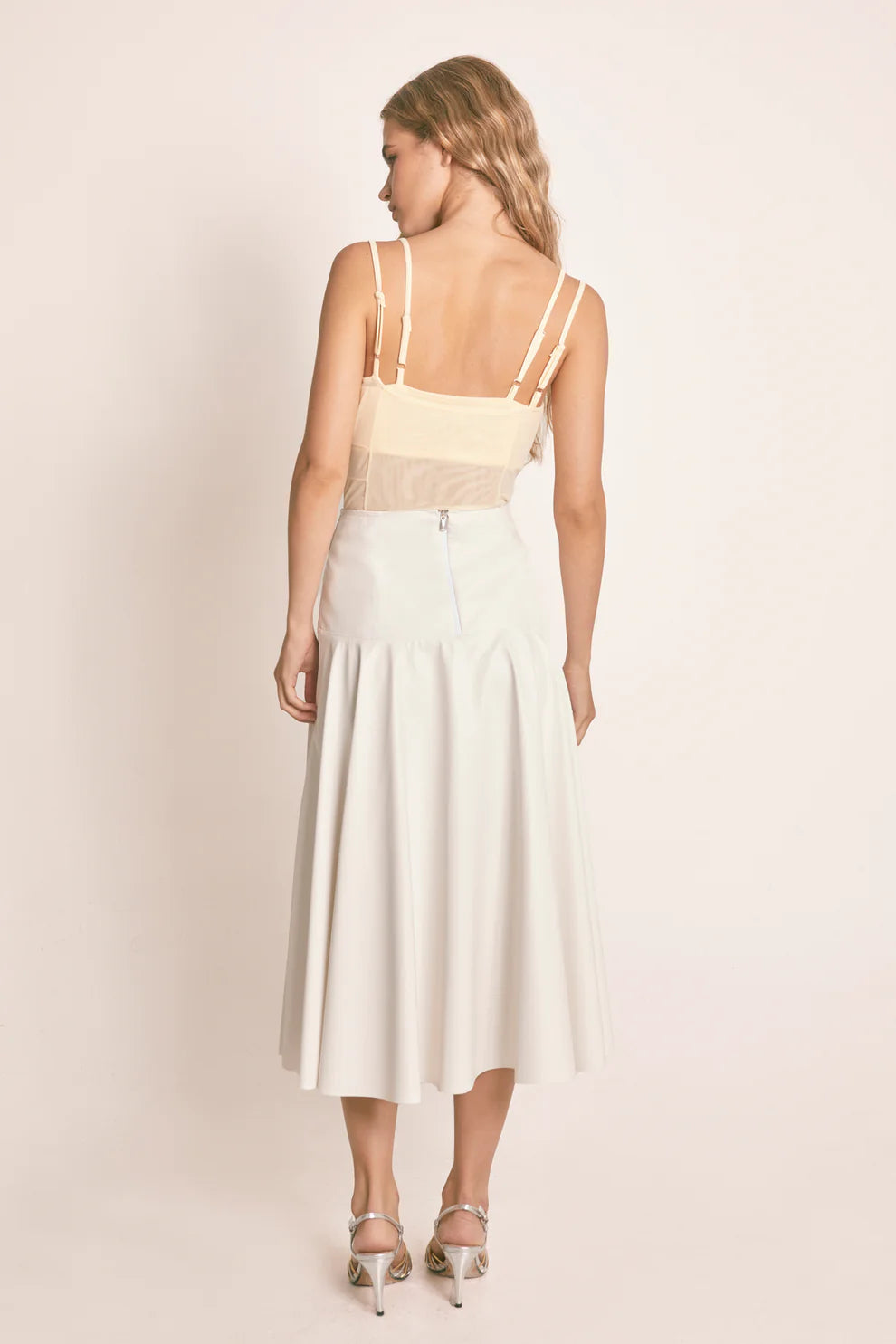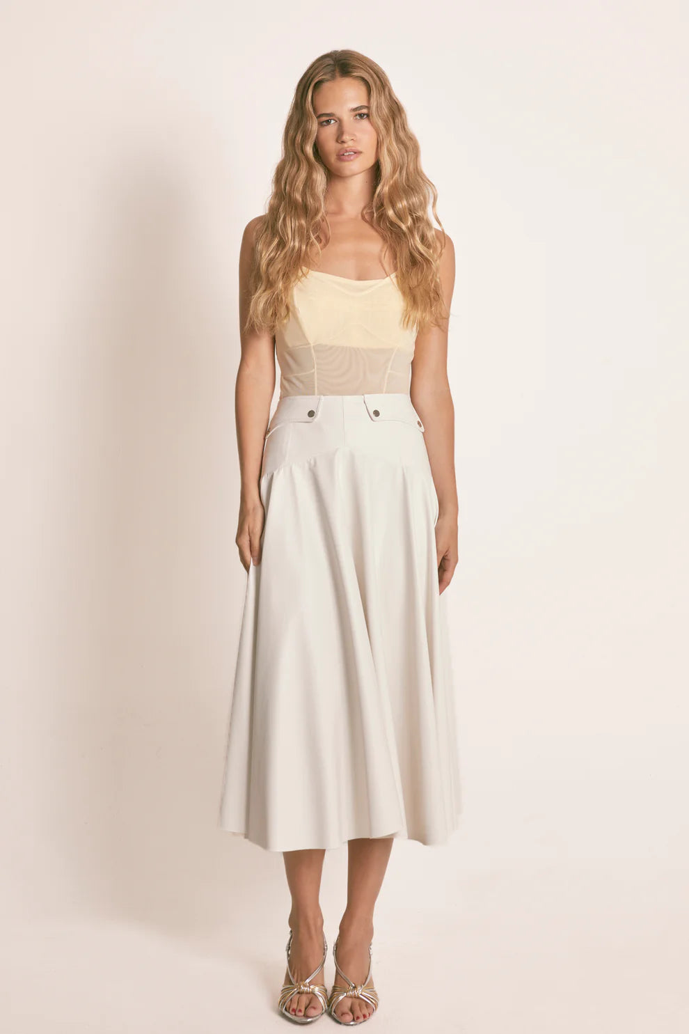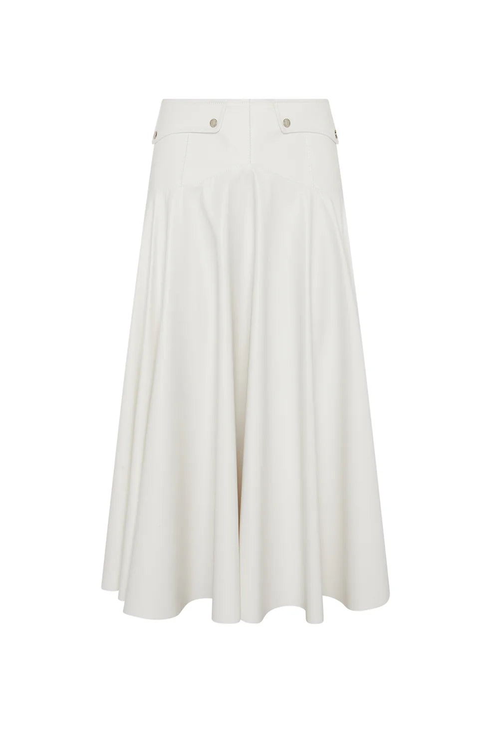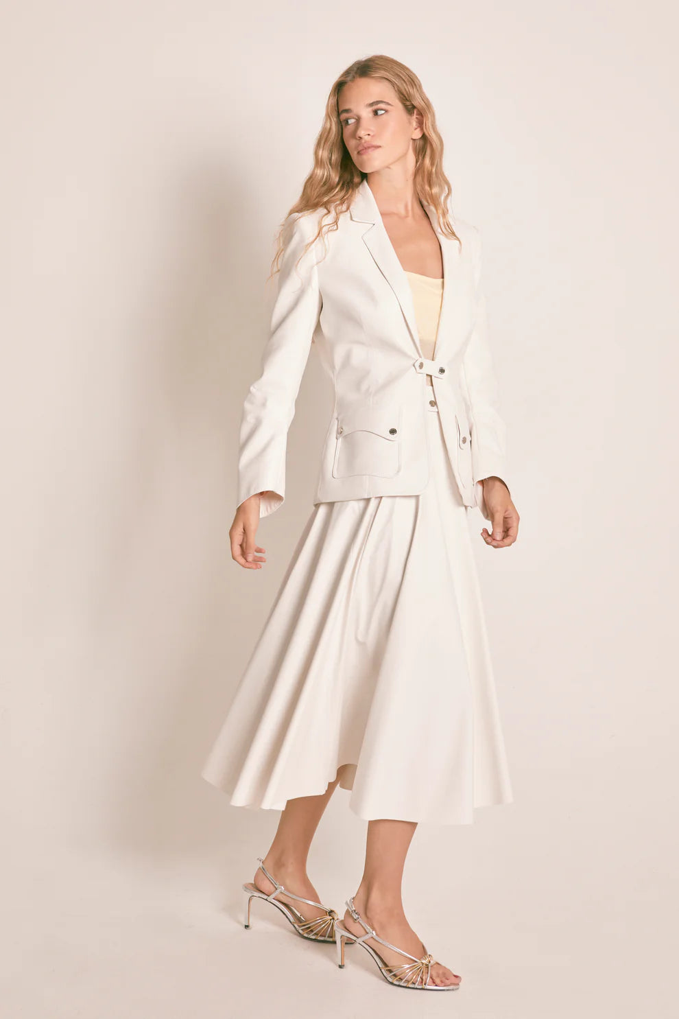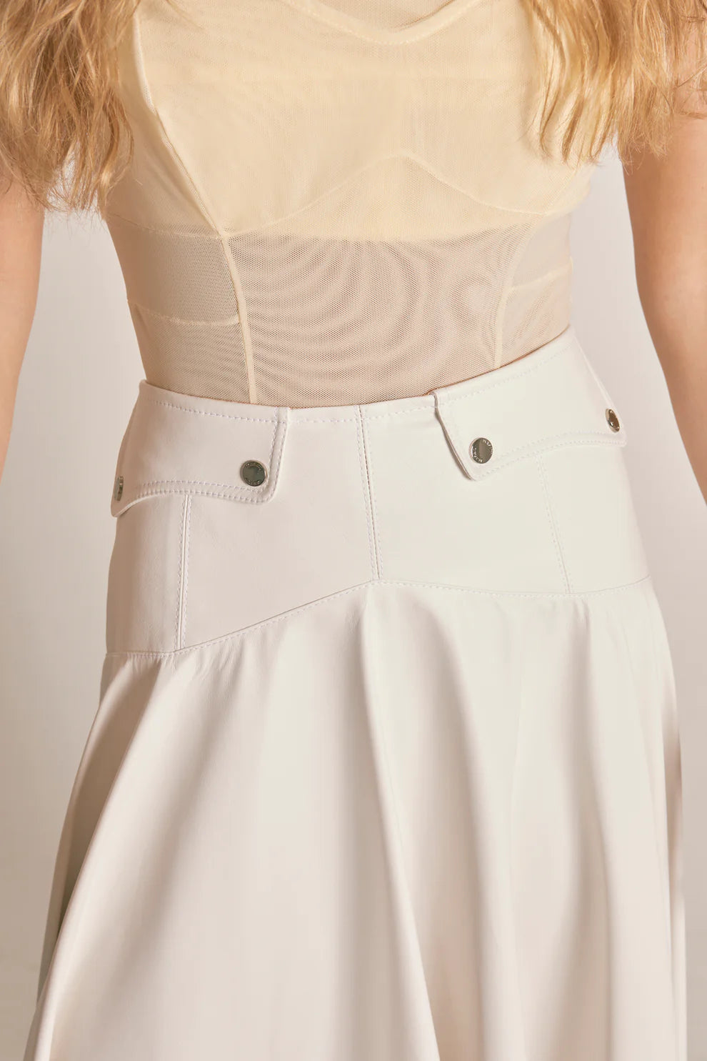 Saia midi de cintura média com detalhes de costura que realçam a silhueta. Inclui bolsos decorativos na parte superior com botões metálicos que adicionam um toque moderno e sofisticado. Sua queda fluida e sua cor branca pura a tornam uma peça versátil, perfeita para ocasiões formais ou para elevar seus looks casuais.