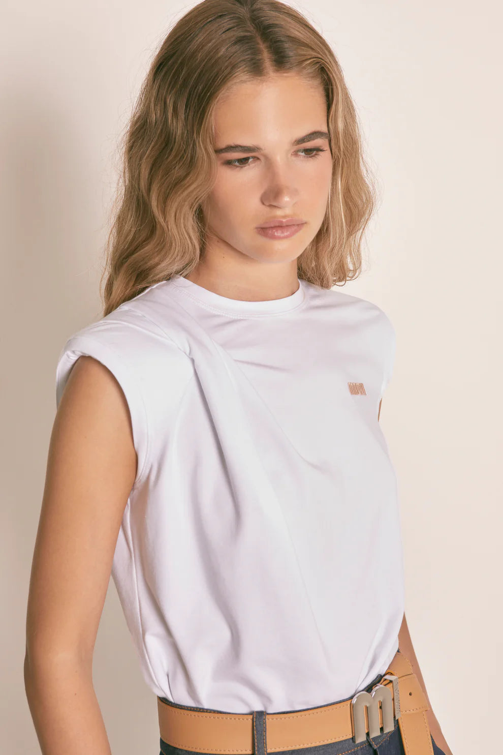 Esta t-shirt branca sem mangas é um básico essencial com um toque de classe. Confeccionada em tecido macio e respirável, oferece conforto e frescor para o uso diário. Seu design minimalista é realçado com delicados bordados no peito que agregam personalidade e estilo. Ombreiras sutis adicionam estrutura, enquanto o corte reto garante um ajuste perfeito para todos os tipos de corpo.