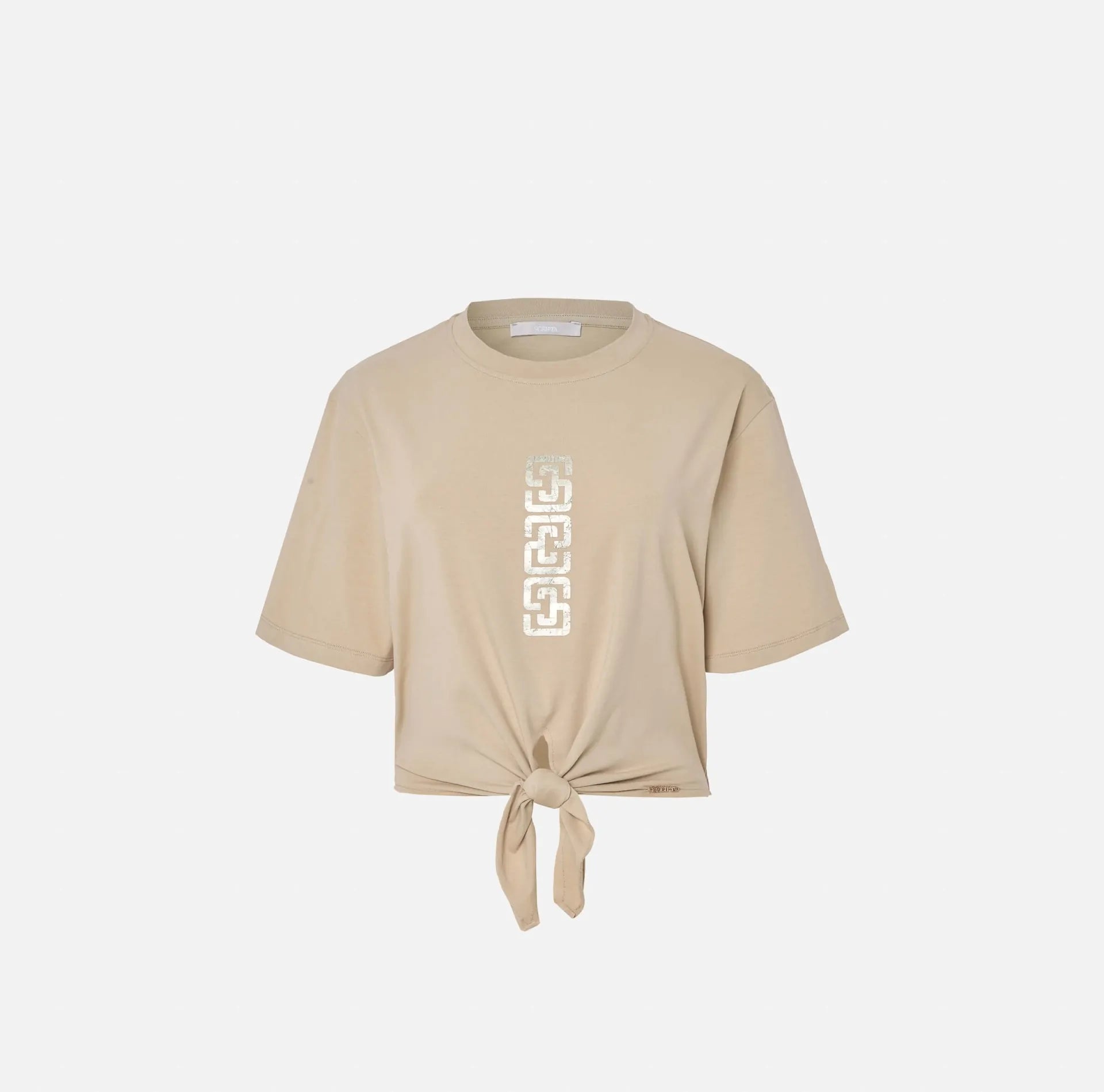 Camisola com decote redondo e ombros descaídos. Detalhe de estampado localizado na frente e efeito nó no fundo. Pormenor de corte em fio no bainha da peça . O fitting é solto