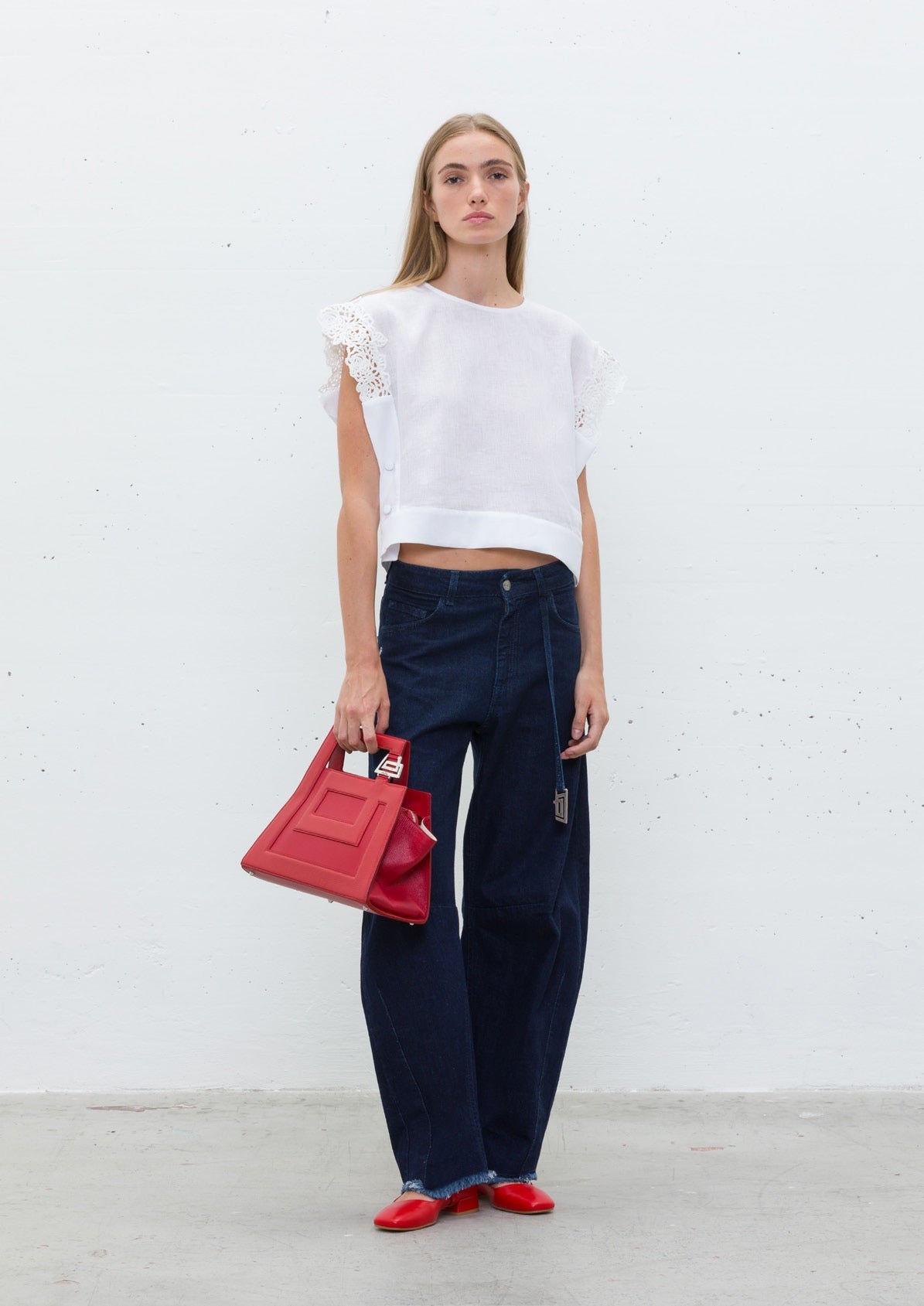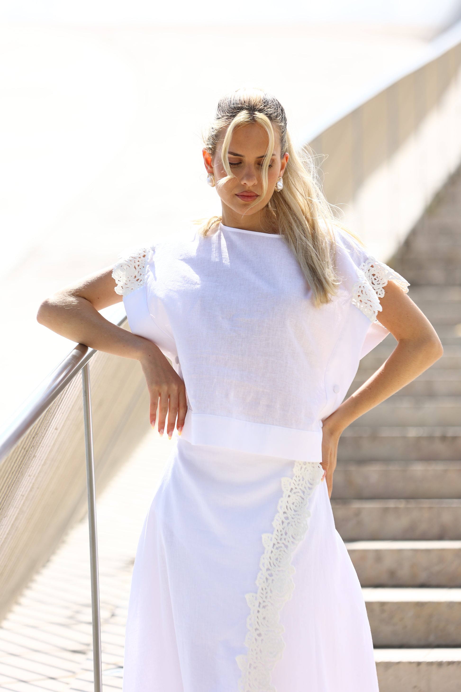 Top delicado sem mangas, com detalhe em renda floral nas alças e botões decorativos laterais. A modelagem reta com acabamento sofisticado e o toque artesanal da renda criam um visual romântico e elegante — ideal para composições frescas e femininas durante os dias mais quentes.