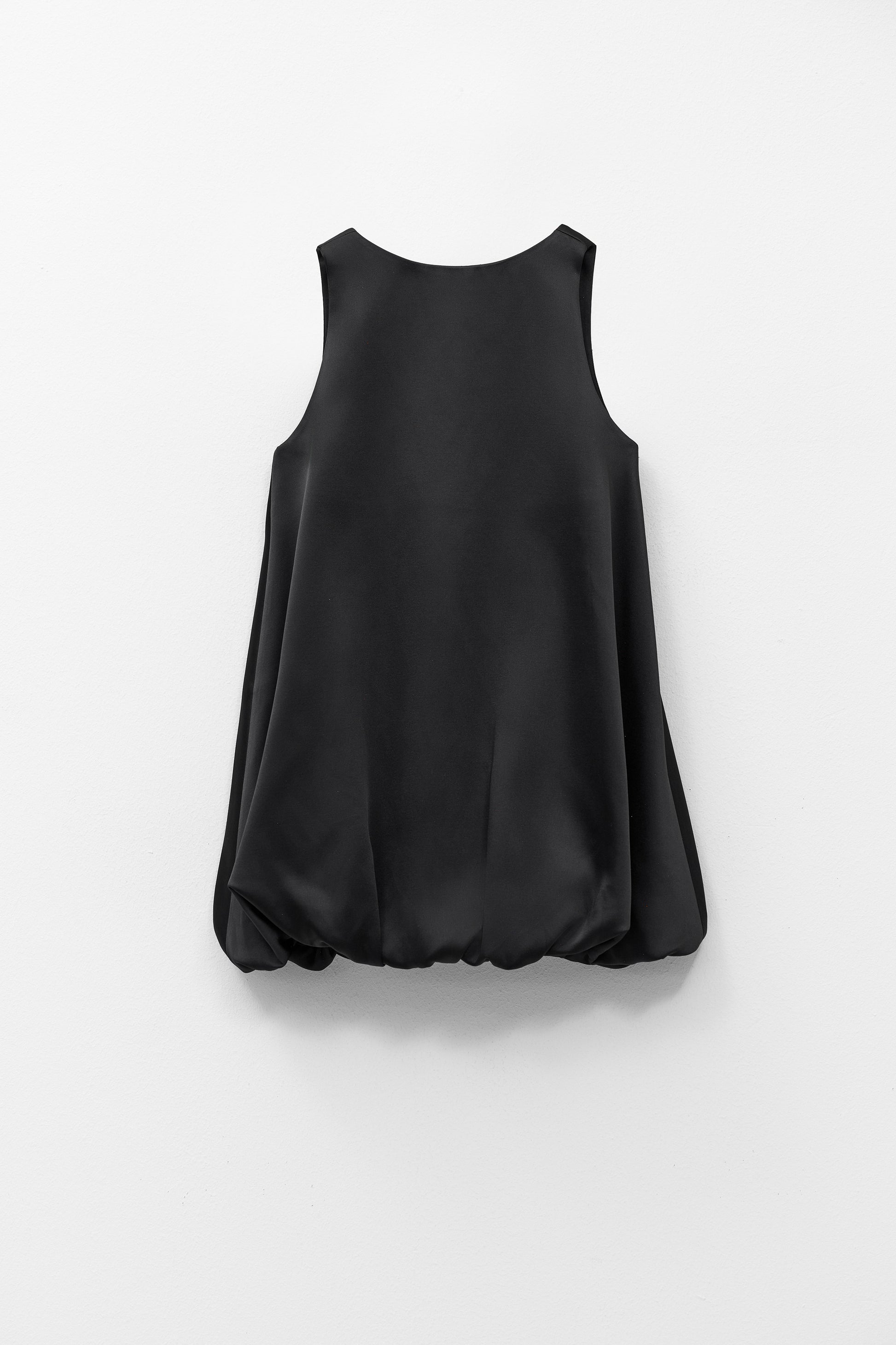 Vestido curto de corte amplo com silhueta balão que cria volume elegante e contemporâneo. O design sem mangas e o decote redondo conferem um visual clean e sofisticado, ideal para produções modernas com personalidade.