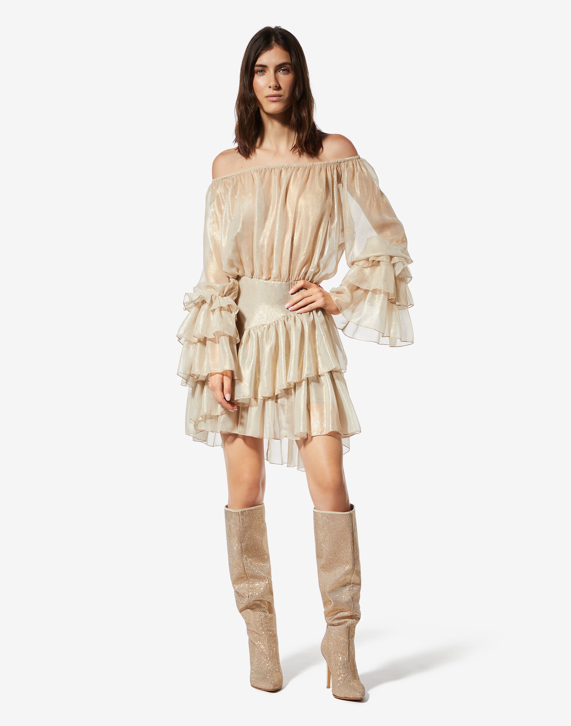 Vestido com ombros descaídos e tecido transparente