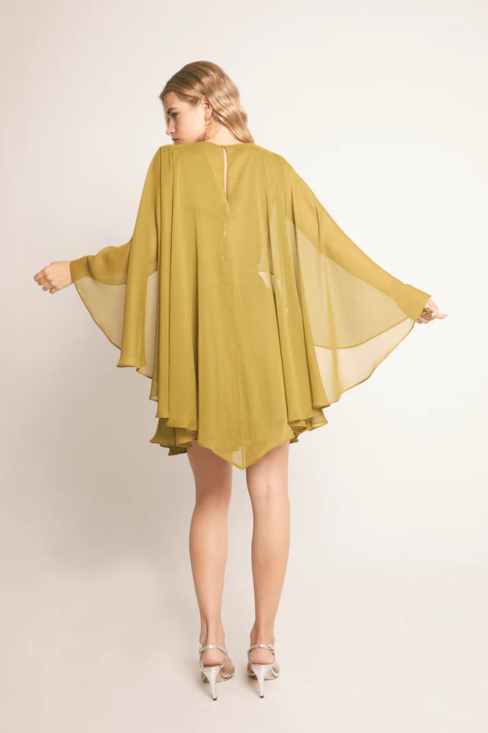 Vestido curto confeccionado em bambula, tem um design plissado na parte superior que proporciona movimento e elegância. Seu decote profundo em forma de V realça o busto, enquanto os delicados drapeados nos ombros e na cintura criam uma silhueta lisonjeira. As mangas com efeito de camada e sua saia fluida adicionam um toque etéreo, alcançando um equilíbrio entre sensualidade e requinte. O design inclui aberturas laterais sutis que estilizam a figura e trazem um detalhe inesperado.