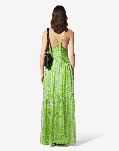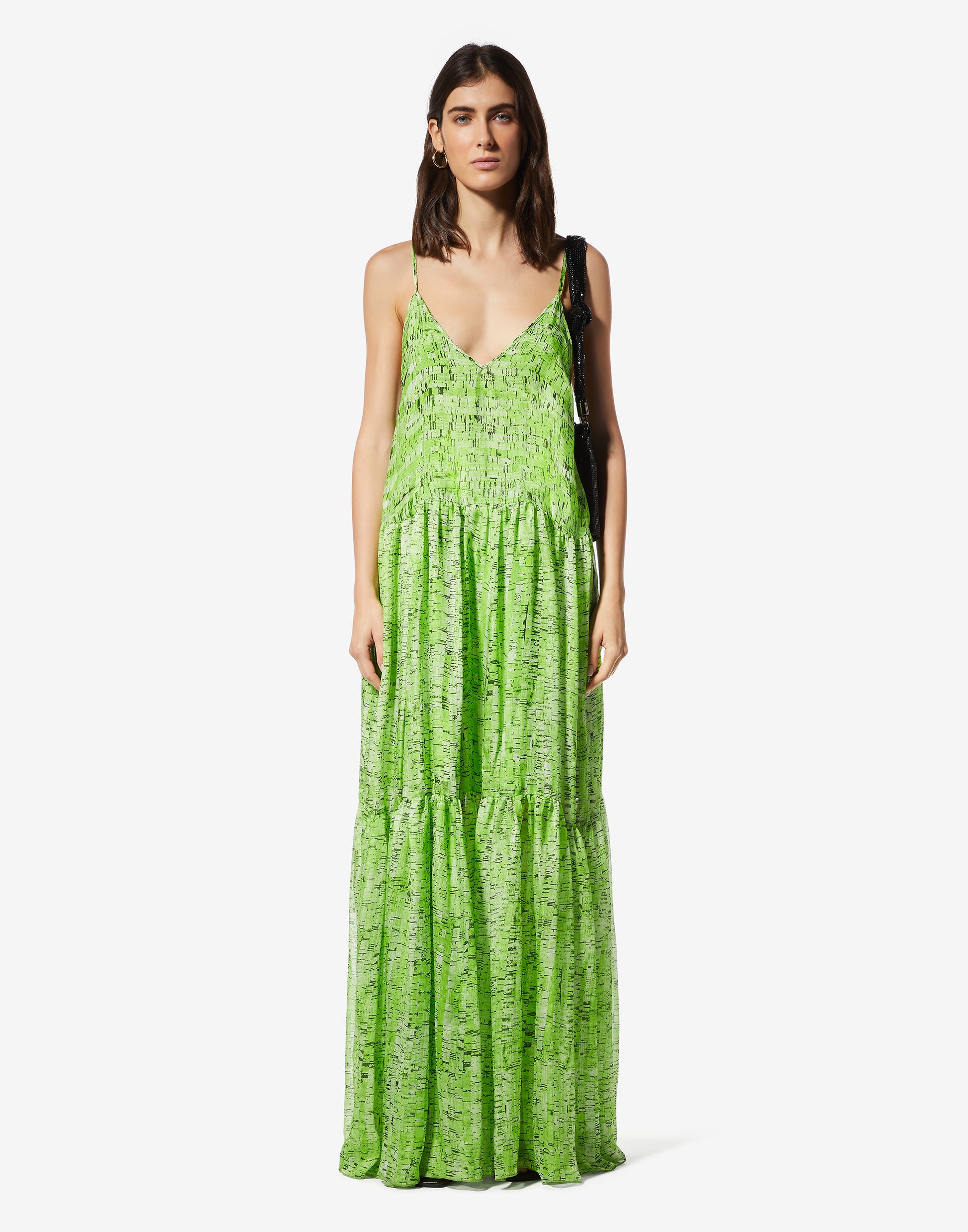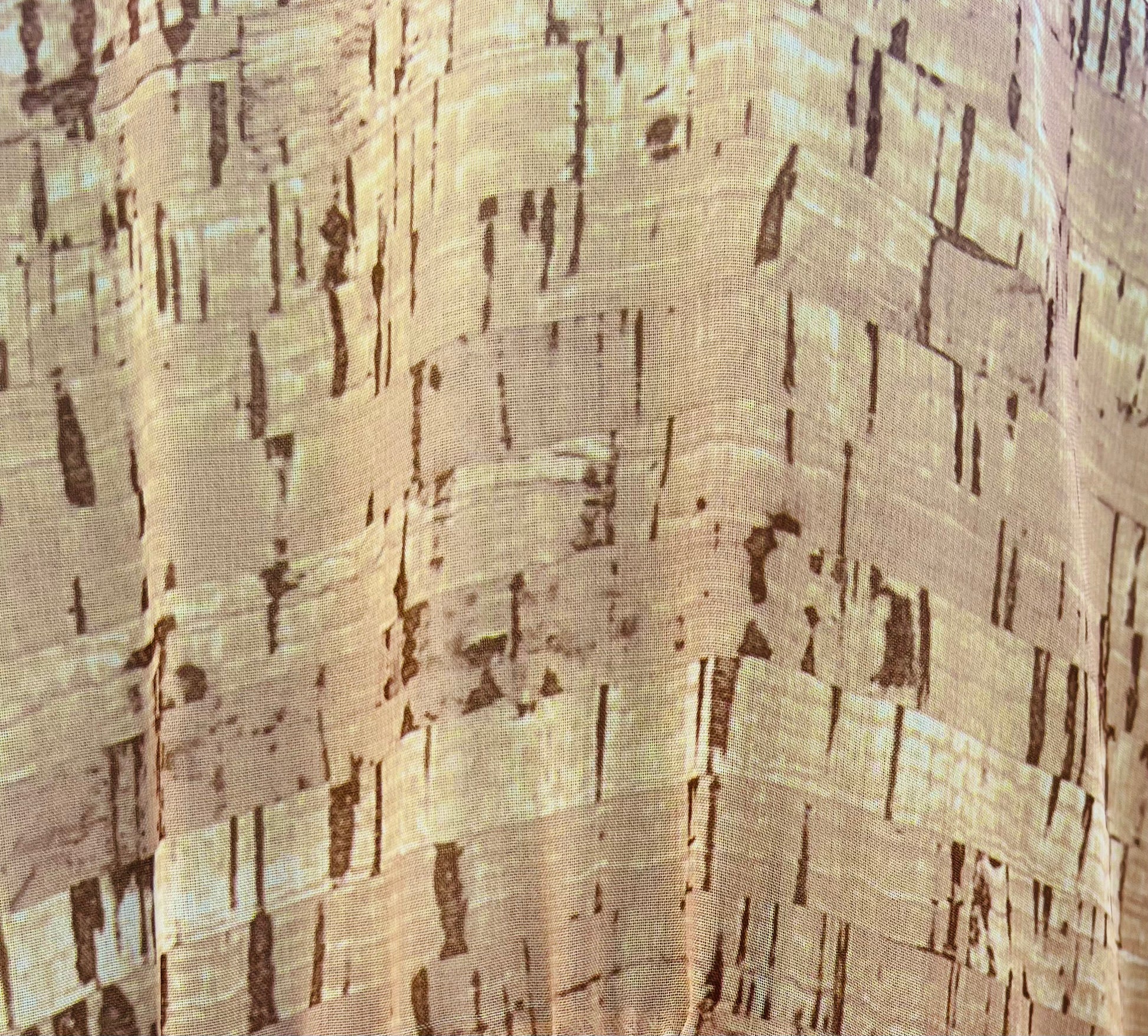 Vestido em tecido esvoaçante com estampado a imitar cortiça. Disponível em duas cores: kiwi e cortiça